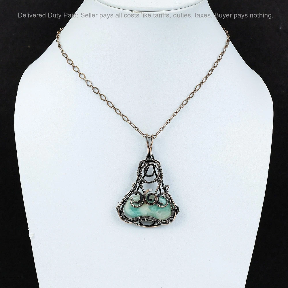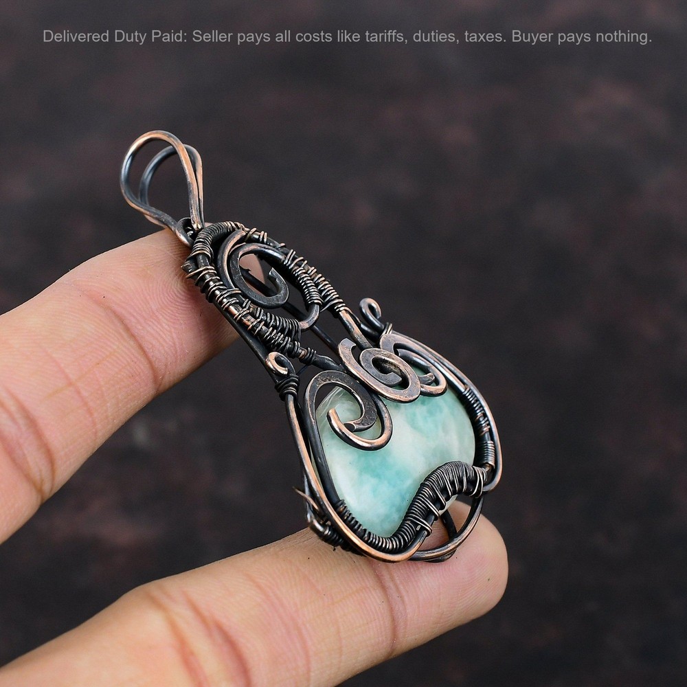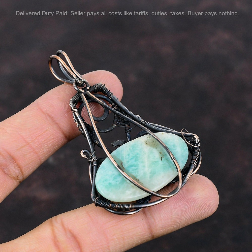 Note : Due to the natural formation of this gemstone. Slight variation in design and color are to be expected. Welcome to Silver Creation Christmas Sale Copper Oval Natural Amazonite Sister Wire Wrapped Pendant Jewelry Handmade Pendant, Wire Wrapped Pendant, Wire Wrapped Jewelry, Copper Pendant, Copper Wire Pendant, Wrapped Jewelry, Wire Wrap Pendant, Wire Wrap Jewelry SKU : VFWP-3263 Stone Shape : Oval Metal Purity : Unknown Copper Length : 68 Millimeters Width : 47 Millimeters Copper has been used for jewelry making for thousands of years, dating back to ancient civilizations such as the Egyptians, Romans, and Aztecs. Copper was valued for its beauty, versatility, and durability, and was often used to make everything from jewelry and coins to cookware and tools. In addition to its historical significance, copper jewelry also offers several benefits. Copper is a natural conductor of heat and electricity, which makes it ideal for energy healing and therapeutic purposes. Wearing copper jewelry is believed to have various health benefits, such as improving circulation, reducing inflammation, and boosting the immune system. Some people also believe that copper jewelry has the ability to balance energy and improve mood. For Mother's Day Gift For Father's Day Gift For Promise For Valentine' Day For Halloween Party For Christmas Day Gift For New Year Party For Mom For Her If you can't find the information you need or need some advice for your design? Feel free to contact us. We are fast to reply :) All our work is made by hand with Love and Care in our workshop Thank you so much for visiting and hope you enjoy shopping with us Silvercreations is committed to delivering the best quality sterling silver jewelry to customers. As a handmade jewelry manufacturer, we offer an extensive selection of copper gemstone jewelry that showcases the brilliance of our craftsmanship. We are an experienced handmade jewelry supplier with expertise in embellishing gemstones to suit every style. We offer you the liberty to create your jewelry ensemble with sparkling, earthy, and pure gemstones. Our Talented artisans masterfully handcraft each piece of jewelry you see here. Our pieces are made with genuine gemstones.