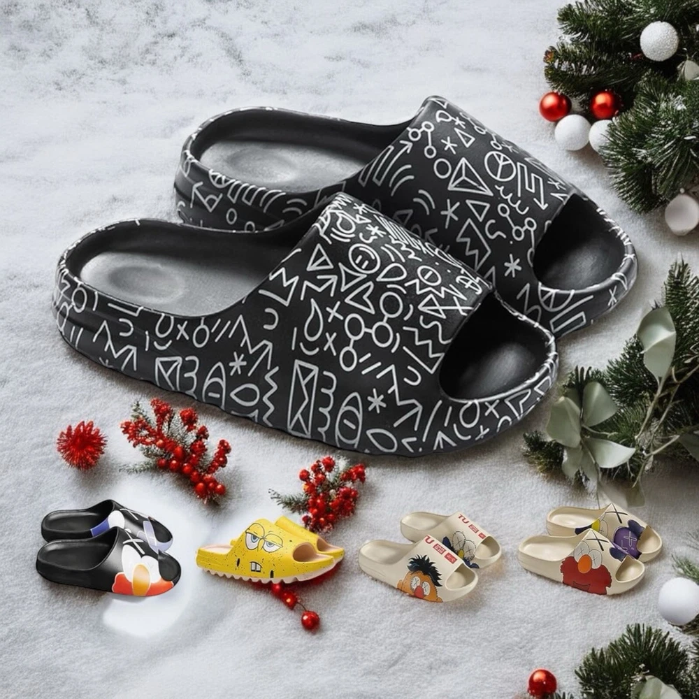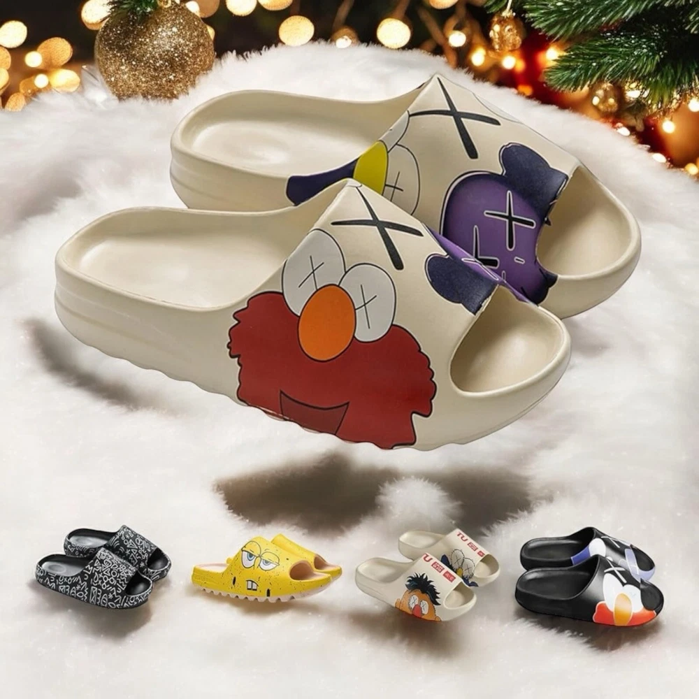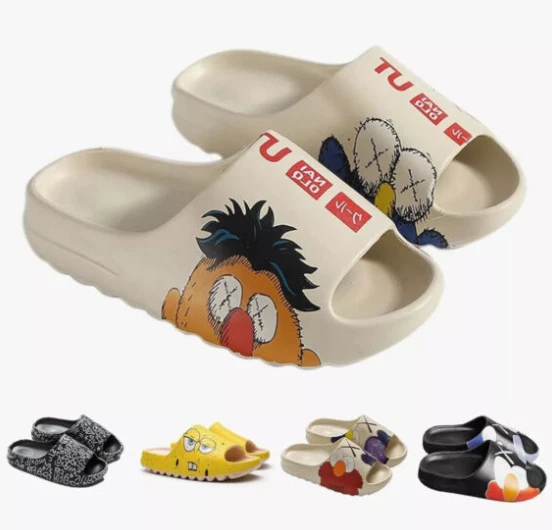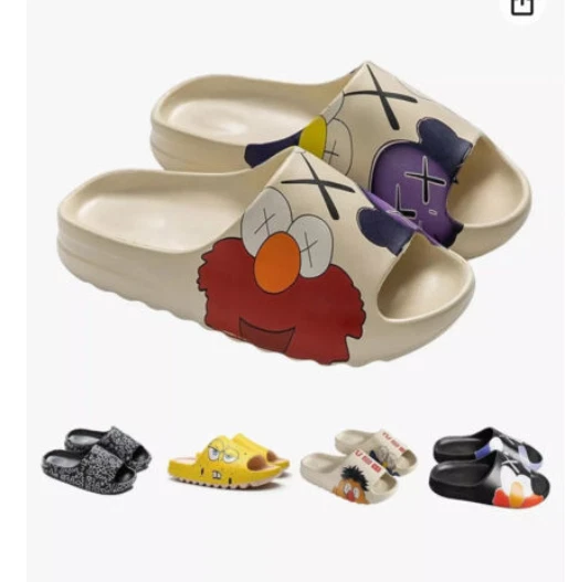 Step out in style with these Yeezy Slides featuring an anti-slip cartoon print. The almond toe shape adds a touch of elegance to these unisex slippers, perfect for travel, activewear, casual, or workwear occasions. The slip-resistant and non-slip features provide comfort and safety, while the breathable and water-resistant material makes them suitable for all seasons. These Yeezy Slides are made with ethylene vinyl acetate upper and lining material, and feature graffiti accents of Elmo and SpongeBob SquarePants. The slipper's outsole and insole are also made of ethylene vinyl acetate material. These slippers are perfect for anyone looking for a comfortable, stylish, and practical addition to their wardrobe. You can also check out our main store for a discount by heading visiting to https://toonfeet.com .
