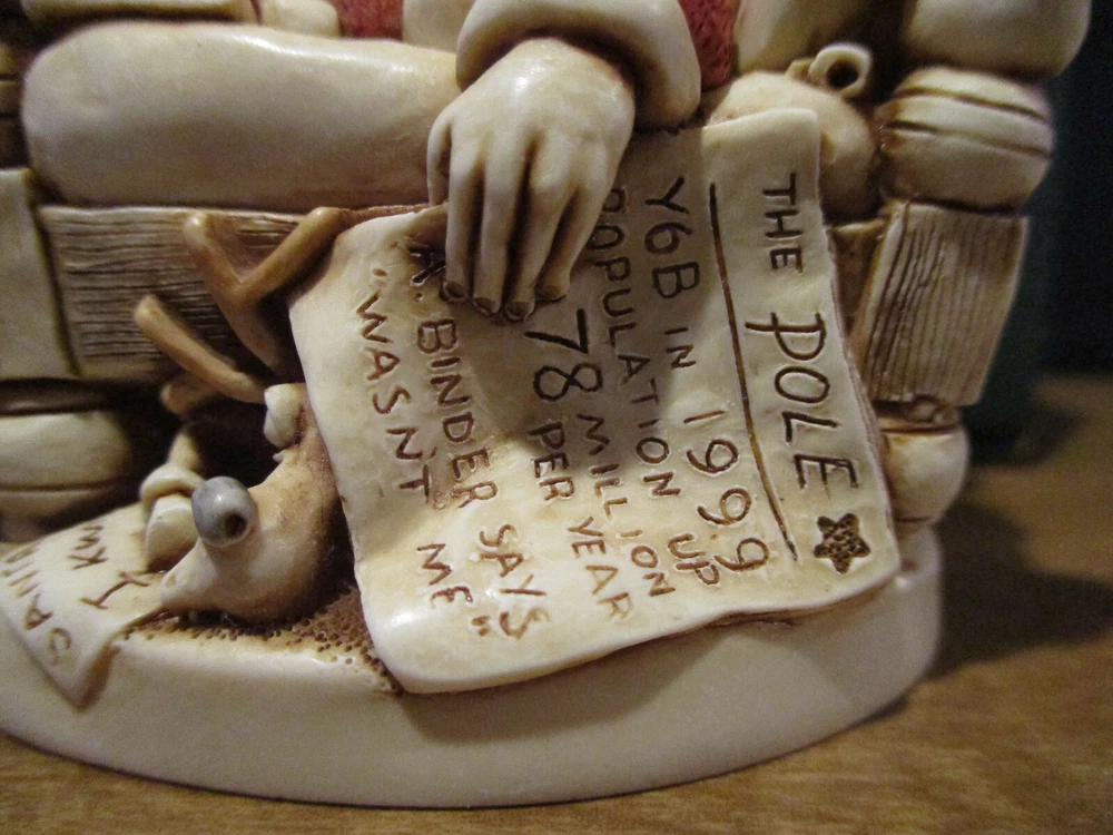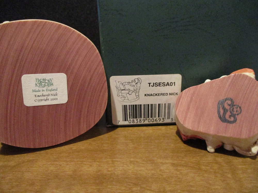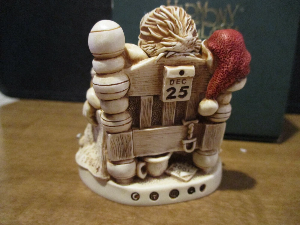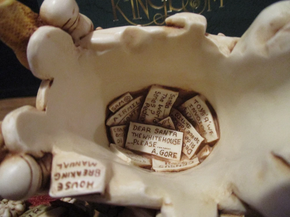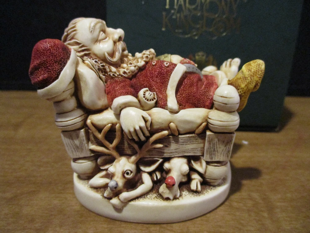 Please Note : If you are interested in collecting Harmony Kingdom, Adam Binder Editions or Fragile World pieces, please select me as one of your favorite sellers on eBay, or contact me about a piece you are looking for, and I will be happy to list it, if I have it. I have a large selection of pieces in my ebay store, but due to the expense of listing them all at one time, I will be listing only a few auctions each week. I will try and list a variety of pieces each week and hopefully you will find items of interest to you. This Harmony Kingdom box figurine named "Knackered Nick" was carved by Peter Calvesbert in 2001. It was hand painted/finished by local craftsmen in the Cotswold area of England. "Santa has finished his duties and has retired for a well deserved rest. His tee-shirt proudly proclaims this year's "World Tour." He also feels somewhat exhausted by what he's just read in the local paper "The Pole": the world population is growing by 78 million each year. Just think how much busier he'll be next year! "Y6B" in the headline is shorthand, similar to Y2K, and stands for "year six billion." One of Santa's reindeer is drafting a poorly spelled resignation letter after reading the same article. Another, seeing that Santa has pinned up a sock, slips a present in it. After all, someone has to deliver Santa's Christmas gifts. A leftover present, one of the ubiquitous singing fish, hangs on the footboard. Mince pies and a book on training reindeer are also in the bed. The jolly old elf has a side we haven't seen before: the barrel of a handgun pokes out from under the pillow and a pair of cuffs hang from a bedpost. The mouse peeks out from the stocking. The Version One interior contains letters to Santa and the newspaper headline reads "A. Binder Says Wasn't Me." The Version Infinity interior shows a stockpile of Christmas 2000's most popular gift, cell phones, and the newspaper headline reads "B. Clinton Says Wasn't Me." USPS Ground Advantage insured shipping in the US. The piece is "mint in box". Thanks for looking!