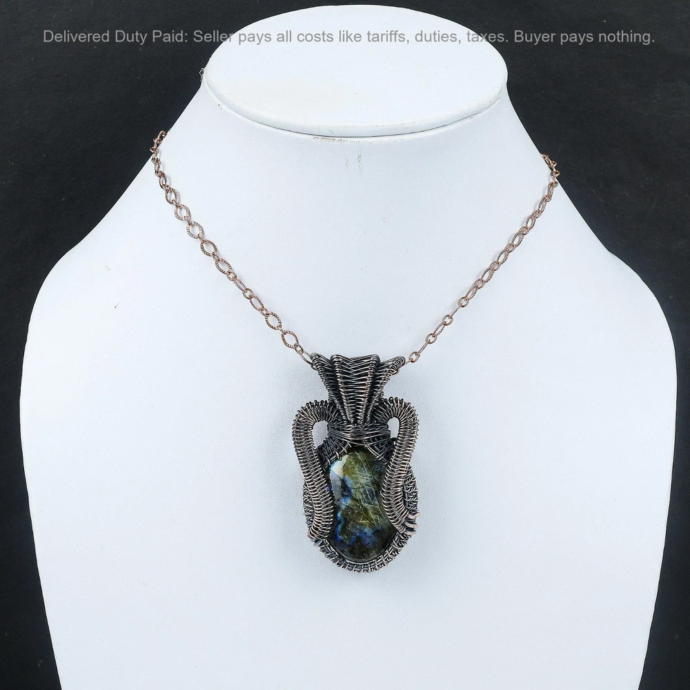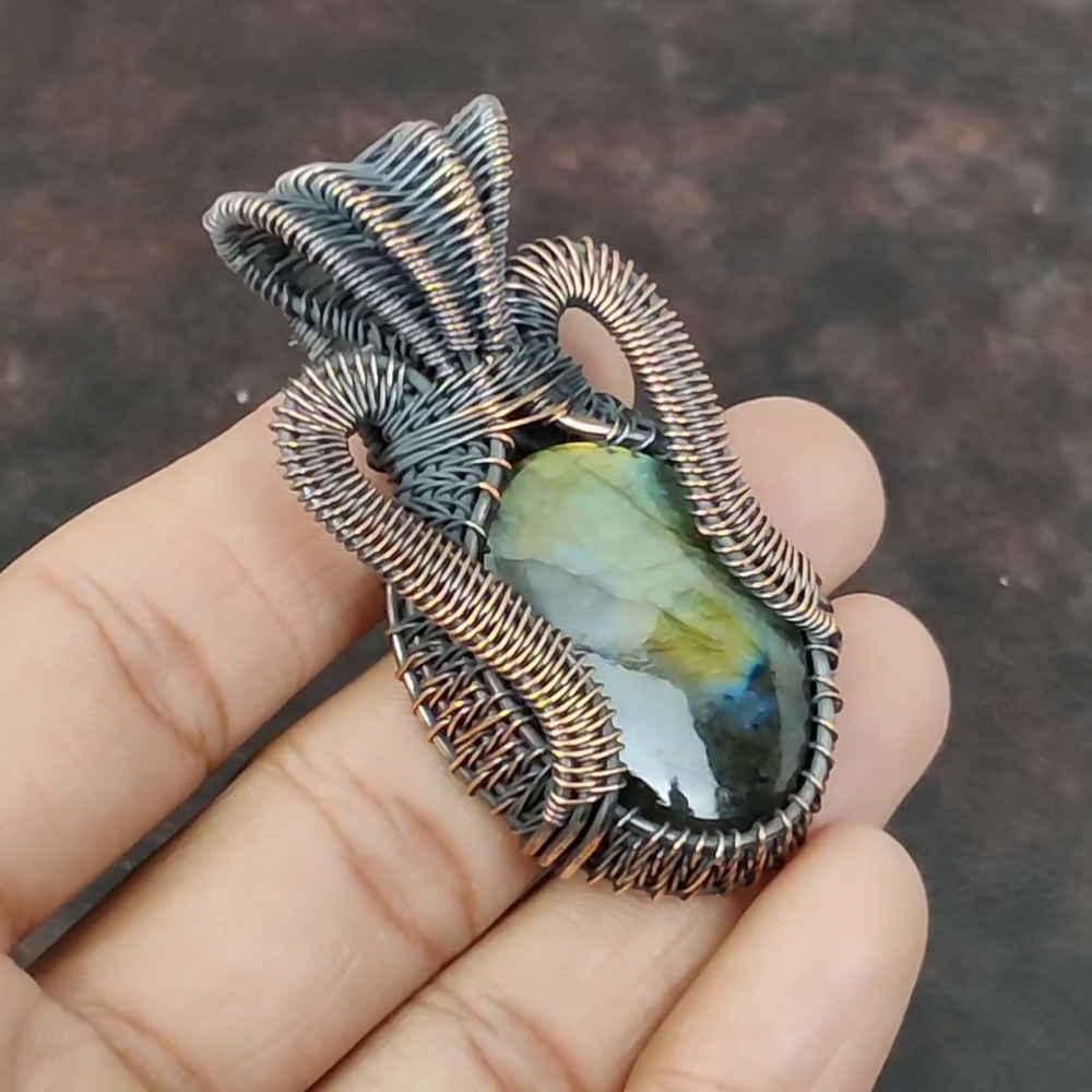 Note : Due to the natural formation of this gemstone. Slight variation in design and color are to be expected. Welcome to Silver Creation Christmas Sale Oval Labradorite Stone Copper Wire Wrapped Birthday Wife Pendant Handmade Pendant, Wire Wrapped Pendant, Wire Wrapped Jewelry, Copper Pendant, Copper Wire Pendant, Wrapped Jewelry, Wire Wrap Pendant, Wire Wrap Jewelry SKU : FWP-540 Stone Shape : Oval Metal Purity : Unknown Copper Length : 63 Millimeters Width : 37 Millimeters Copper has been used for jewelry making for thousands of years, dating back to ancient civilizations such as the Egyptians, Romans, and Aztecs. Copper was valued for its beauty, versatility, and durability, and was often used to make everything from jewelry and coins to cookware and tools. In addition to its historical significance, copper jewelry also offers several benefits. Copper is a natural conductor of heat and electricity, which makes it ideal for energy healing and therapeutic purposes. Wearing copper jewelry is believed to have various health benefits, such as improving circulation, reducing inflammation, and boosting the immune system. Some people also believe that copper jewelry has the ability to balance energy and improve mood. For Mother's Day Gift For Father's Day Gift For Promise For Valentine' Day For Halloween Party For Christmas Day Gift For New Year Party For Mom For Her If you can't find the information you need or need some advice for your design? Feel free to contact us. We are fast to reply :) All our work is made by hand with Love and Care in our workshop Thank you so much for visiting and hope you enjoy shopping with us Silvercreations is committed to delivering the best quality sterling silver jewelry to customers. As a handmade jewelry manufacturer, we offer an extensive selection of copper gemstone jewelry that showcases the brilliance of our craftsmanship. We are an experienced handmade jewelry supplier with expertise in embellishing gemstones to suit every style. We offer you the liberty to create your jewelry ensemble with sparkling, earthy, and pure gemstones. Our Talented artisans masterfully handcraft each piece of jewelry you see here. Our pieces are made with genuine gemstones.