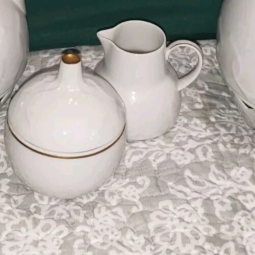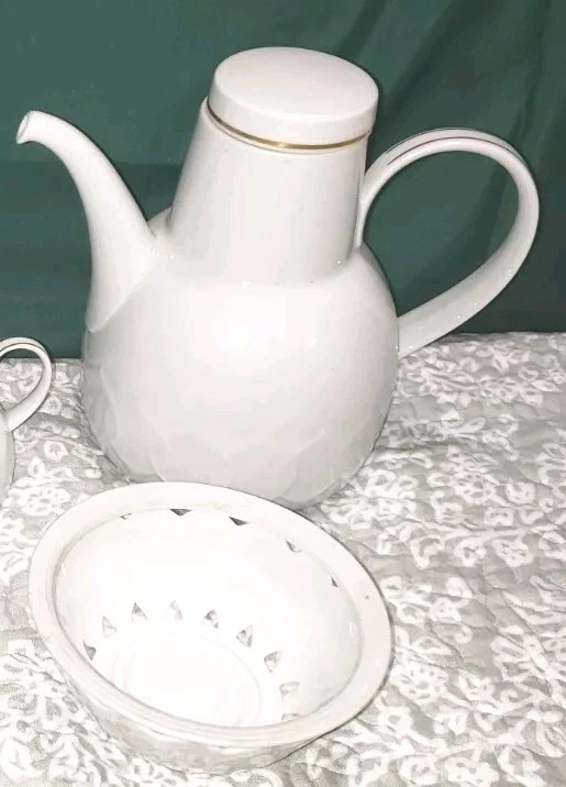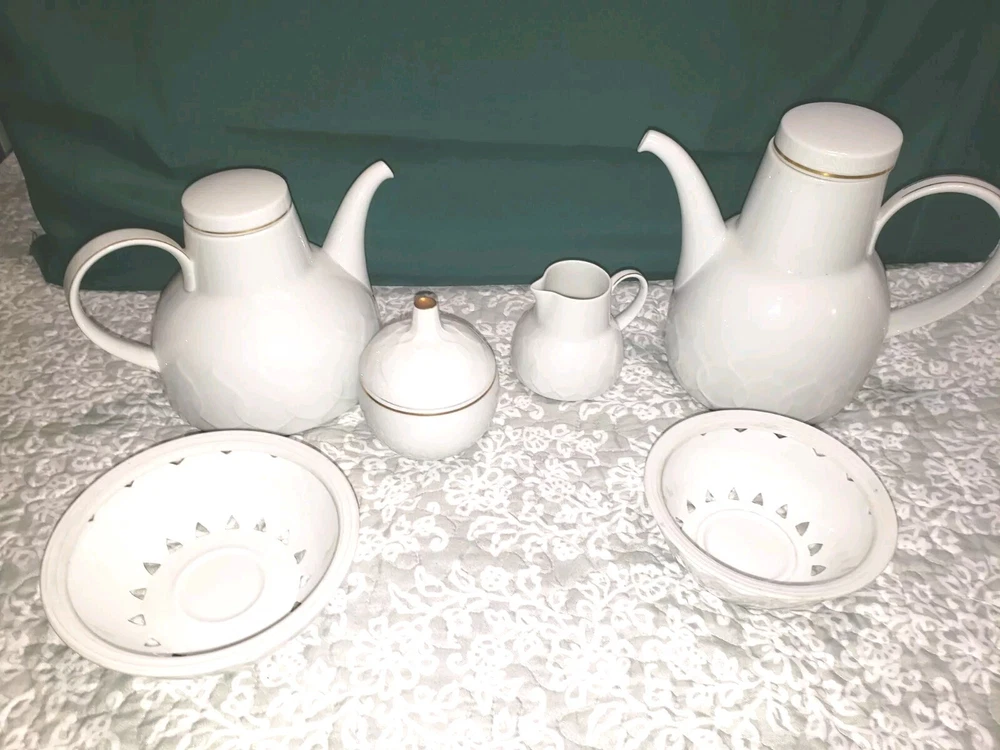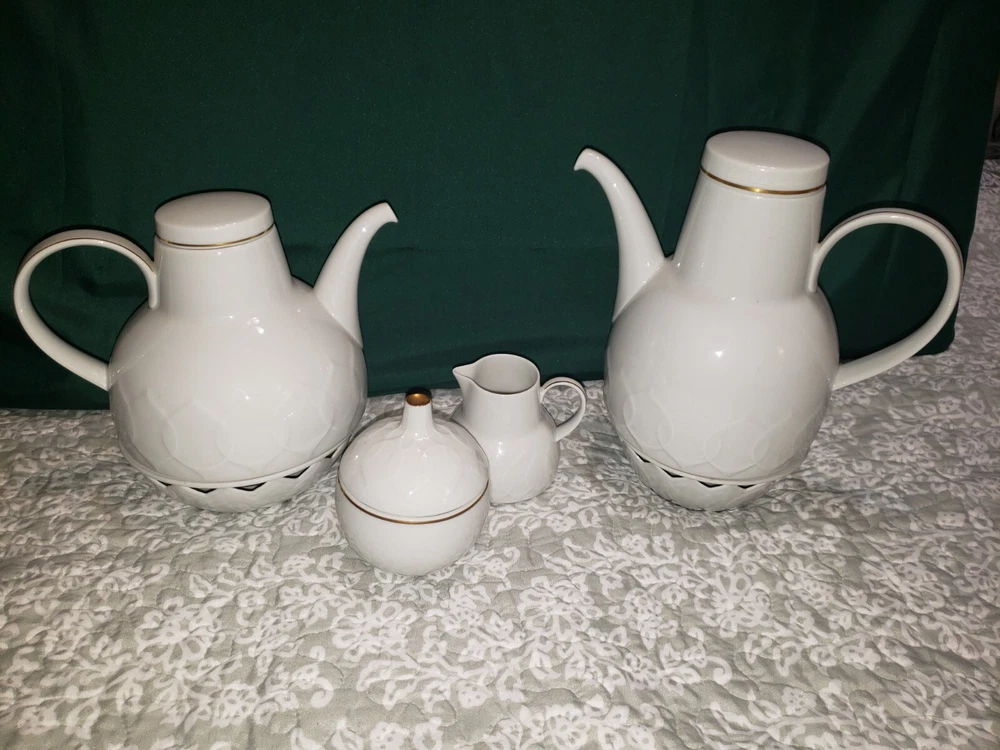 Rosenthal Studio Linie Solid White Porcelain Coffee Pot AND Tea Pot with Warming bases With sugar bowl and creamer set. Notable Details Excellent preserved (pre-owned) condition. All pieces have gold trim line on handles and covers. Note the green Rosenthal ~ Germany printing at bottom of EACH piece. Measurements Tea Pot: Weight ~605g (1 lb 7.3 oz) Dimensions ~Lid width 2 3/4” ~Width at widest part of pot is 6 1/2” ~Height is 5 1/8” ~Base of pot diameter is 6 1/2" Coffeepot: Weight ~605g (1 lb 7.3 oz) Dimensions ~Lid width 2 3/4” ~Width at widest part of pot is 6” ~Height is 7" ~Base of pot diameter is 6” All measurements are approximate. See pictures for a more accurate description