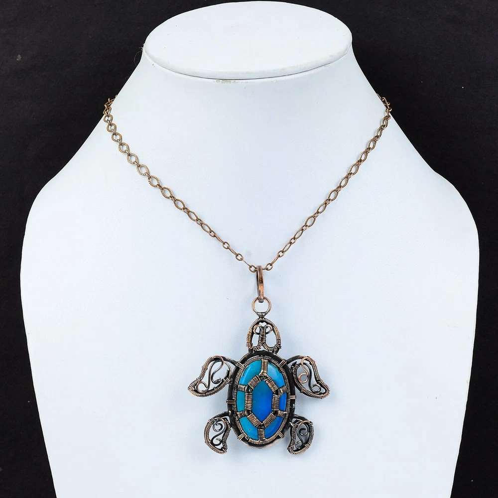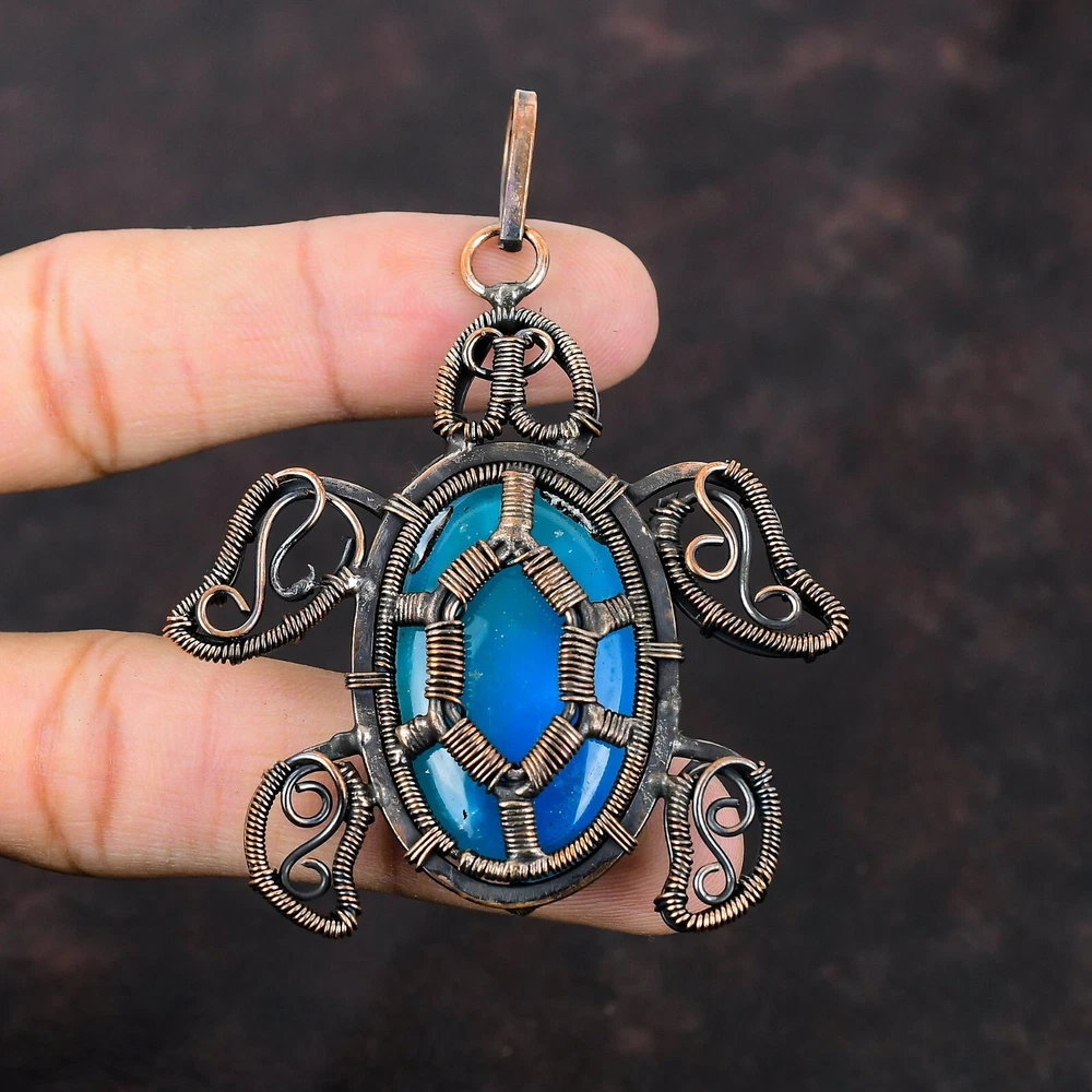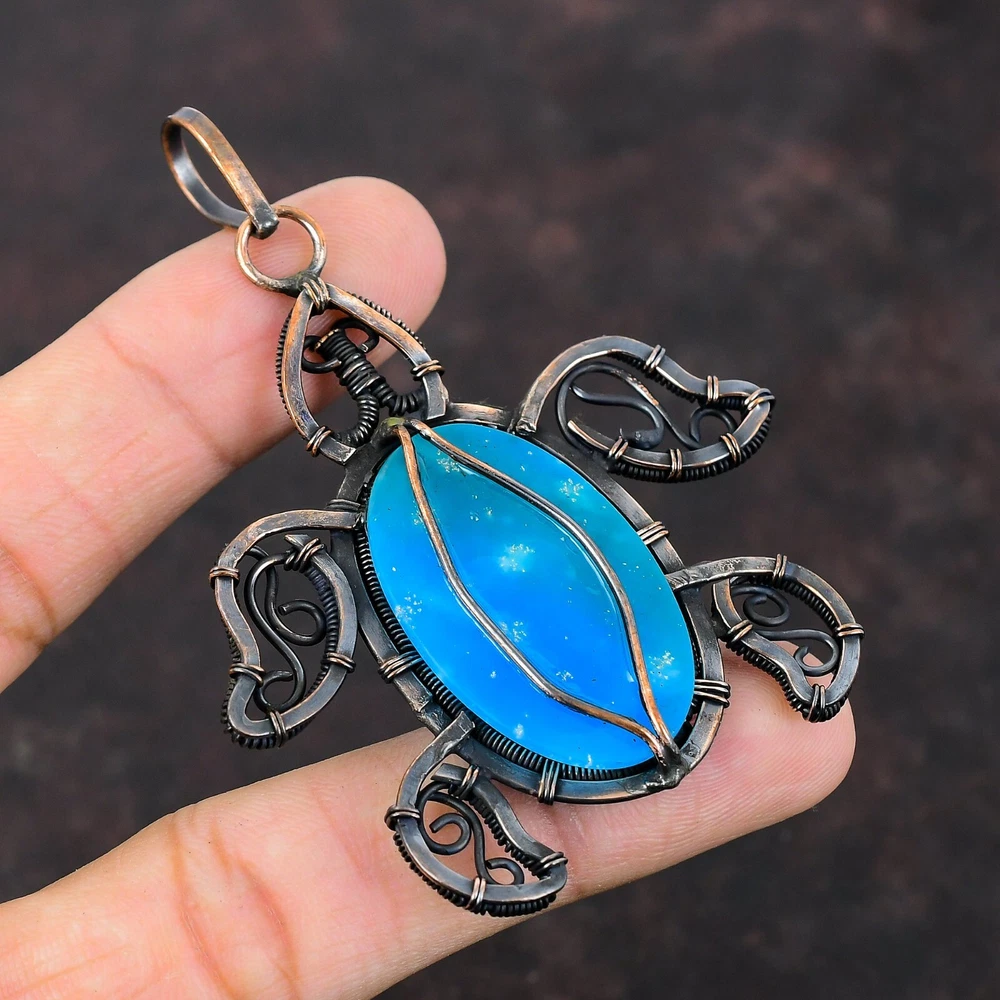 Note : Due to the natural formation of this gemstone. Slight variation in design and color are to be expected. Welcome to Silver Creation Handmade Pendant, Wire Wrapped Pendant, Wire Wrapped Jewelry, Copper Pendant, Copper Wire Pendant, Wrapped Jewelry, Wire Wrap Pendant, Wire Wrap Jewelry SKU : VFWP-4107 Gemstone : Smithsonite Stone Shape : Oval Metal Purity : Unknown Copper Length : 77 Millimetres Width : 60 Millimetres Copper has been used for jewelry making for thousands of years, dating back to ancient civilizations such as the Egyptians, Romans, and Aztecs. Copper was valued for its beauty, versatility, and durability, and was often used to make everything from jewelry and coins to cookware and tools. In addition to its historical significance, copper jewelry also offers several benefits. Copper is a natural conductor of heat and electricity, which makes it ideal for energy healing and therapeutic purposes. Wearing copper jewelry is believed to have various health benefits, such as improving circulation, reducing inflammation, and boosting the immune system. Some people also believe that copper jewelry has the ability to balance energy and improve mood. For Mother's Day Gift For Father's Day Gift For Promise For Valentine' Day For Halloween Party For Christmas Day Gift For New Year Party For Mom For Her If you can't find the information you need or need some advice for your design? Feel free to contact us. We are fast to reply :) All our work is made by hand with Love and Care in our workshop Thank you so much for visiting and hope you enjoy shopping with us Silvercreations is committed to delivering the best quality sterling silver jewelry to customers. As a handmade jewelry manufacturer, we offer an extensive selection of copper gemstone jewelry that showcases the brilliance of our craftsmanship. We are an experienced handmade jewelry supplier with expertise in embellishing gemstones to suit every style. We offer you the liberty to create your jewelry ensemble with sparkling, earthy, and pure gemstones. Our Talented artisans masterfully handcraft each piece of jewelry you see here. Our pieces are made with genuine gemstones.