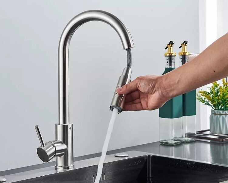 Christmas SALE - Kitchen Faucet with Sprayer (Finish: Brushed Nickel) Beautiful Minimalist Design for Modern Kitchen - Pull Out Faucet Head - One-click Button System for Sprayer-to-Stream options - Single Handle - 360° Rotation