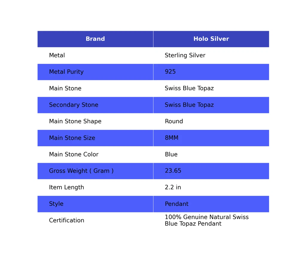Welcome to Holo Silver Swiss Blue Topaz Gemstone Indian Jewelry 925 Sterling Silver Pendant For Women Handmade Pendant, Sterling Silver Pendant, Swiss Blue Topaz Pendant, Handcrafted Pendant This beautiful pendant is a perfect addition to any jewelry collection. With a round shape and silver metal, it features a stunning Swiss Blue Topaz gemstone that is eye-clean and has excellent cut grade. The pendant also has a charm design, and it comes with a seller warranty and is signed by the seller. As for the gemstone, it is not enhanced and has no vintage value. The pendant is handcrafted and has a bohemian, healing, and love & hearts theme, making it a perfect gift for engagement, Mother's Day, Christmas, graduation, wedding, anniversary, birthday, christening, confirmation/communion, or Valentine's Day. The pendant also has nickel-free features and is made with high-quality materials. SKU : PP-37-6 Gemstone : Swiss Blue Topaz Stone Shape : Round Metal Purity : 925 Sterling Silver Length : 2.2 Inches Width : Inches ___________________________________________________________________ Shipping Handling - Charge - Free ( Condition apply ) Handling Time - One business day . Delivery Time - 3 to 23 Days ( Various on destination ) Postage service - (A.) India Post - Below $100 order which takes 11 to 23 days . (B.) USPS, Fedex, DHL , Aramax- Order above $100 which takes 3 to 7 days . _________________________________________________________________ Returns - 1. We provide a 100% Money Back Guarantee, excluding shipping costs, within 30 days from the date of item receipt. 2. The item must not be altered or damaged in any way shape or form. 3. Upon receipt of the aforementioned items, your payment will be promptly refunded. 4. Please be so kind as to contact us via email in order to acquire comprehensive return instructions before proceeding with the return of the merchandise. 5. Kindly be advised to allocate a maximum period of 1 business day for the processing of all returns, in order for the appropriate credit to be applied. 6. Sizing does not affect the return policy. _________________________________________________________________ Payment - We accept PayPal for Payment , should made within three days once buying or winning done , in case of late information expected . _________________________________________________________________ FAQ's - Q.(A) ARE THE ITEMS YOU ARE SELLING BRAND NEW? We exclusively offer brand-new products, refraining from the sale of pre-owned jewelry. Our entire jewelry collection is composed of 100% natural, conflict-free pieces. We do not engage in the trade of imitation or lab-grown gemstones and diamonds. Q.(B) WHAT ARE YOUR BUSINESS HOURS? Our business hours are Monday to Friday, 10:00AM to 6:00PM, excluding holidays. ________________________________________________________________ Holo Silver is committed to delivering customers an unparalleled experience through the provision of exquisite handmade jewelry, meticulously crafted to uphold the most exacting standards of quality. Our operations encompass dual roles as both discerning connoisseurs and skilled artisans within the realm of jewelry making. We proudly hold an extensive proficiency in the fine art of enhancing gemstones, allowing us to harmonize them seamlessly with diverse aesthetic inclinations. We are delighted to extend to you the privilege of curating your very own jewelry collection. This collection will be graced by the presence of genuine and splendid natural gemstones, each possessing an innate authenticity and beauty that is truly unparalleled.