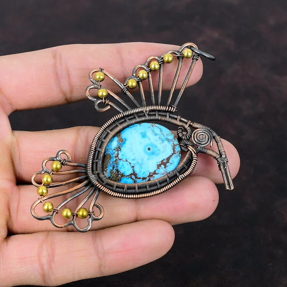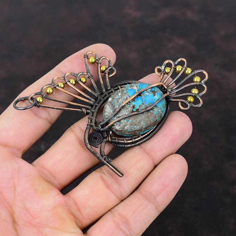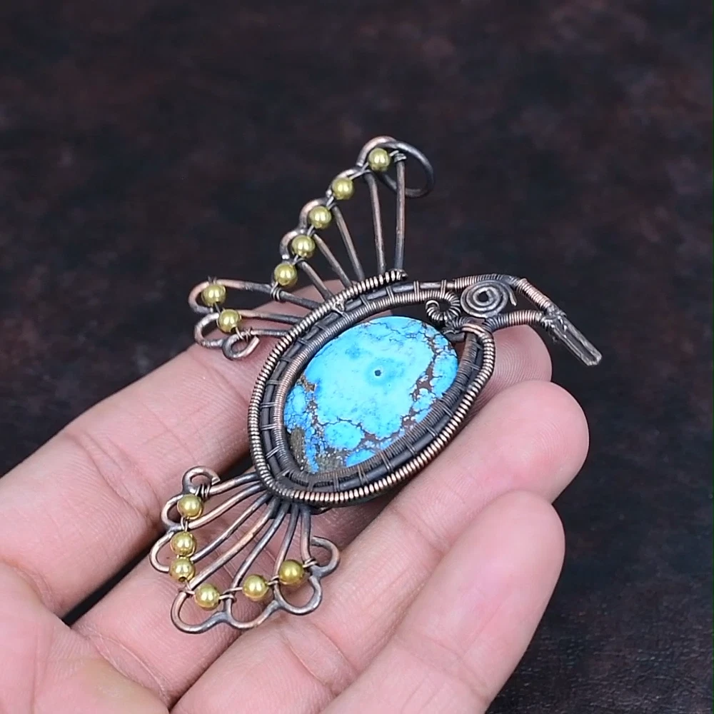 Note : Due to the natural formation of this gemstone. Slight variation in design and color are to be expected. Welcome to Silver Creation Handmade Pendant, Wire Wrapped Pendant, Wire Wrapped Jewelry, Copper Pendant, Copper Wire Pendant, Wrapped Jewelry, Wire Wrap Pendant, Wire Wrap Jewelry SKU : VFWP-3358 Gemstone : Tibetan Turquoise Stone Shape : Oval Metal Purity : Unknown Copper Length : 98 Millimetres Width : 69 Millimetres Copper has been used for jewelry making for thousands of years, dating back to ancient civilizations such as the Egyptians, Romans, and Aztecs. Copper was valued for its beauty, versatility, and durability, and was often used to make everything from jewelry and coins to cookware and tools. In addition to its historical significance, copper jewelry also offers several benefits. Copper is a natural conductor of heat and electricity, which makes it ideal for energy healing and therapeutic purposes. Wearing copper jewelry is believed to have various health benefits, such as improving circulation, reducing inflammation, and boosting the immune system. Some people also believe that copper jewelry has the ability to balance energy and improve mood. For Mother's Day Gift For Father's Day Gift For Promise For Valentine' Day For Halloween Party For Christmas Day Gift For New Year Party For Mom For Her If you can't find the information you need or need some advice for your design? Feel free to contact us. We are fast to reply :) All our work is made by hand with Love and Care in our workshop Thank you so much for visiting and hope you enjoy shopping with us Silvercreations is committed to delivering the best quality sterling silver jewelry to customers. As a handmade jewelry manufacturer, we offer an extensive selection of copper gemstone jewelry that showcases the brilliance of our craftsmanship. We are an experienced handmade jewelry supplier with expertise in embellishing gemstones to suit every style. We offer you the liberty to create your jewelry ensemble with sparkling, earthy, and pure gemstones. Our Talented artisans masterfully handcraft each piece of jewelry you see here. Our pieces are made with genuine gemstones.