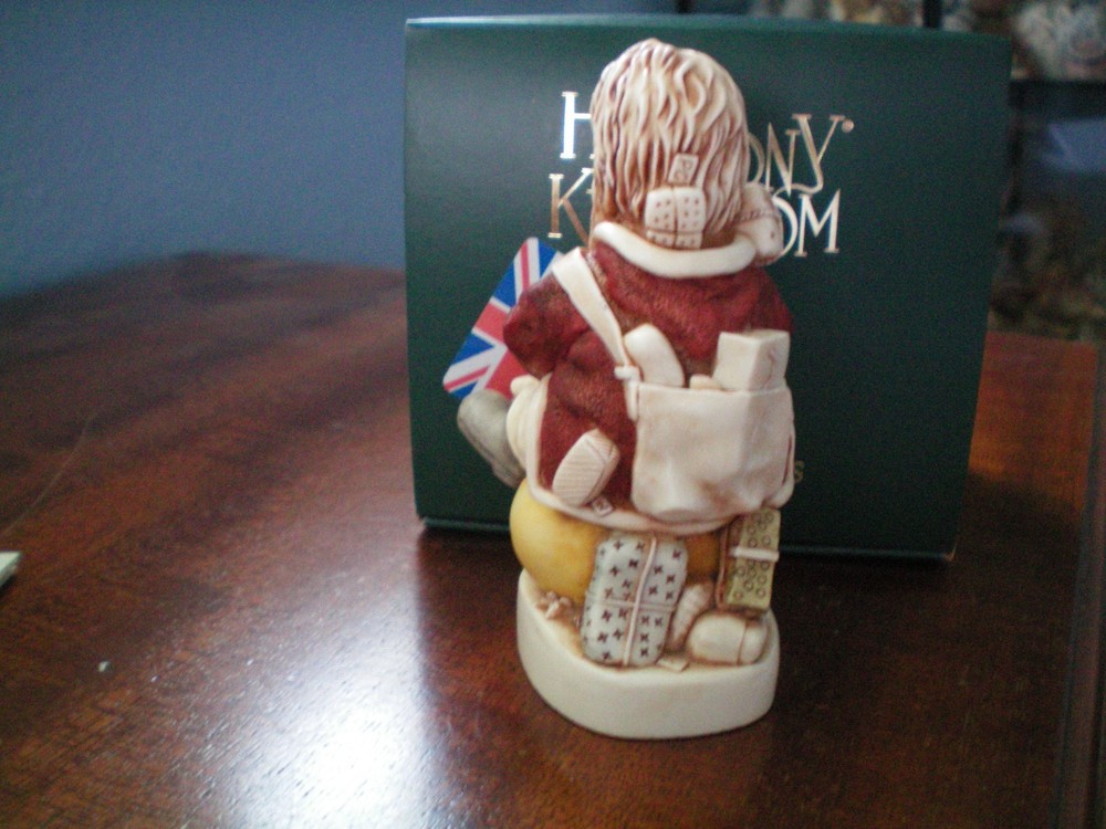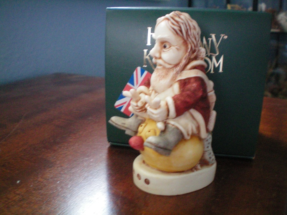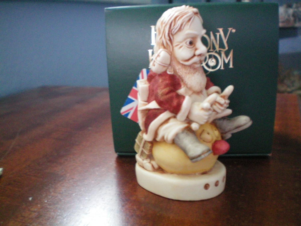 Please Note : Some states, such as WA, IA and MN have passed laws requiring eBay to collect sales taxes on all internet purchases. Other states are considering similar actions. The buyer is responsible to pay those additional fees, if required. If you are interested in collecting Harmony Kingdom, Adam Binder Editions or Fragile World pieces, please select me as one of your favorite sellers on ebay, or contact me about a piece you are looking for, and I will be happy to list it, if I have it. I have a large selection of pieces in my ebay store, but due to the expense of listing them all at one time, I will be listing only a few auctions each week. I will try and list a variety of pieces each week and hopefully you will find items of interest to you. This Harmony Kingdom box figurine named "Nick's New Ride" was carved by Peter Calvesbert in 2009. It was hand painted/finished by local craftsmen in the Cotswold area of England. This year was an especially rough one for everyone, including Santa! He had to replace his reindeer with a cheaper mode of transport – a Hoppity Hop, or as it is known in the UK, a Space Hopper. Look for Peter’s signature mouse, and you’ll know why he isn’t pleased with the change. A fed up reindeer with his UB40, an unemployment card in the UK, is hiding inside. Inscribed on the lid are “Mr. Hoppy” and “Ivan Dobsky MD”, characters from an animation series called Monkey Dust which Peter found darkly brilliant. Notice Santa’s feet. “A.C.” stands for Aquilino Cosani, credited with the bouncing rubber toy. “Pon Pon” was the name he gave to it. And look closely at Santa’s presents. One is labeled “LY” for Lisa Yashon, HK co-founder. The other is labeled “PC” for our favorite master carver. A further inscription, “EL”, still eludes Peter. USPS Ground Advantage insured shipping in the US. The piece is "new in box". Thanks for looking!