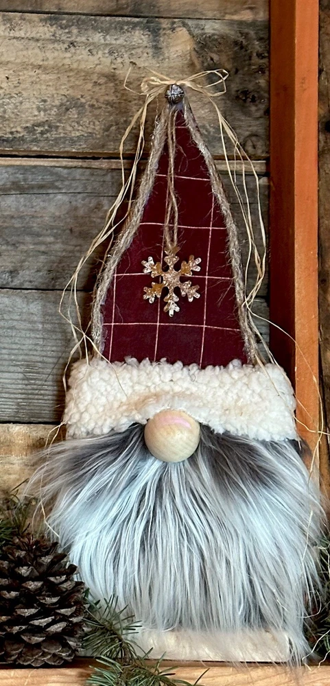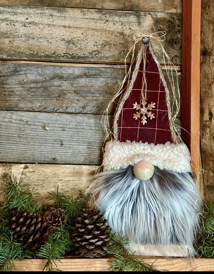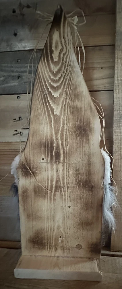 Handcrafted wooden Santa gnomes. Created with Holiday fabric and faux fur. About 15 inches tall and about 5 inches wide. All gnomes are handmade with love using recycled wood.