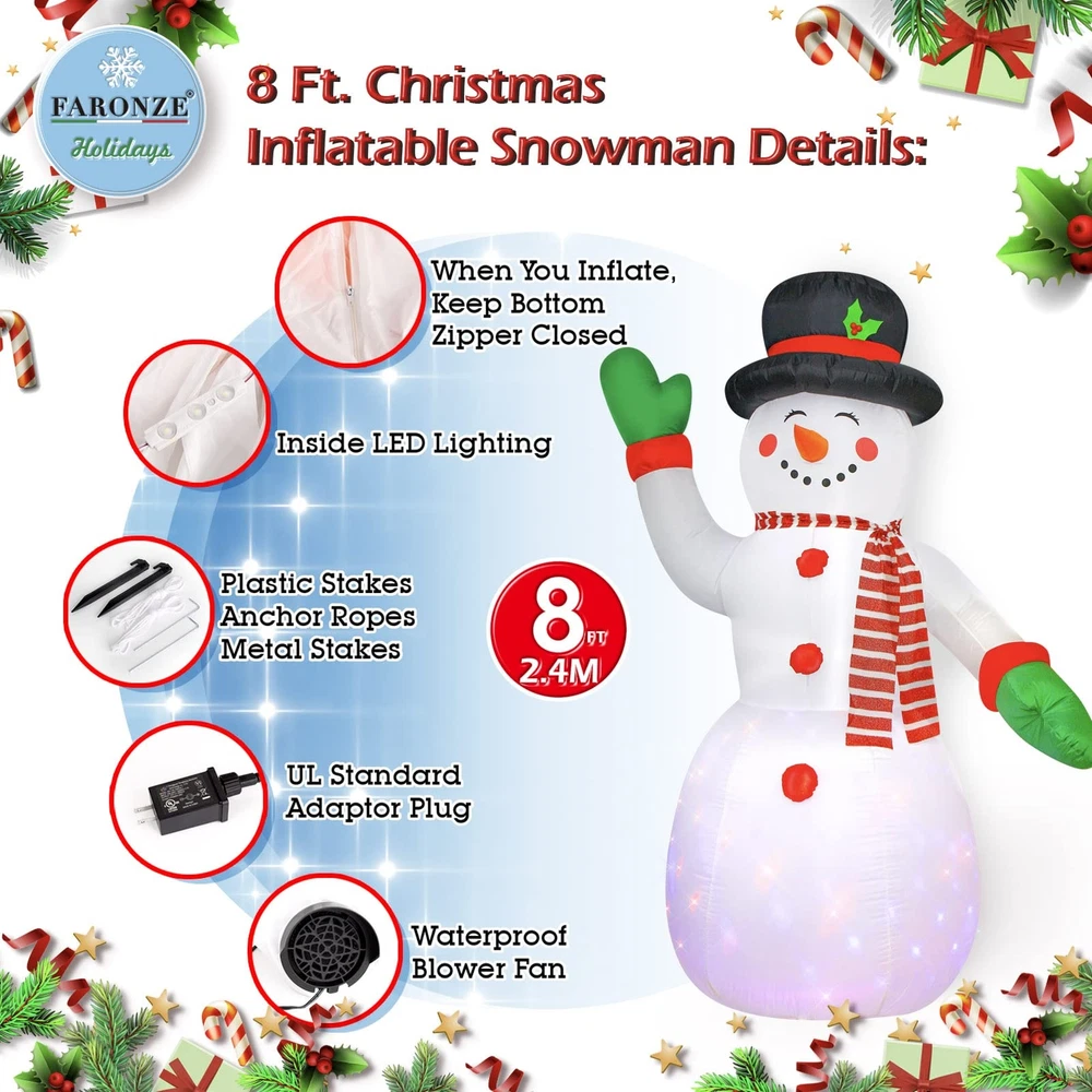 8 feet Inflatable Snowman is the best way to spread cheer this Christmas Season! Featuring inner lights to gently illuminate its effects at night. Our inflatable package includes rope, stakes and powerful blower fan to allow for a quick and easy set up. Christmas can be one of the most memorable Holidays for any child or adult. At we strive to create some of the most magical Christmas lawn inflatables available. Our deluxe 8 feet tall inflatableSnowman will leave any any viewer in awe due to its height, powerful blower, and beautiful inner lights. Our inflatables are built with premium oxford fabric that will endure the elements during its time outdoors. Stands Out- This Snowman inflatable stands at 8 feet tall making it one of the biggest and most attractive inflatable Christmas Holiday decorations around! Illuminates Holiday Cheer- This Snowman inflatable comes with a set of interior lights to illuminate your yard for maximum joy that the whole neighborhood can see and enjoy! Inflates Quickly- Simply attach your blower fan to your Christmas inflatables and plug it in and your inflatable snowman will be ready to spread joy in minutes! Easy To Set Up- Inflatable Snowman includes all you need to set up quickly and easy including yard stakes, blower fan and tether ropes! Great For Any Occasion- Perfect decoration for parties, lawns and festivals! Can be used both indoor and outdoors!