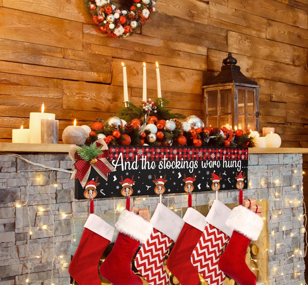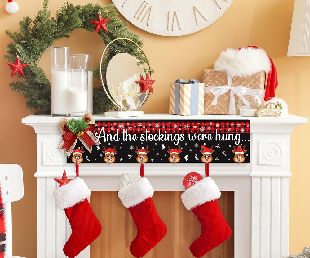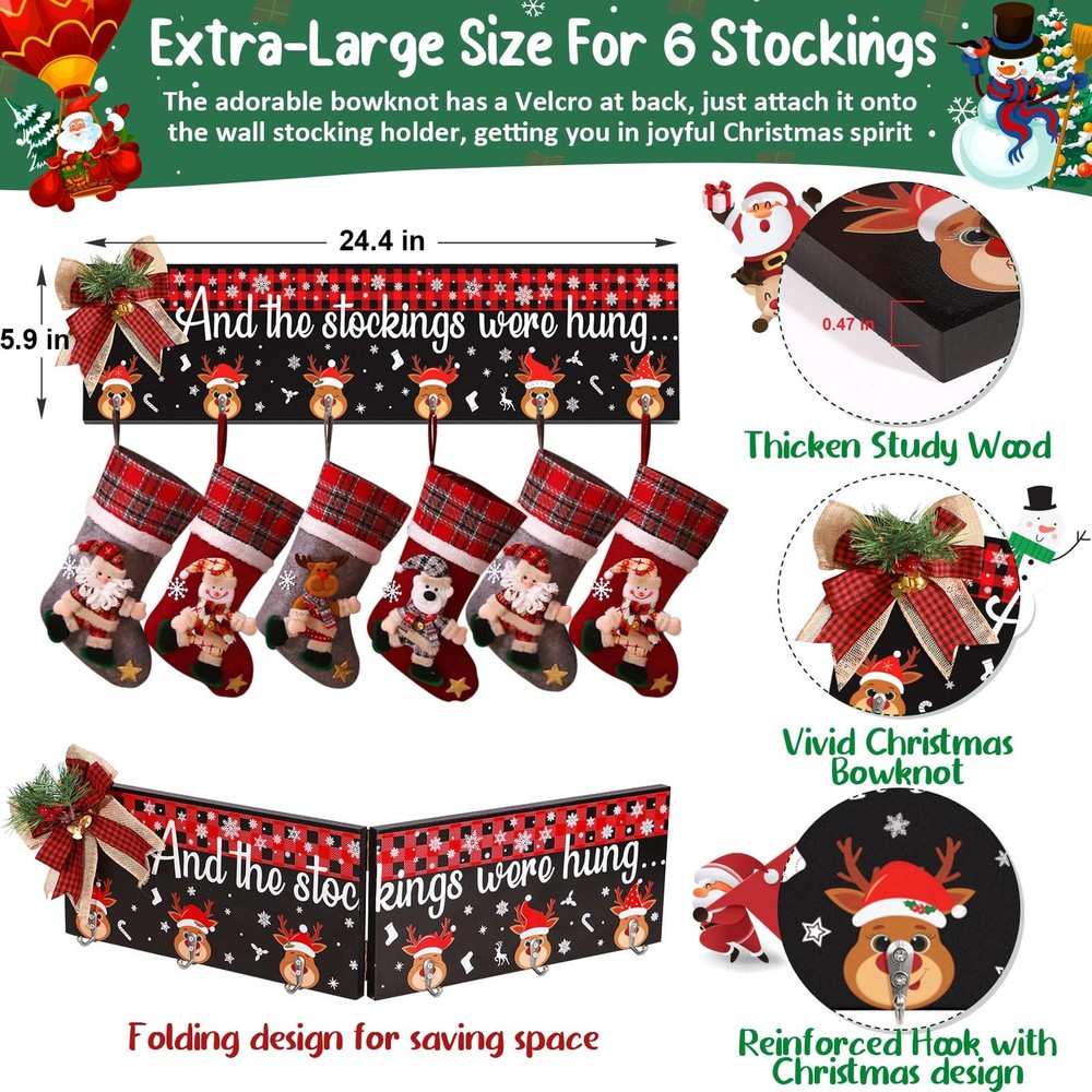 committed to create Christmas stocking holder for wall mantel fireplace that bring joy to you and your family and friends, Our stocking hanger Christmas decorations will your guest in Christmas cozy & joyful atmosphere or make any space festive and cheerful for the Christmas Thanksgiving New Year and be enjoyed for years. Be your Christmas indoor decor for home or send as a personalized Christmas gift to friends or families to wish a good luck and bring happiness and joy to the new year. The cute Christmas stocking hooks for mantel set of 6 hanger is the perfect touch of Christmas home decoration that you have been looking for. Our great-valued Christmas wall hanging stocking holder also is the perfect addition for Christmas party decor / Christmas Home Decor / Christmas Decorations Indoor / Christmas Kitchen Decor / Christmas Bedroom Decor Features: Durable Wood Material: Durable , Not Easy To Break Well-Done UV Painting: Nice-Looking & Long-Lasting & No Fading High-quality Stocking Hooks for socks: Study, Without Installation Decorative Christmas Buffalo Plaid Bow: Burst with adorable Xmas farmhouse charm, beautiful and cute Creative DIY Christmas organizer : Great Value, easily hold other Christmas ornaments and your daily objects like coats, bags, hats. Proper Size & Collapsible Stocking Hanger:Still looking for a versatile stocking hanger that show up your favorite Xmas socks as well as strengthen cozy & joyful Christmas mood? Collapsible Design for fold easily, when fully unfolded, The Christmas stocking Holder measure 24.4 x 5.9 x 0.47 inches, longer than other mantle stocking hanger to allow you hold both empty and full stockings with gifts, add strong holiday touch to your Christmas Decor!Say no to small & thin wall stocking hanger Creative Wall Stocking Hanger for Mantel: Add charm to your holiday Decor with this eye-catching Christmas Stocking Holder Wall Hanger! Featured buffalo plaid pattern at the top, various Christmas reindeer hooks design plus warm words “And The Stocking were Hung”,the Mantel Stocking Holder for Christmas is not only a stocking holder, but a dazzling addition to your Christmas Eve decor New Year Decor, easily to wrapped up in the joy of the season with , friends, family, neighbors Reliable & Durable Christmas Stocking Holder Wall Hanger: Made of sturdy wood, the collapsible wall Stocking Hangers Christmas Stocking Holder with 6 strong stocking hangers can hold up to 10 lb, long-lasting used years after years. Exquisite cutting & high definition UV print in vivid pattern, the wall stocking hooks for mantle are not fade or break. Come with adorable plaid bow has a Velcro at back, just attach it onto the wall stocking holder, getting you in joyful Christmas spirit asy Mounted & Multi-Used Christmas Stocking Hooks: Extra Large Size & 6-Hooks Design, And the Stocking Were Hung Christmas Stocking Holders for Mantel Wall hanging is delicate and functional, perfect for hang up your whole family’s stockings and wait for Santa to show up, even for other Christmas decoration & objects like Christmas gifts,garlands,clothes,bags. Equipped with saw-tooth hook on the back, the Stocking Holder can be easily hung on wall, fireplaces, mantels, entryway Christmas Home Decor Ideas & Christmas Gift: This Christmas Stocking Wall Hangers set of 6 Christmas stocking Hooks is not only ready to be a must-have for organize Christmas stockings and other Christmas ornaments, but a personalized gift to touch their hearts due to the impressive & heart warming design. The cute Christmas Elk surrounded by snowflake spread good luck and Christmas spirit, make it a warm Housewarming Holiday Christmas gifts for your family, friends, neighbors WORRY-: Each Christmas stocking Holder for wall stocking hanger has been wrapped carefully to ensure . If you have any questions about Christmas Decor mantel stocking hangers for wall hanging, just feel to tell and we will try our best to serve you. wood Christmas stocking holder for wall can bring a strong Christmas touch to your home, guests will surprise with Xmas Decor. Definitely purchase the Christmas fireplace stocking hangers with confidence Merry Everything Happy Always: Add charm to your holiday with this eye-catching Christmas stocking holder with 6 hangers for mantel. Farmhouse wall Christmas Stocking Holder fills with and delicate Christmas elements that make it perfect for hang on living room, kitchen, bedroom, mantel fireplace or any corner in your farmhouse or modern house. Perfect for Christmas Home Decorations, Christmas EVA Decorations, Christmas Party Decorations and New Year Celebration