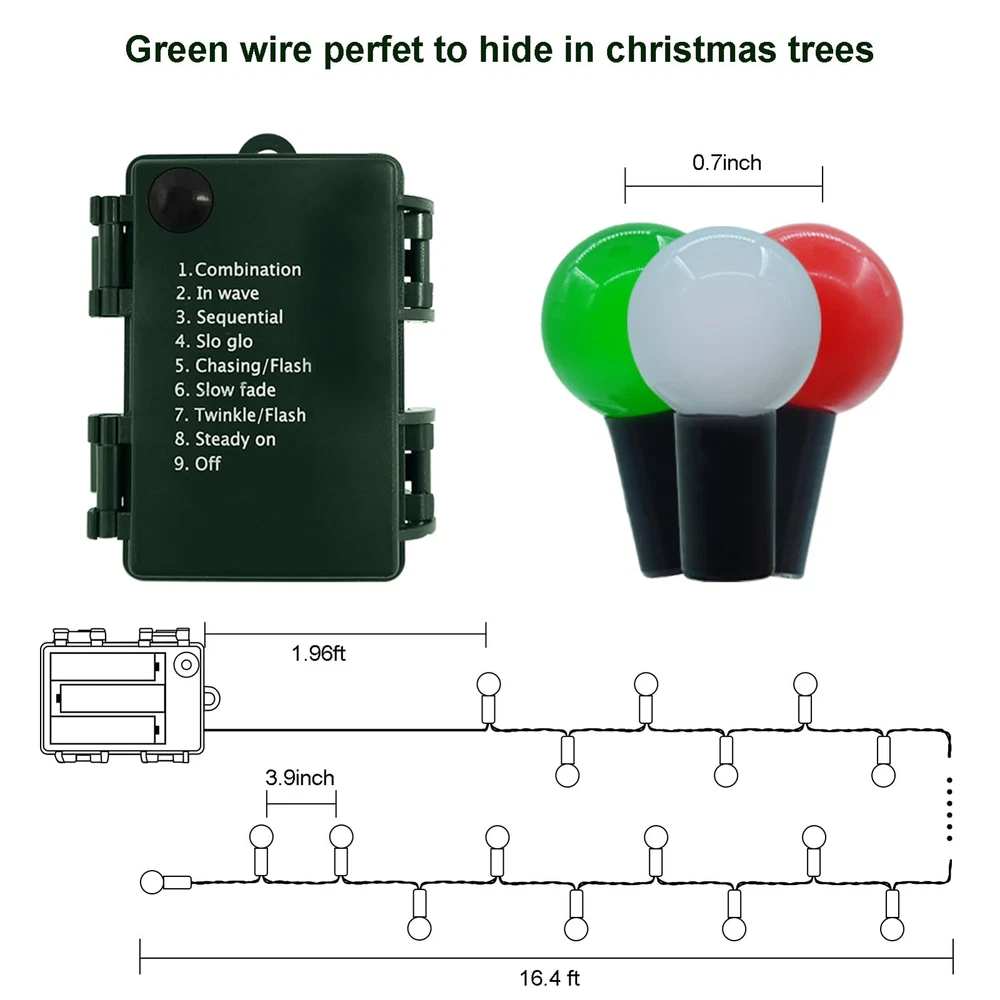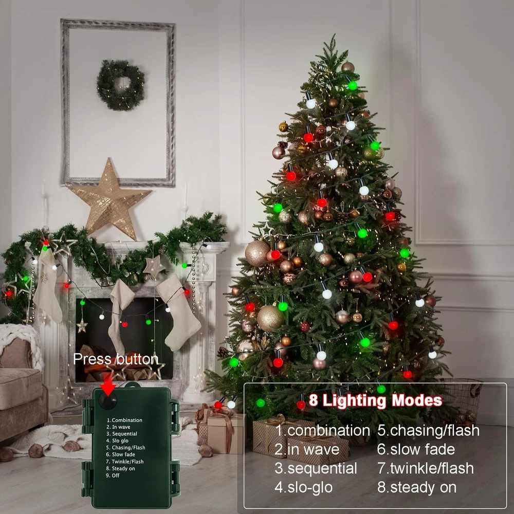 Christmas String Lights Battery Powered 16.4Ft 50LED Red Green White Globe String Lights with Timer 8 Modes Waterproof Fairy String Lights for Indoor Xmas Tree Holiday Party Outdoor Decor Sepcifications Wire material:PVC rubber LED Quantity: 50 Power Source:Battery Powered Cable Color: Green Light Color : Red Green White Size: 16.4ft Lead wire: 60CM (Approx.1.96 ft) Waterproof: IP54 8 Lighting Modes: Combination In wave Sequential Slo-glo Chasing/Flash Slow fade Twinkle/Flash Steady on Package included: 1 x Red Green White String Lights Globe String Lights: The total length of the green wire string light is 16.4ft, lead wire: 23.6 inch,two bulbs distance: 3.9 inch. Green wire design is perfet hidden inside the Christmas tree Red Green White String Lights:The fairy string lights feature 50 Globe red white green LED lights, which create a joyful festival atmosphere for Christmas Auto Timer Function:The LED string light will auto set a timer for 6 hours on and 18 hours off each day when you light up the string fairy lights,which could save energy costs and keep a long battery life Battery Power String Lights: The LED string light with battery box is portable to place anywhere you want, no need to find the socket. Powered by 3 x AA batteries(Not Included), 3V lower volt output, safe and free to touch for child and pet 8 Lighting Modes: Press the button of the battery box to choose the different mode to suit the different occasion Widely Application: Christmas color string lights is perfect for wrapping Christmas trees, wreaths, patios, hedges, fences, pillars. Good choice for increasing your holiday atmosphere for Christmas
