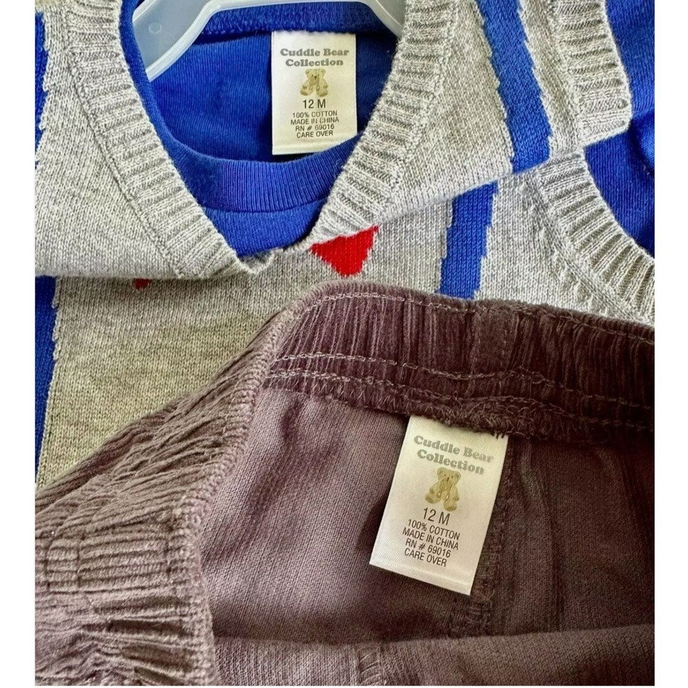 Christmas Sweater Outfit Baby Boys 3pc Vest Corduroy Pants Shirt Cotton 12M NWT 3 Piece Infant Boys Matching Sweater Vest Outfit Sz 12m Includes sweater vest with with faux bow tie & suspenders, long sleeve t-shirt & charcoal gray corduroy pants with elastic waistband. BRAND: Cuddle Bear Collection SIZE: 12 months CONDITION: Brand New with Tags CONTENT: All 3 pieces 100% Cotton STORAGE: My home is smoke-free & pet-free; however, some have been acquired & have unknown history. SHIPPING: I ship with TRACKING & try to ship all orders next day or within 2 business days. I am willing to combine shipping. To view other items I have for sale, click on my name. #formal #preppypre #xmas #classy #winksstoreroom Z003