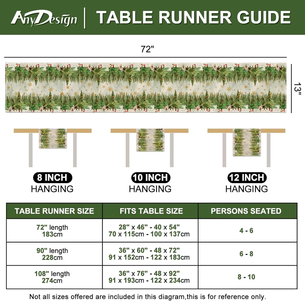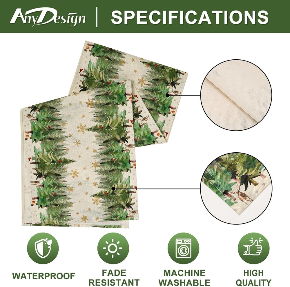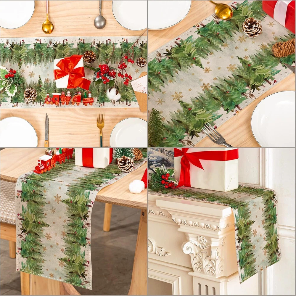Polyester THE PACKAGE INCLUDES: A Christmas themed table runner, measures 13 × 72inch, it will be appropriate size to decorate your family and party table. NOTICE: Our table runners are packed in compression and may cause uneven creases, you can wash or iron flatten them upon receipt, hoping for your kindly understanding. WATERCOLOR DESIGN: Our table runner is patterned with watercolor pine tree and golden snowflakes, fresh and delicate. While enriches the appearance of table runner, it also brings more fun to Christmas. DURABLE & REUSABLE: Made of premium polyester material, anti-slip and anti-fading, waterproof, reusable and heat resistant, it will offer you a comfortable using experience. ATMOSPHERE CREATOR: Suitable for most tables, including dining table, coffee table, entrance table, and also great for fireplaces, mantels, and more. Our table runner will create strong Christmas atmosphere for your home and party, leaving deep impressions on your guests and friends. Size: 13 x 72 inch Material: Polyester Color: Green