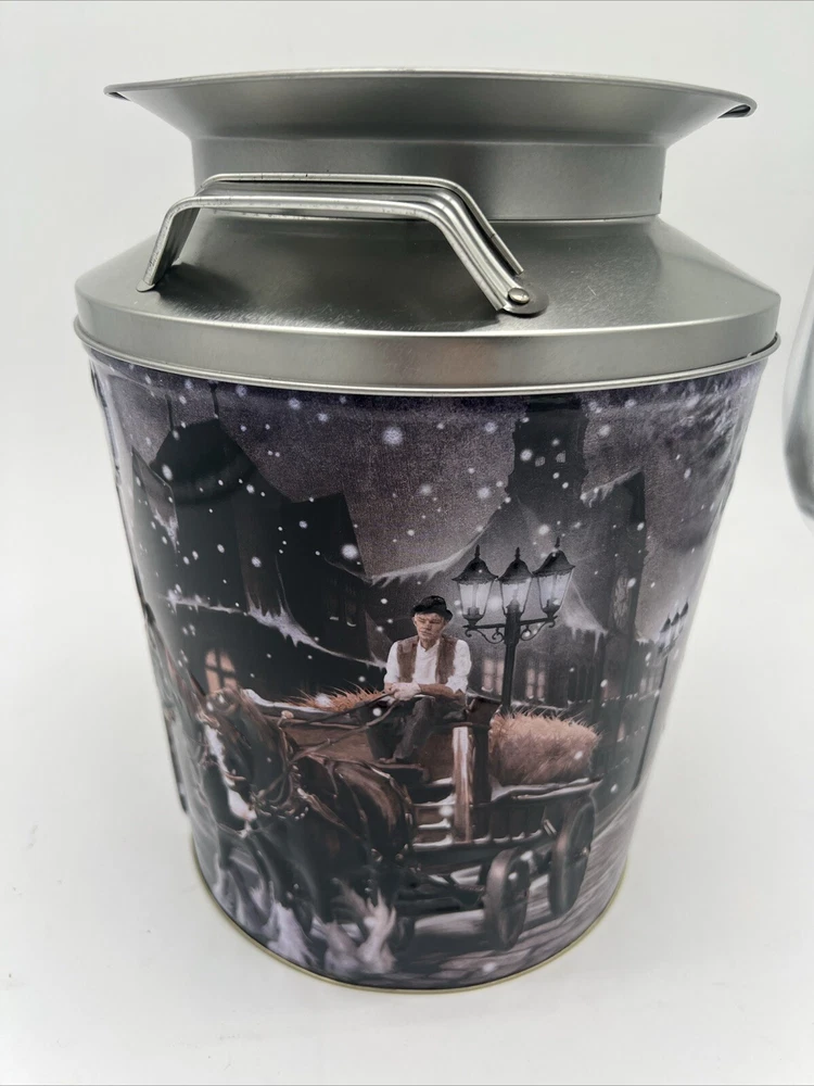 This Christmas tin features a beautiful snowy scene with Old World Clydesdale horses, perfect for collectors and those who appreciate festive decor. The tin is empty and can be used for storage or as a decorative piece. Designed in China, this piece is a unique addition to any collection.
