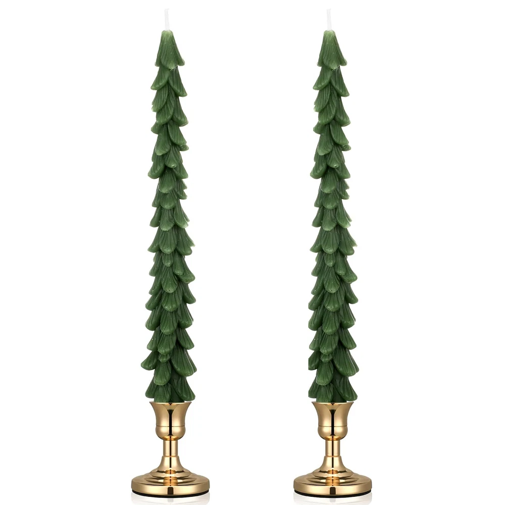Features: These Christmas tree candles wax with metal candle stick holders make a wonderful and heartfelt gift for your friends, family, or neighbors. They are especially fitting as a holiday present, spreading warmth and festivity The vibrant green and golden color of the green taper candles and candlesticks holders immediately light up your room, adding Christmas cheer to your home. They create a warm, inviting atmosphere that is irresistible, making them an ideal for holiday celebrations. Specifications: Material: wax and metal Color: green and golden Size: Candle: about 9.84 inches/ 25 cm high Holder: about 2.5 x 2.5 x 3 inches (L x W x H) and 0.75 inch deep for candle hole Package includes: 2 x Christmas tree candles 2 x Candle holders Notes: Manual measurement, please allow slight errors on size. The color may exist a slight difference due to different screen displays. Complete Package Includes: the package includes 2 pieces of unscented wax candles in about 9.84 inches/ 25 cm high and 2 pieces of gold candlesticks, approximately 2.5 x 2.5 x 3 inches (L x W x H) and 0.75 inch deep for the candle hole; This set provides what you need for a jubilant Christmas decoration, adding to your convenience, please kindly note that the candle needs to be first poured on the candlestick to secure the candle Notice for Use: due to the special shape of the candle, you need to drip wax oil on the edge of the candle holder to ensure that the candle does not shake; This metal candle holder is suitable for all rod candles, and you can keep it after you have applied your Christmas tree candles Quality and Reliable: our table candles are made of quality wax, crafted delicately for a realistic Christmas tree appearance; The taper candle holders are crafted from robust and durable metal, ensuring they can firmly and safely hold the candles, both the candles and holders are designed to serve you for a long time Suitable for Various Occasions: our Christmas candles with Christmas candle holders not just add festival cheer to your home, but they are versatile enough to be served on various occasions; They can be acted for holiday parties, family gatherings, or even intimate dinners, enhancing the festive feeling Safe Package: we use protective packaging and boxes to ensure that the candle is not damaged to the maximum extent; However, due to the material of the candle, damage is inevitable; If it breaks, please return it in time and we will reship it; We wish you a Merry Christmas