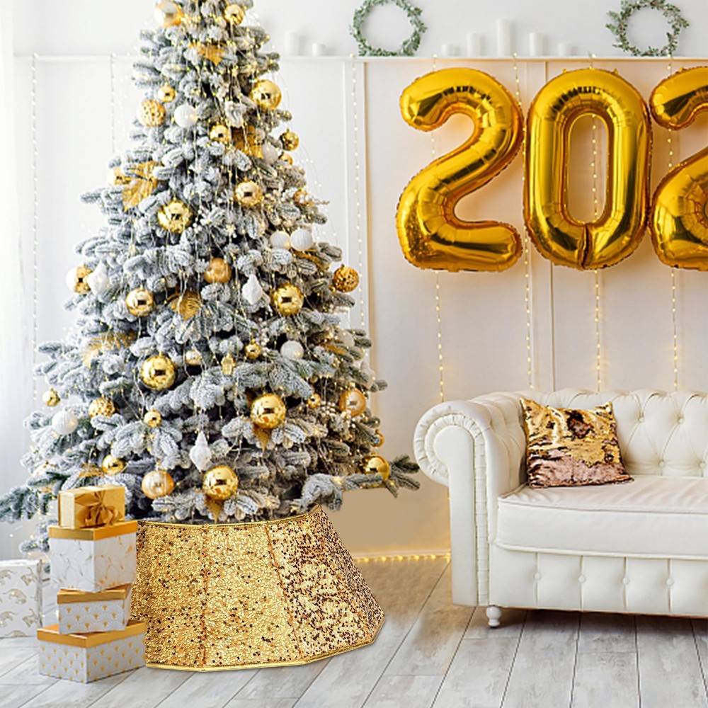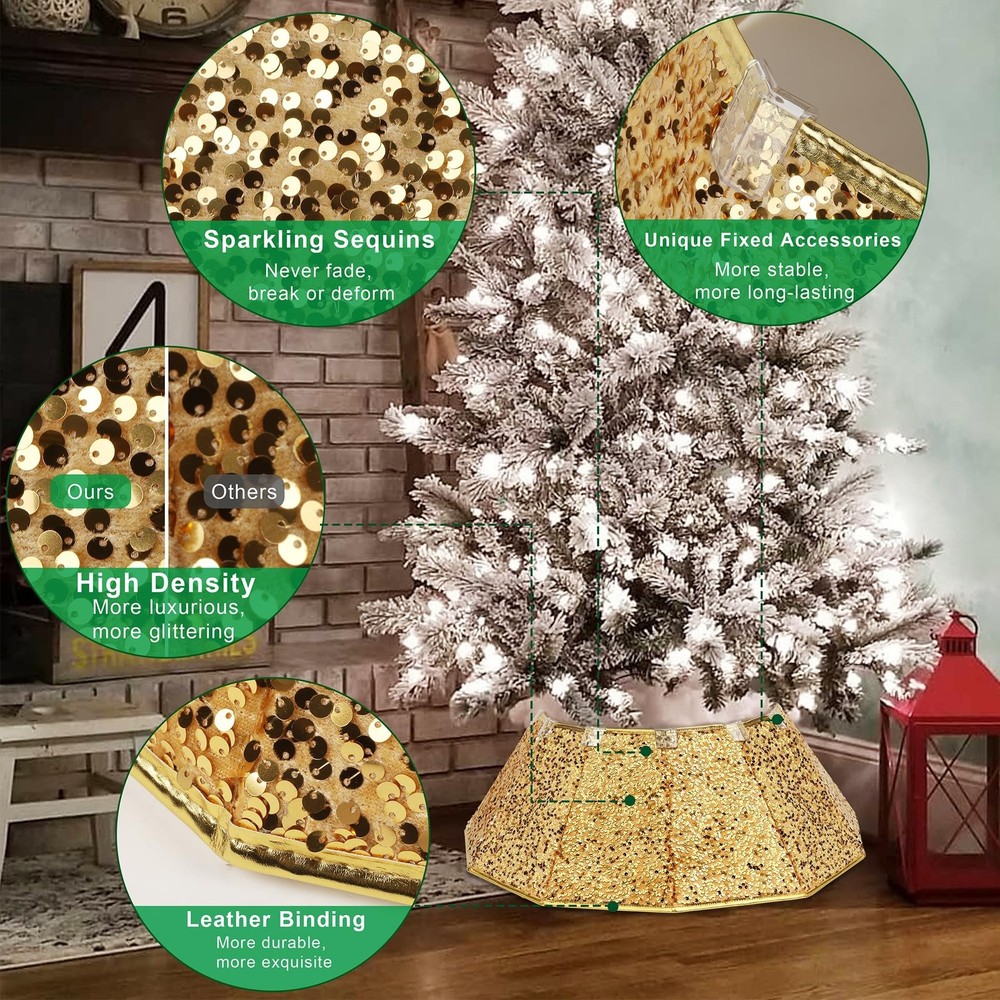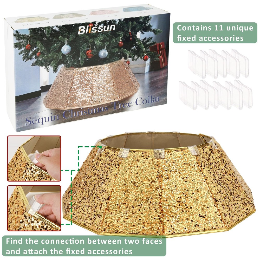 Christmas Tree Collar, Sequin Christmas Tree Skirt, Folable Christmas Tree Ring, Xmas Tree Stand Base Cover for Christmas Tree Decoration, Bright Gold GREAT MATERIAL: This fabric tree collar Christmas decorations consists of high quality polyester fiber, sequin and cardboard inside, sturdy enough for long lasting use. Golden sequins add the finishing touch to any tree. EASY ASSEMBLE: This Christmas tree ring comes in 1 piece, easy assembly by sticking Velcro. Contains 11 unique fixed accessories for extra stable, you no longer have to worry about your child or pet ruining the collar's shape. With the quick fold in no time after the holiday season is over, space saving storage guaranteed! ALTERNATIVE TO TRADITIONAL TREE SKIRTS: This fabric tree ring is a whole new twist on the traditional tree skirt, it completely hides the trunk of your Christmas tree while covering the tree stand, it's no appealing toy for toddlers, and there's no need to rearrange any cloth or get rid of the wrinkles. DIMENSIONS: 15 inch (top) diam. x 25.6 inch (bottom) diam. x 9.8 H inch. Fits for most standard size Christmas trees. We suggest that you measure your tree stand to ensure its fit within the collar. CHARMING CHRISTMAS DECOR: This round beautiful Christmas tree collar offers long-term durability and beautiful elegant style to step up your holiday decorations, adds a unique atmosphere to your home.