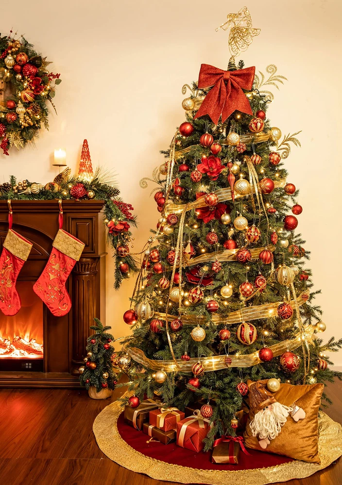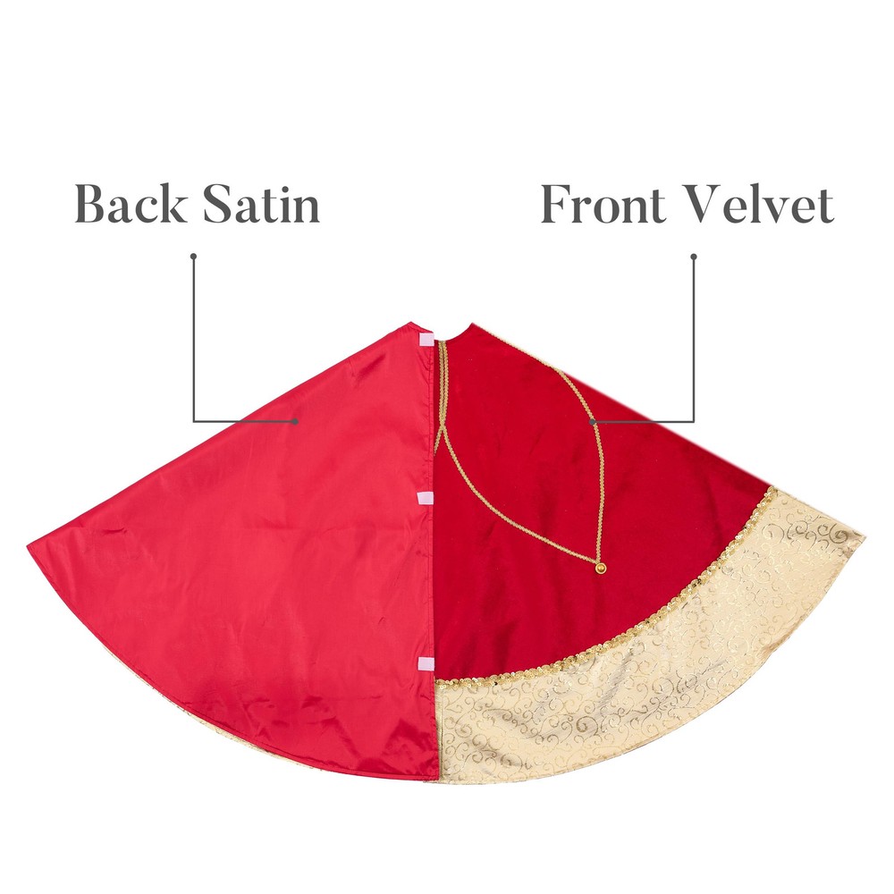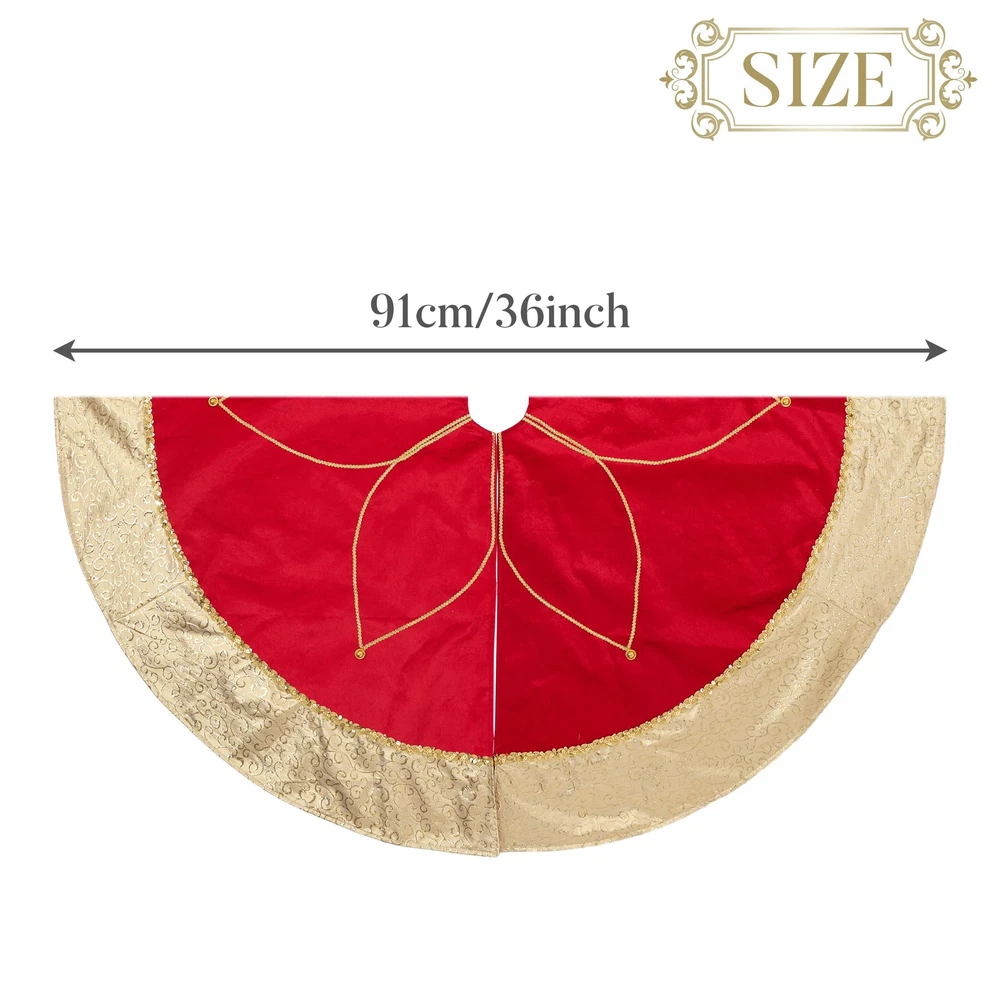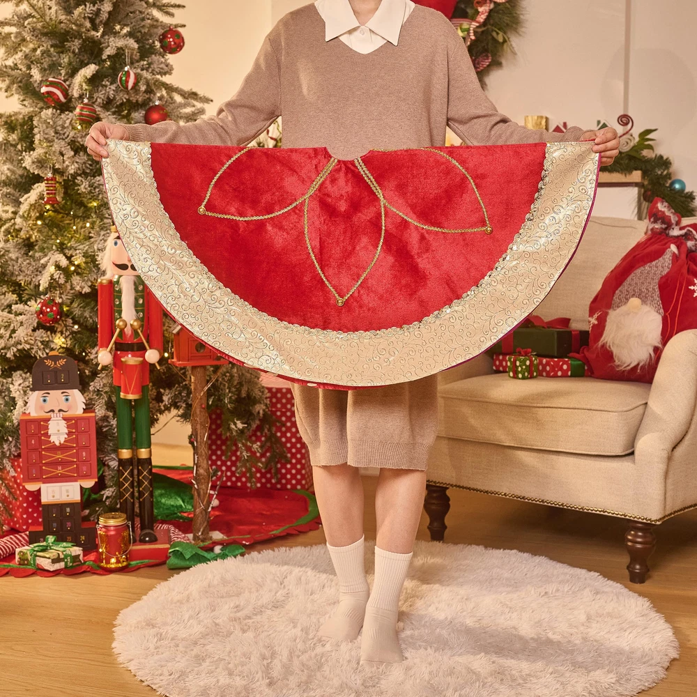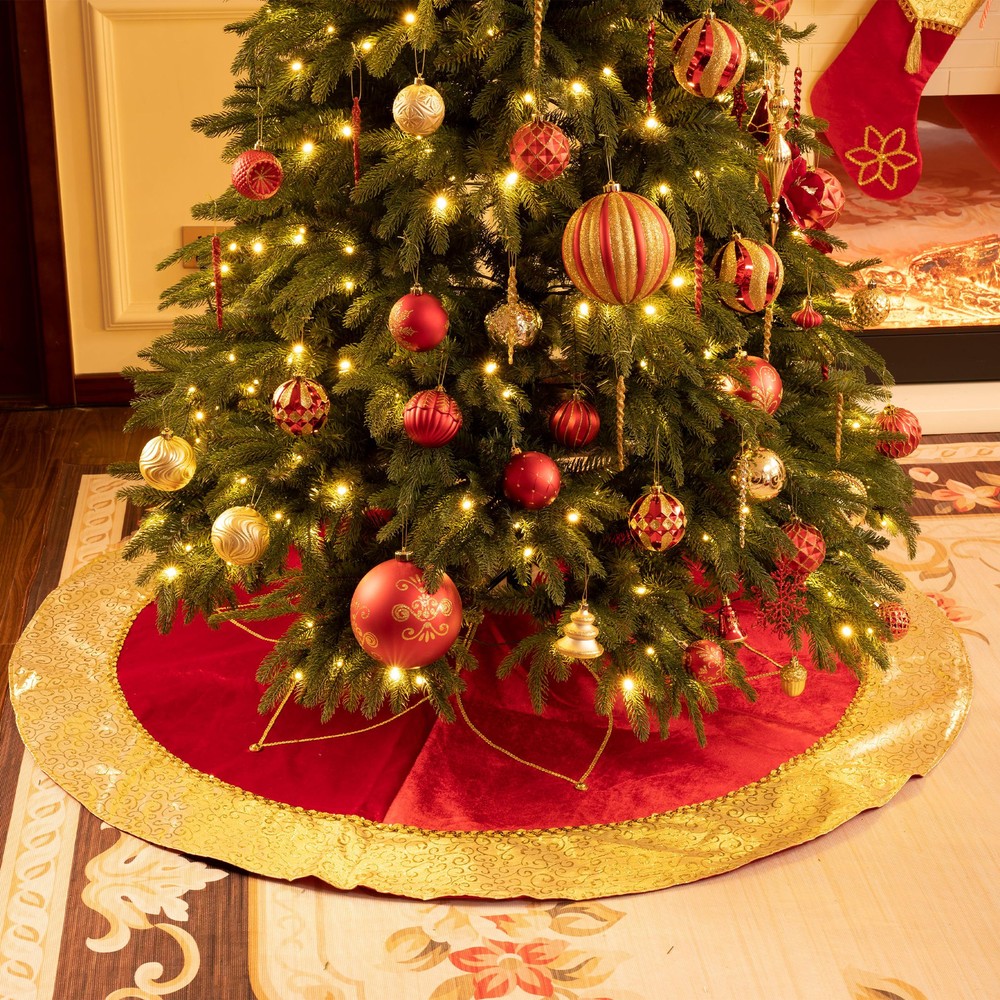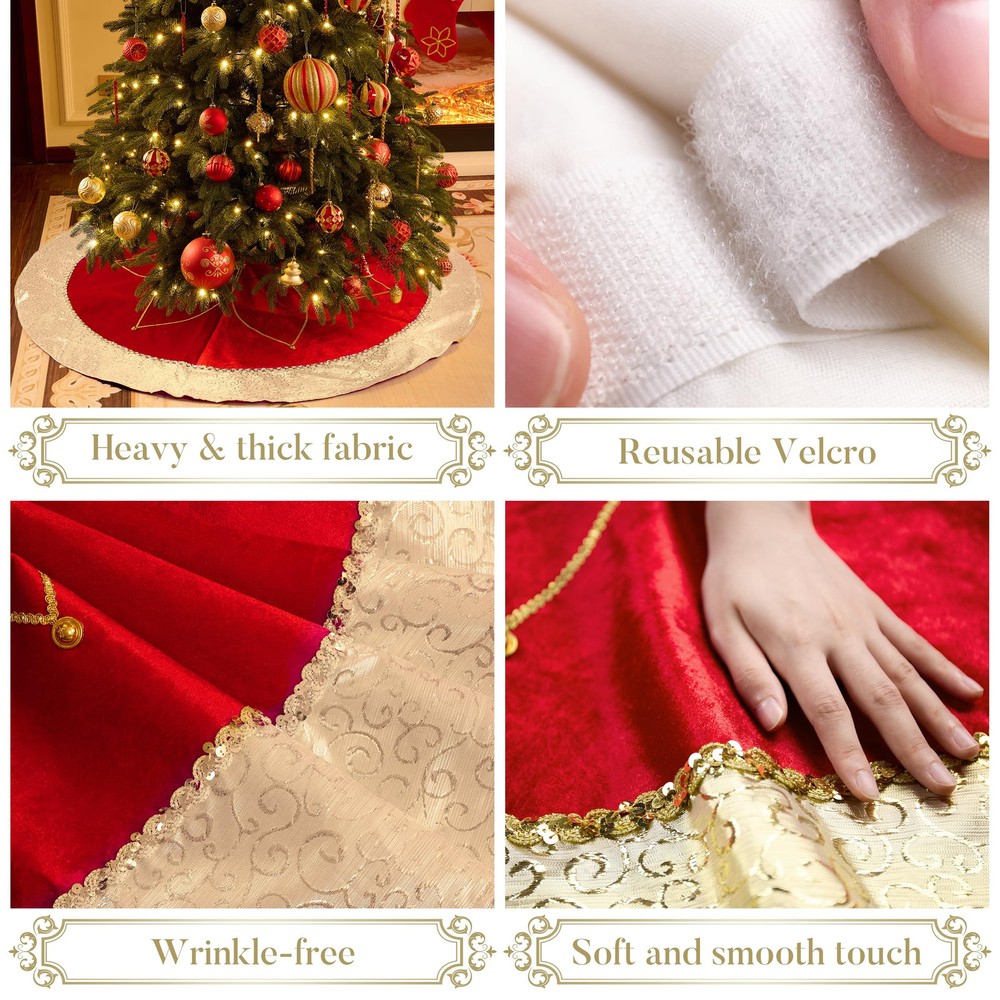 【Original Design】is a retail brand with an original design. Red meets gold, enchanting and bold. Merry moments they weave, adorning hearts and trees. 【Premium Quality】 This tree skirt decoration made of velvet cloth materials, with textured embroidery patterns, good breathability, durability and comfortable touch. It's perfect for families with children or pets. Note: not recommended for washing 【Exquisite Craftsmanship】Each tree skirt ornaments is carefully selected from a variety of fabrics by professional designers and then sews by hand. The velcro opening is easy to decorate. Use special handicrafts to make your Christmas look more festive. 【Size】The tree skirt measures 48 inches/120 centimeters, which is suitable for 6ft and 8ft Christmas trees. It can also accommodate gift boxes and serve as a playful area for your pets under the Christmas tree. 【Long-lasting】This tree skirt is heavier compared to most, ensuring it stays in place once positioned under the Christmas tree. Its exceptional durability allows for extended use over many years, especially when stored properly.