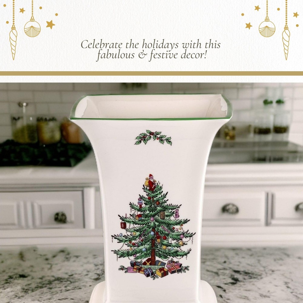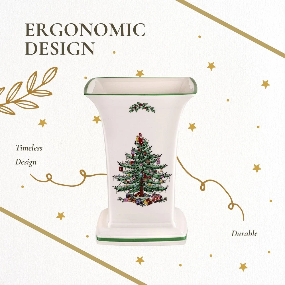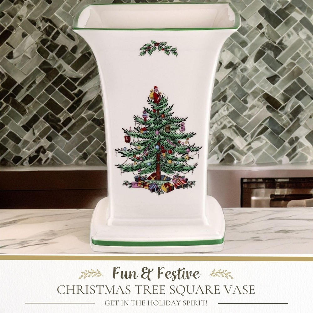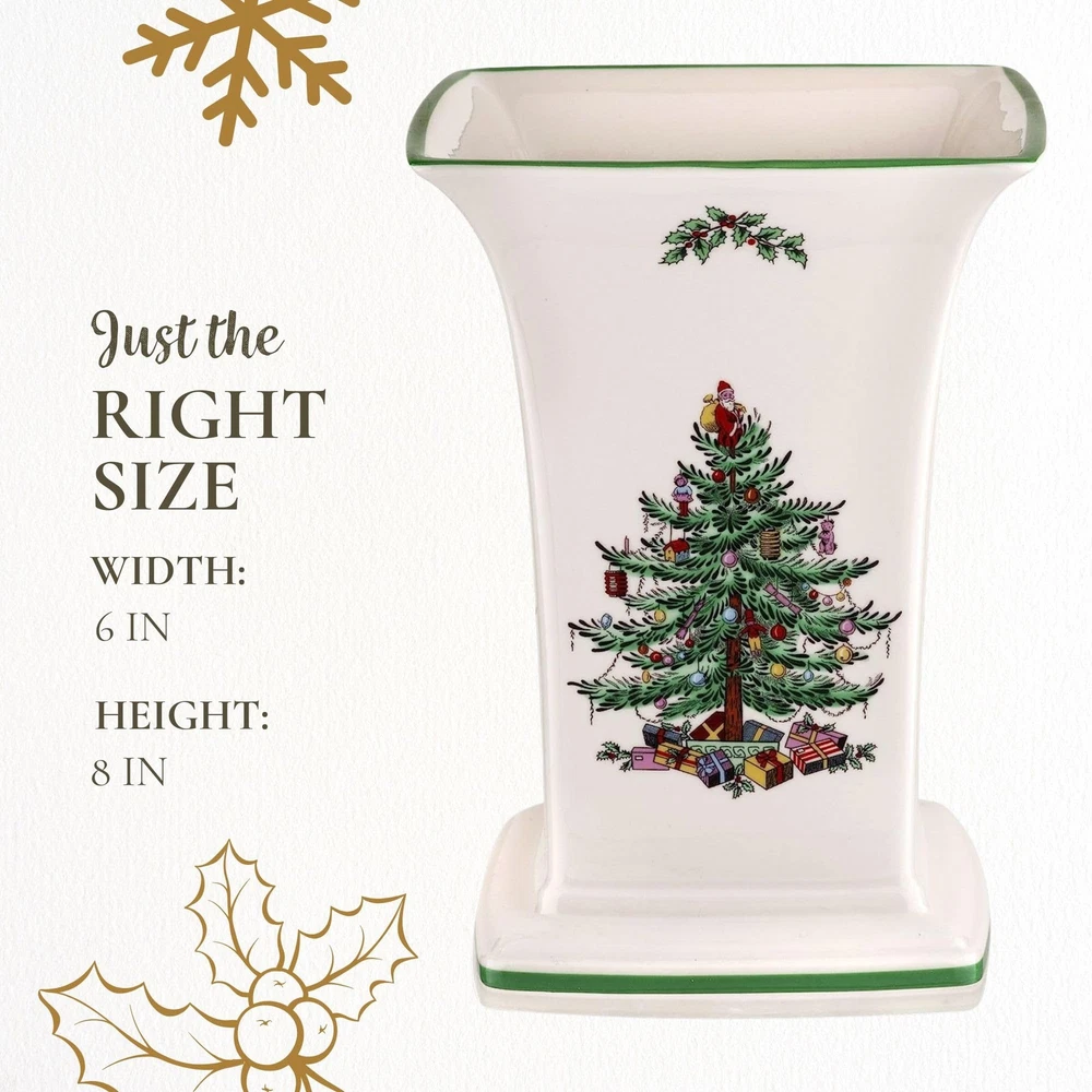 Versatile Holiday Centerpiece: This 8-inch Christmas vase serves as a stunning holiday table centerpiece or mantel accent. Ideal for holiday floral arrangements, it adds a festive flourish to any room, enhancing your holiday decor with elegance. Fine Earthenware: This holiday vase offers lasting durability and a classic look. Its craftsmanship ensures a refined design that enhances your seasonal decor while maintaining a sense of tradition and style. Christmas Tree Tradition: This design has been adorning homes since 1938, featuring ’s renowned green-banded Christmas tree pattern, this vase for holiday decor brings nostalgic charm and grace to your home. Christmas Table Centerpiece: This square-shaped holiday vase accommodates large winter floral arrangements, offering plenty of room for seasonal decorative accents and holiday blooms. Convenient Cleaning: This holiday centerpiece vase is dishwasher safe, ensuring easy cleanup after festive gatherings. Its durable construction makes it a practical choice for busy holiday celebrations.