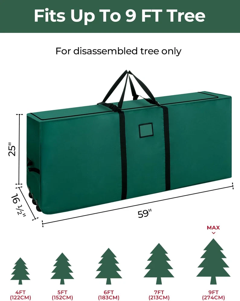 Product Dimensions: 59"L x 16.5"W x 25"H Material Type: 600D Oxford Number of Sets: 1 Material: 600D Oxford Special Feature: Portable UPC: 726084270138 Closure Type: Zipper Number of Items: 1 gtin13: 726084270138 Additional Features: Portable Item Dimensions L x W x H: 59"L x 16.5"W x 25"H Brand: Does not apply Color: Green Type: Does not apply Size: 9 ft (With Wheels) Shape: Rectangular Recommended Uses For Product: Christmas tree