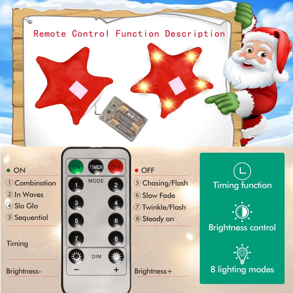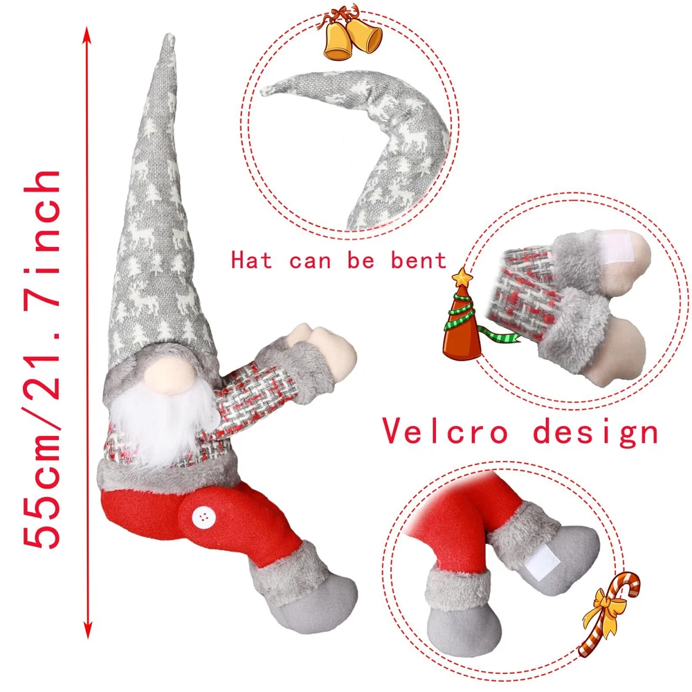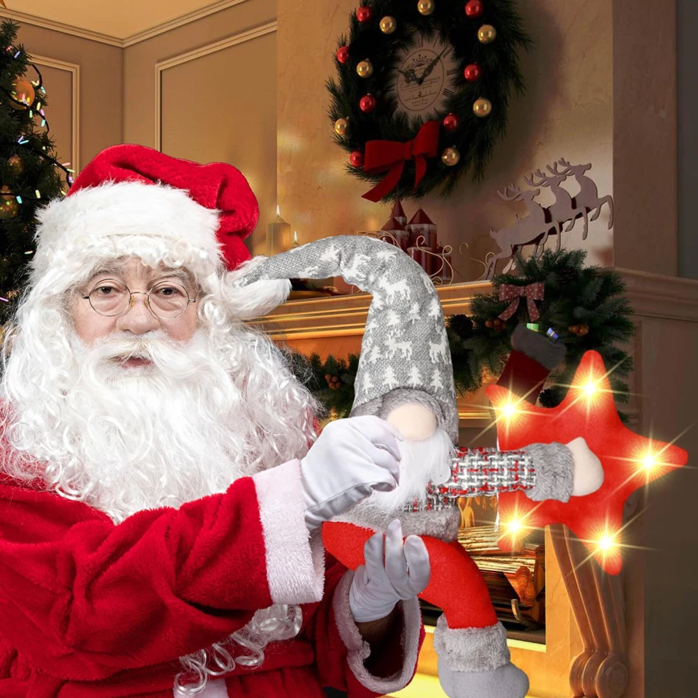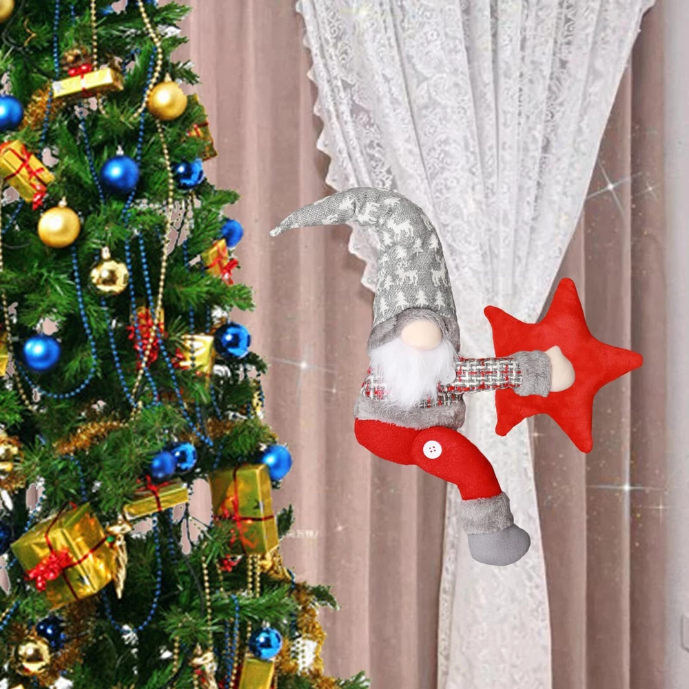 Christmas Tree Topper Gnome Decorations With Lights,21.7 Inches Handmade Embrace Christmas Tree Gnome With Lighted Star,Christmas Home Decor Curtain Tie Wine Bottle Decoration(Grey hat) Christmas tree topper lighted: This Funny Scandinavian gnome plush has a long white elegant beard, The Grey hat is printed with a Christmas tree and elk pattern, extra soft flexible and adjustable hands legs, red stars that support 8 modes of illumination.bring you and your family more warmth this winter Unique Funny Christmas Tree Topper Gnome:This glowing dwarf Christmas tree decor features a dwarf who is 21.7 inches tall and 9.5 inches wide.diameter of the stars is 7 inches. The dwarf has Velcro on his hands and legs, making it easy for him to hug the top of the Christmas tree. The knitted hat of the Christmas dwarf is equipped with flexible metal wires inside, allowing you to freely pose in different positions Support remote control operation: The glow function of the Christmas Tree Top Star Dwarf decoration is on his grey star. Simply open the zipper to remove the battery box and insert three AAA batteries (not included) to glow! Remote operation supports 8 modes, such as constant light mode, flashing mode, alternating mode, etc; Simultaneously adjustable brightness and timing function! It can also be operated directly from the battery box button Not only is it Christmas tree decoration: This elegant Christmas gnome decoration can help you pull the curtains and let winter sunshine enter your room, bringing you warmth. He can also hold a red wine bottle and celebrate this festive holiday with you and your family! On winter nights, glowing dwarfs can bring warmth to your body and soul, as well as to your family. Light up your winter Christmas present:You can give it as a gift for Christmas, Halloween, and New Year to your family and friends, expressing your blessings to them!Our commitment: If you have any problems after receiving the Gnome Tree Topper, such as the loss of the battery back cover, defective goods, lights not working or other dissatisfaction, you can contact us immediately, and we will help you solve the problem quickly and friendly