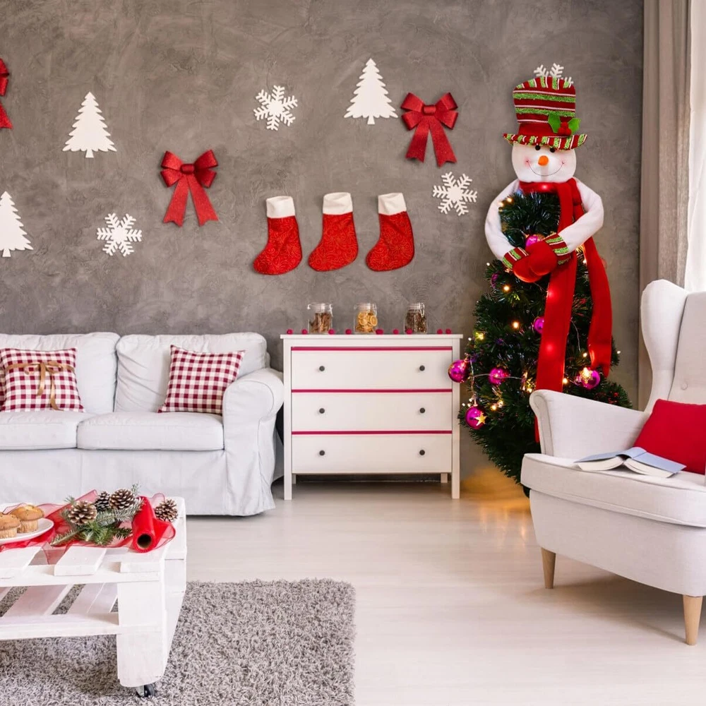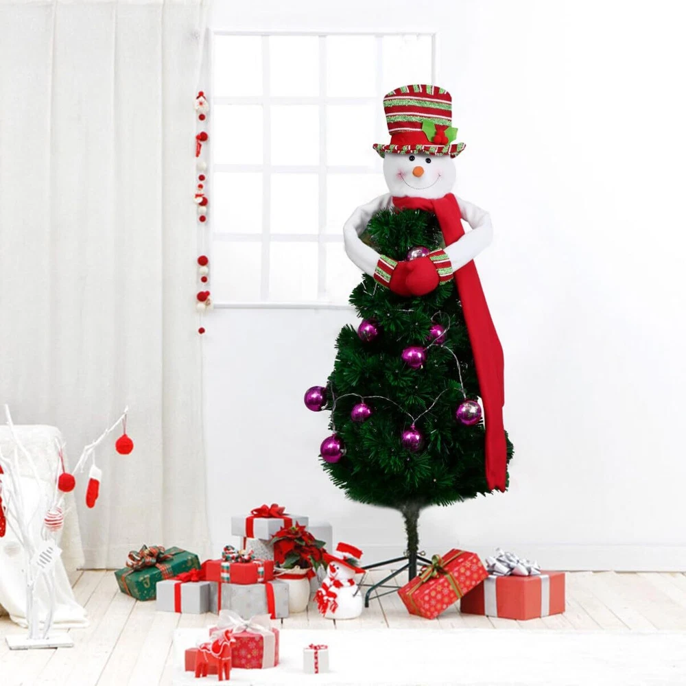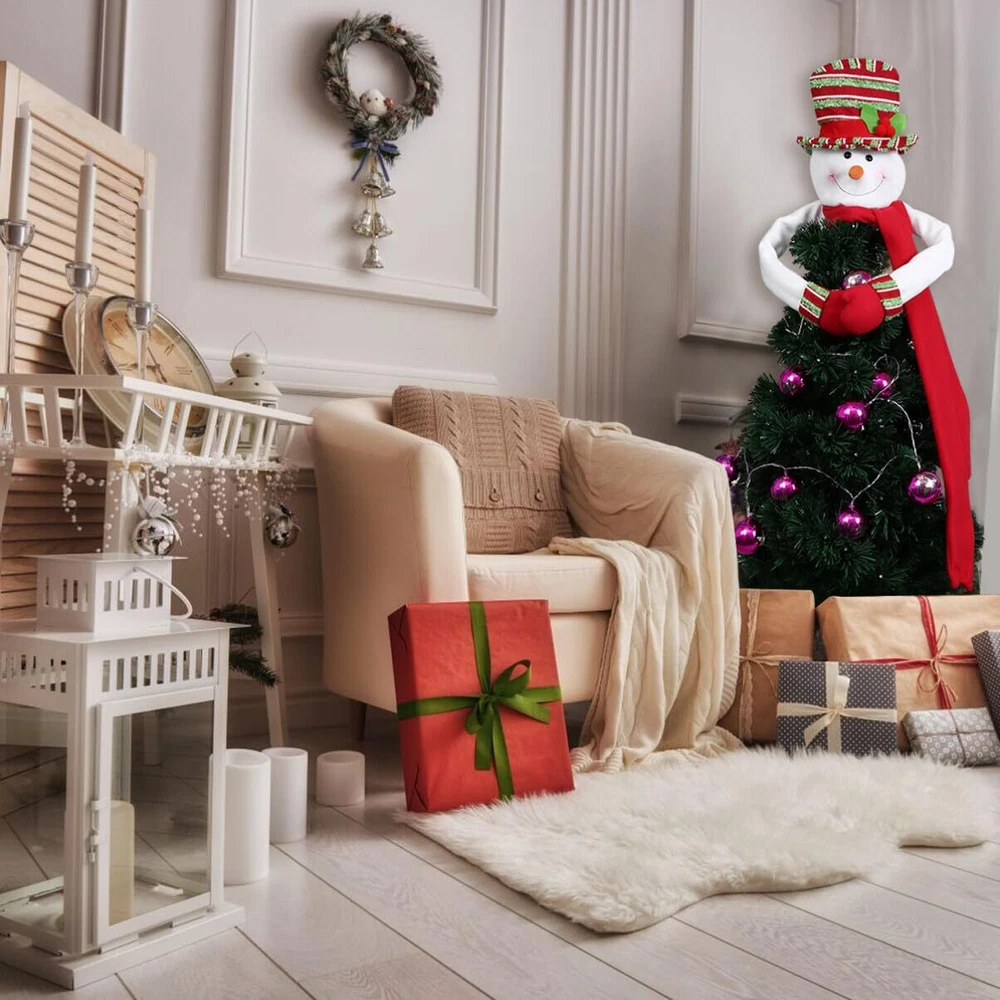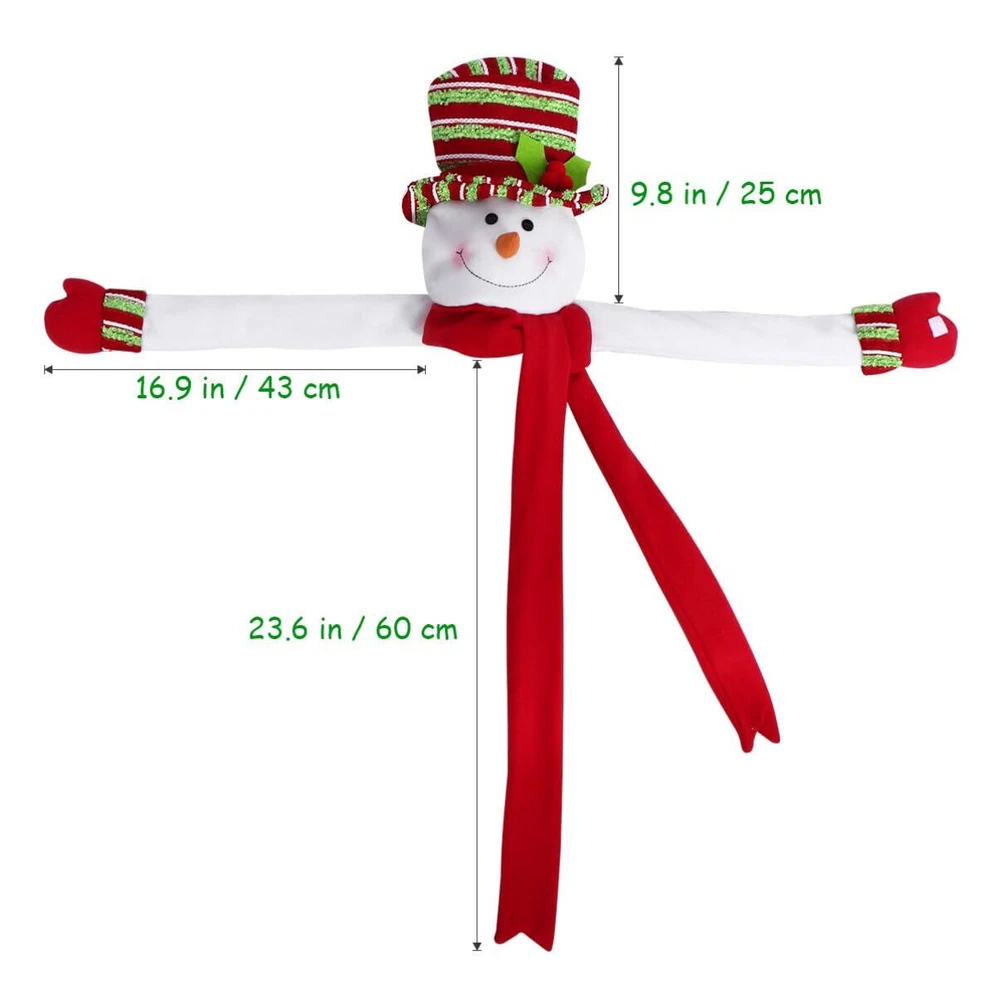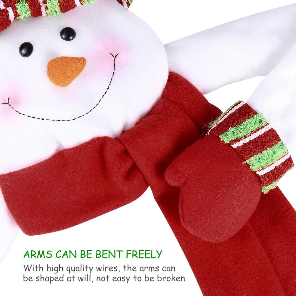 Christmas is just around the corner! Do you want to give a finishing touch for your Christmas tree? Our fantastic Snowman Tree Topper is going to give you a warm and nice holiday. The snowman has always been an essential element of Christmas. What a wonderful thing when our Christmas Tree Topper appeared on the top of your Christmas tree: Cheerful snowman sits atop your tree and wraps his long arms around it in a festive hug. Although it looks like a simple Christmas snowman hat, if you just stuff the top of Christmas tree into the head and hat for it to stand upright, it will looks absolutely beautiful and helps you to create a wonderful festive atmosphere. The colorful tree topper measures 42.5"*34.6"*1.8" / 108*88*4.5cm. Material: Non-woven fabric Note: - Hand wash only - Do not bleach - Do not tumble dry - Do not iron π EASILY FIXED TO CHRISTMAS TREE. Comes with elastic band in the sleeves, so it's will be more tighter and harder to fall when you put this cute tree hugger on the top of the Xmas tree. π PERFECT SIZE FOR CHRISTMAS DECOR. Measurement - Snowman face & hat: 9.8" H. Arms: 39.4" L. Scarf : 23.6" L. It's the perfect size to highlight up your plain or dressed tree. And also act as a indispensable Christmas ornament at shopping malls, work spaces, family gatherings, banquets, etc. or use it outdoor for DIY. π A VIVID AND COLORFUL LOOK. Different from the traditional black hat, the snowman wears a red-green striped hat, which will undoubtedly add more joyful atmosphere to Christmas. Also, the hat is stuffed enough to make the snowman full of three-dimensional. π HIGH QUALITY MATERIAL. The fabric of this topper is thickened to make it feel more textured. The arm is made of high quality iron, which is easy to twist and fix product shape (There's also a hook and loop on the palm), and is not easy to break. π MERRY CHRISTMAS - We worked hard to make festival items for adults and kids to come into life. If you are not satisfied with this item, just please contact us. we will try best to help you.