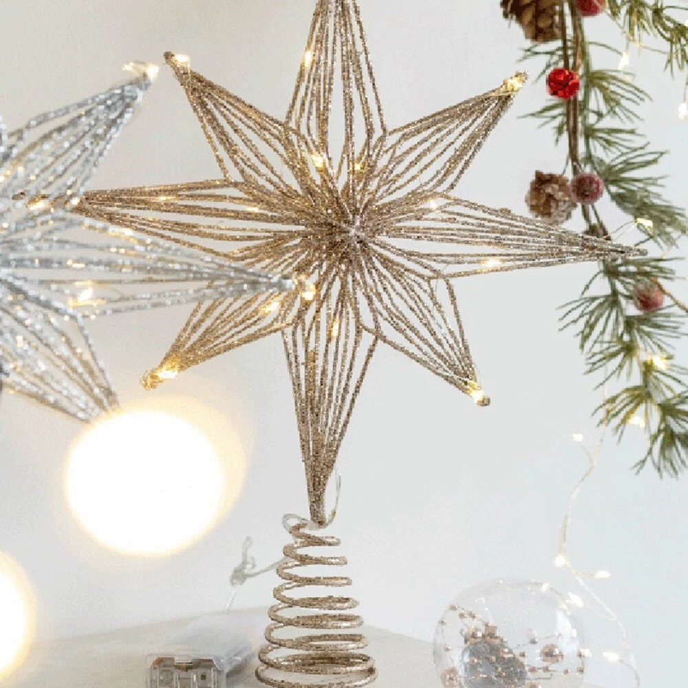 Christmas Tree Toppers Star LED Lamp Home Christmas Decorations for Tree7723 Illuminated your Christmas tree with our exquisite Tree Toppers. This beautifully designed decoration features a glowing star that creates a warm and festive perfect for celebrating the holiday season. Star ornament placed on the Christmas tree can add lot of festive to Christmas. Add nice and elegant style to your Christmas tree and make your home more beautiful. Very and stable, which means you can store it when you do not need and use it again in next Christmas. Suitable for company, shopping mall, restaurant, school, add strong Christmas to your , It can also be given as gift for your friend or family.Note: The actual product does not contain batteries, you need to bring 2 AA batteries size: 25 x 32CM Material: iron colour: Champagne Gold Package Contents: 1 x Christmas Tree Toppers Star LED Light Only the above package content, other products are not included. Note: Light reflection and different displays may cause the color of the item in the picture a little different from the real thing. The measurement allowed error is +/- 1-3cm.