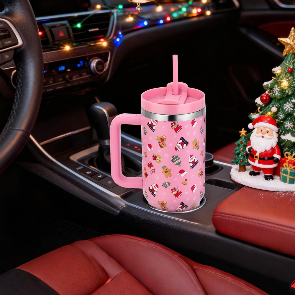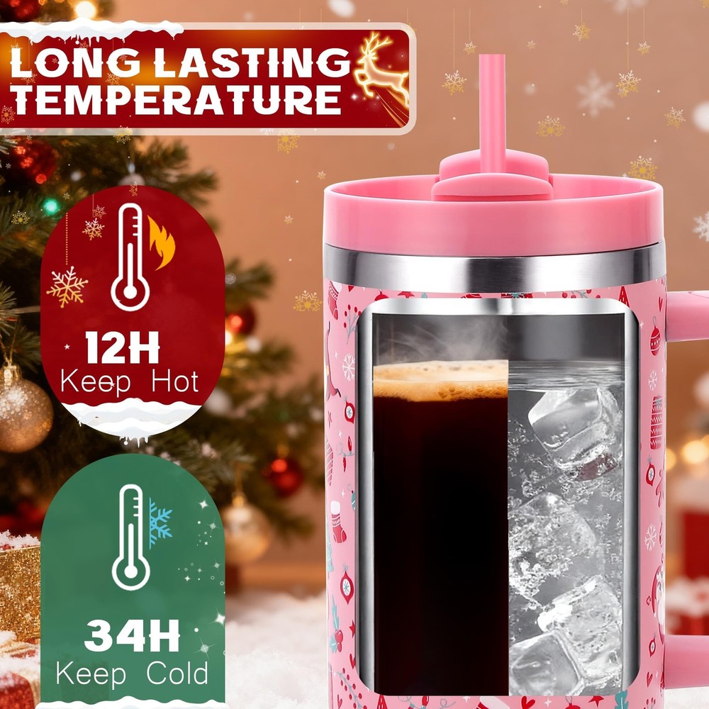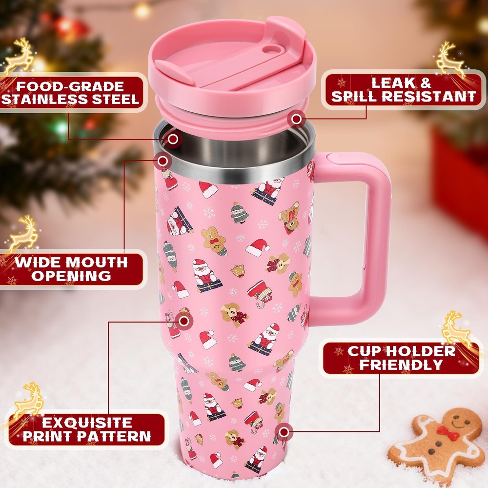 Christmas Tumblers Gifts for Women Mom Daughters, 40 oz Christmas Tumbler with Handle and Straw Lid, Xmas Stainless Steel Insulated Travel Mug Cup, Keep Cold for 34 Hours (Pink Santa Bear) Product Details Color: B Pink Christmas Bear Brand: Skywerc UPC: 717308556091 EAN: 0717308556091 MPN: Does not apply Brand: Skywerc Color: B Pink Christmas Bear Special Feature: Leak Proof, Lightweight, Vacuum Insulated Style: Modern Theme: Christmas, Holiday Brand: Skywerc Color: B Pink Christmas Bear Special Feature: Leak Proof, Lightweight, Vacuum Insulated Style: Modern Theme: Christmas, Holiday Recommended Uses For Product: Home, Travel Included Components: Lid, Straw, Handle, Brush, Gift Tag, Gift Box Specific Uses For Product: Cold Drinks, Hot Drinks Shape: Cylindrical Product Care Instructions: Hand Wash Only Material Feature: Insulated Reusability: Reusable Item Weight: 1.43 Pounds Material Type Free: BPA Free Number of Items: 1 UPC: 717308556091 Size: 40 Ounces Package Dimensions: 11.3 x 6.14 x 4.49 inches Item Weight: 1.43 pounds Date First Available: August 16, 2025 CHRISTMAS CUP SET: This set includes 1 x christmas tumbler with handle, 1 x 2 in 1 lid, 2 x straws, 1x straw brush, 1 x christmas gift tag and 1 x gift box. Each cup is adorned with exquisite Christmas patterns, that adds a touch of holiday spirit to your drinkware collection. IDEAL CHRISTMAS GIFT CHOICE: There are various patterns for you to choose from these Christmas water tumblers, such as Santa Claus, shining stars,and Gingerbread man, etc. Don't miss this Christmas tumbler that combines style, functionality, and a festive atmosphere. Give it to your family and friends! ALL DAY INSULATION: Unique triple-walled insulated technology allows our 40 oz christmas tumbler to keep drink cold for 34 hours and hot up to 10 hours, which allows you to enjoy your hot/cold drinks anytime. PREMIUM MATERIAL: Skywerc Christmas insulated tumbler is made of 18/8 food grade stainless steel, easy to clean with large diameter, BPA free and non-toxic which ensures the health and safety of your drinks. CUPHOLDER FRIENDLY: Slim tapered bottom design allows this Christmas mug to fit in all standard car cup holders, whether you are driving to work or travel, take it with you wherever. ERGONOMIC HANDLE: This xmas tumbler has an ergonomically designed handle and easy to carry, even when held for extended periods without fatigue, ideal for travel, work, or outdoor activities.