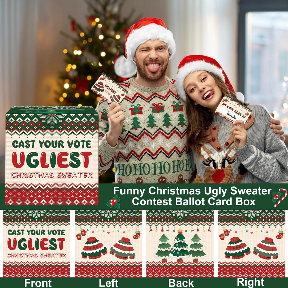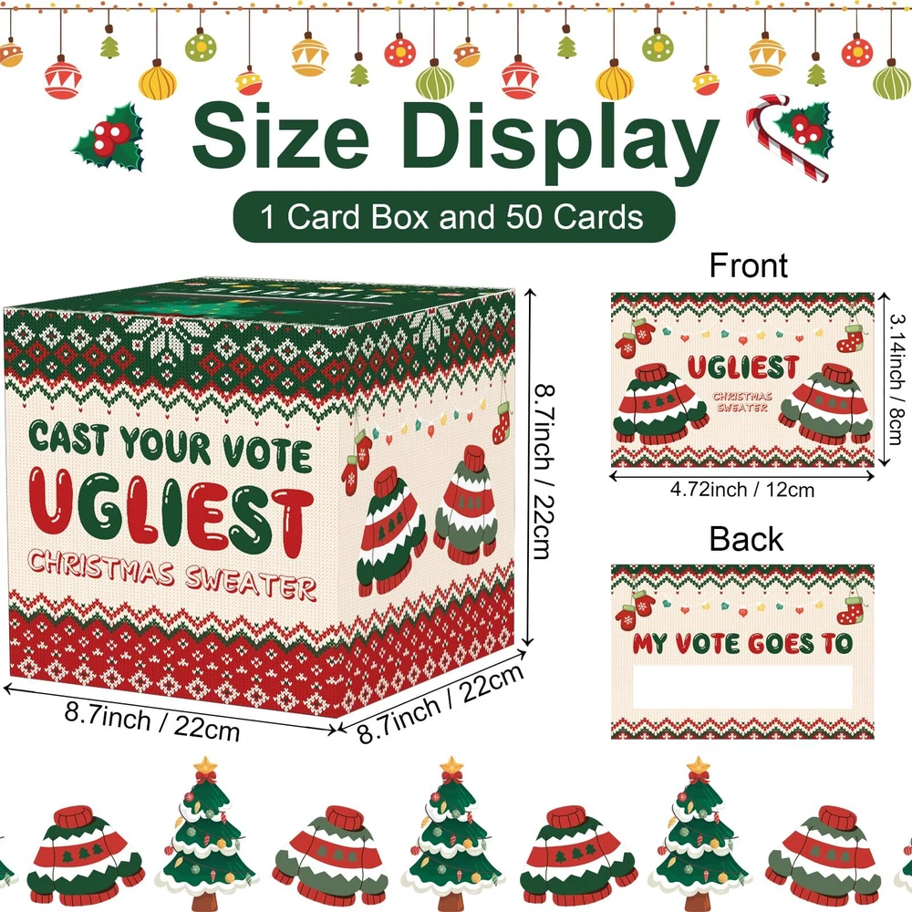 【Christmas Ugly Sweater Card Box Set】The set comes with 1 Christmas ugly sweater contest ballot card box (8.7 x 8.7 x 8.7 inches) and 50 pieces of ballot voting cards (4.72 x 3.14 inches). Each card is double-sided, one side is Christmas ugly sweater and the other side is for guests to vote. Ugly sweater designs add more fun to your Christmas party 【Made of Thick Cardboard】Our Christmas ugly sweater contest ballot card box is made of thick cardboard, which is stronger and more reliable. And the outer layer of the box is covered with a smooth film to prevent it from getting stained, making the box more vivid and colorful. The Christmas ugly sweater elements patterns will impress everyone guests 【How To Play?】Tell guests to write down the name of the person wearing the ugliest sweater. Have them put their cards in the Christmas ugly sweater contest ballot card box. Finally, the person with the most votes is the winner 【Christmas Ugly Sweater Design】Christmas Ugly Sweater and Christmas tree elements are printed on the surface of the box, 'CAST YOUR VOTE UGLIEST CHRISTMAS SWEATER' is printed on the front of the box. All backgrounds are designed with Christmas elements. The Christmas ugly sweater contest ballot card box has a slot on the top and the pattern design can give guests a bright effect! The unique design can also be the icing on the cake for your Christmas party 【Easy to Assemble】Christmas decorative voting card box is very easy to use. The unique foldable design is easy to assemble and use, which will also save a lot of storage area. Let the Christmas decorative voting card box add more excitement to your Christmas party!