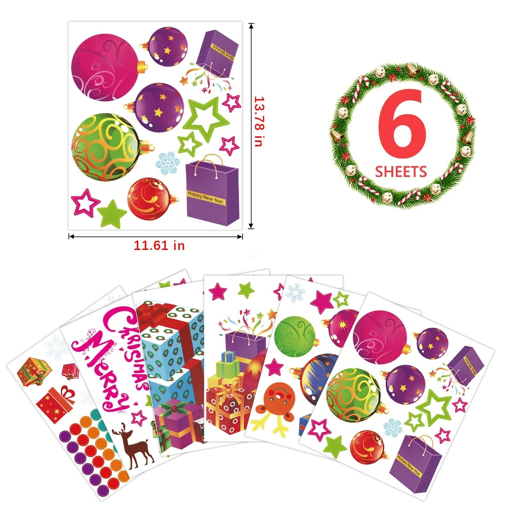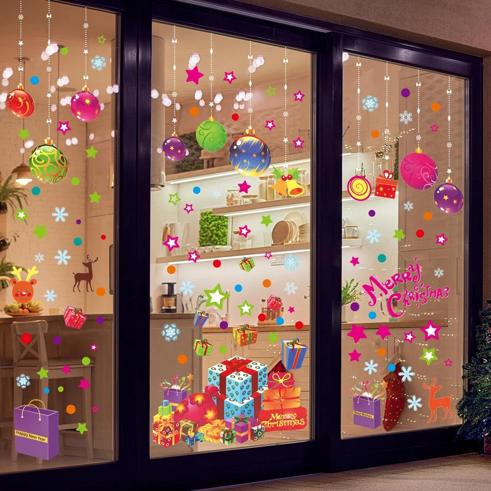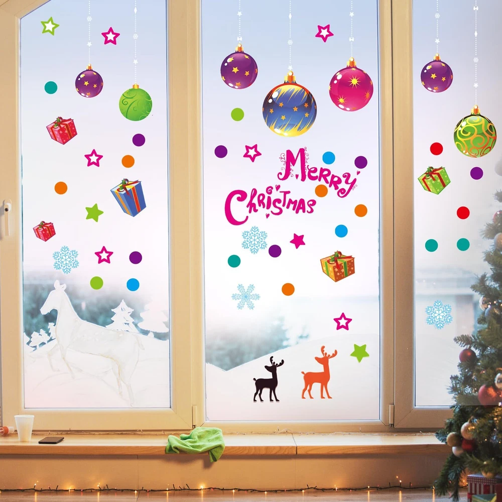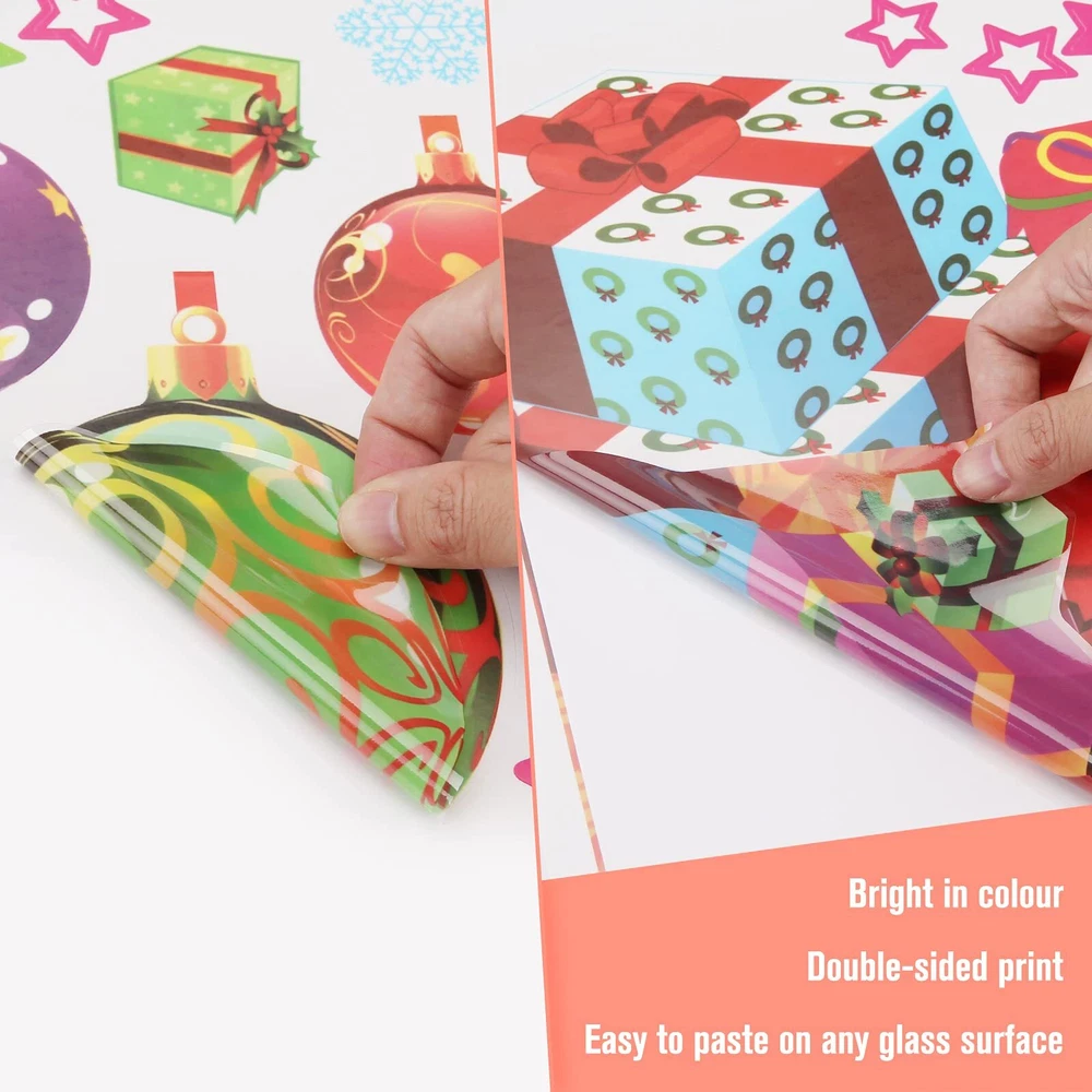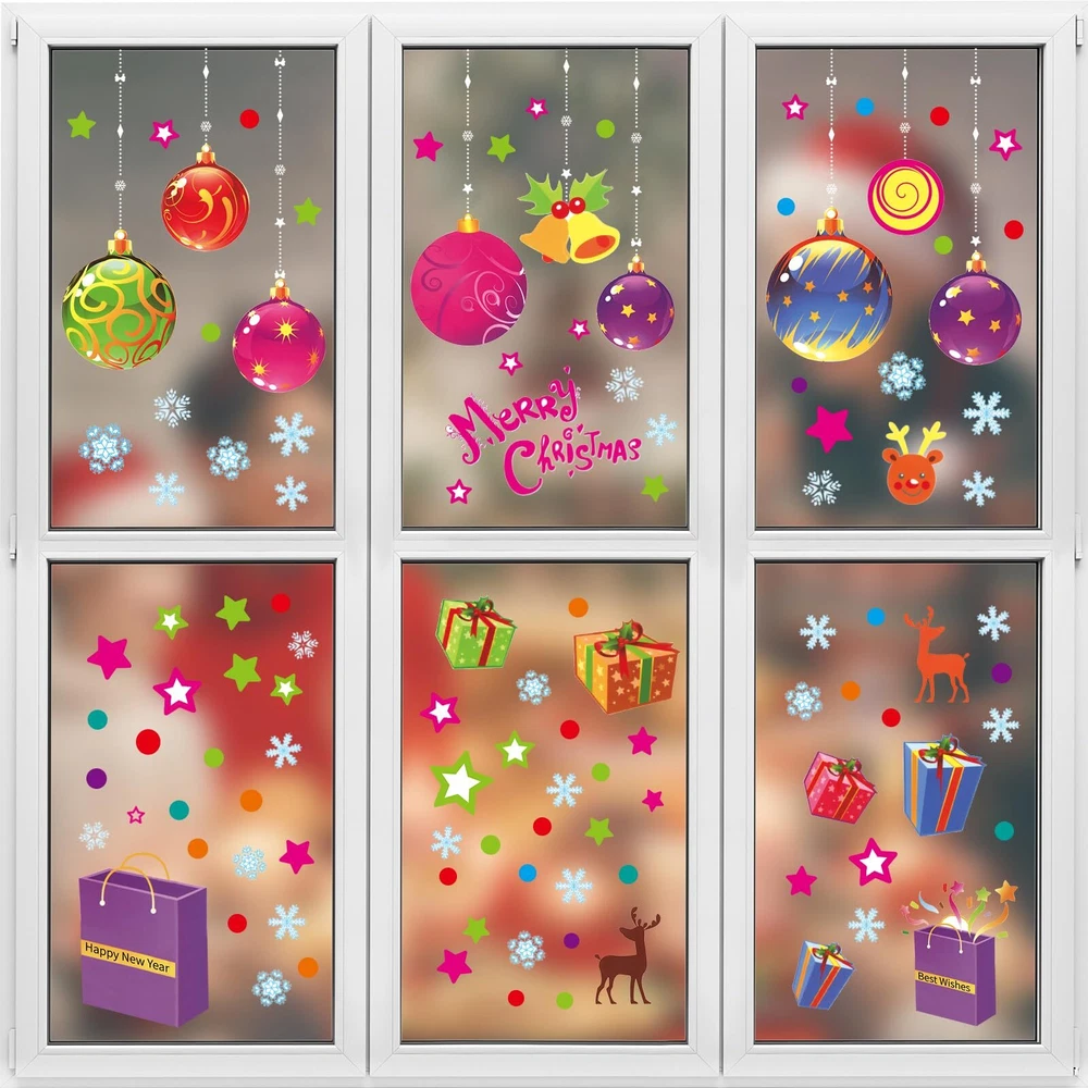 CHRISTMAS DECORATION SET: Come in 6 sheets (13.78 x 11.61 IN each). Package contains 118 PCS colorful window clings, including Christmas balls, ribbons, snowflakes, dots, stars, gift boxes, reindeer, bell, season’s greetings, etc. DOUBLE-SIDED PRINT: These static clings are made of non-toxic PVC, no adhesive, waterproof, environmentally friendly, reusable and removable. You can see the same visual effect and the same bright colors on both sides. CARTOON DESIGN: Cute patterns with multiple colors will bring a more unique style to your living space. Start your party. This winter is colorful and joyous. PERFECT ADDITION FOR XMAS DECOR: Your kids or friends will feel fun and satisfied when they use these Christmas gifts to decorate this winter holiday. These creative and practical art decals will make your Gift Themed Party look great, too. They can be used for windows, glass doors, mirrors, refrigerator, flat tiles, glass surface decoration of home school office coffee shop during Christmas. EASY TO USE: Wipe with a damp cloth or wet the glass surface with water before use to make the static sticker adhere to the surface well. Squeeze out the air bubbles, and then confirm that the edges are firmly attached. No glue, removable clings without damage and residue. Remove gently for recycling and reuse.