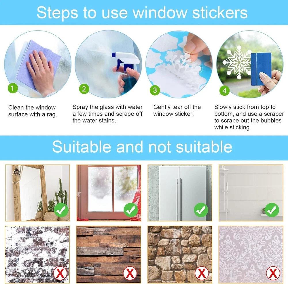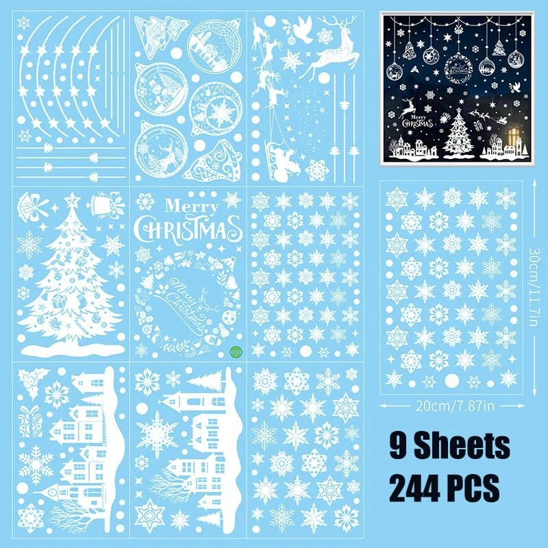 244Pcs Christmas Snowflake Decal Stickers Window Clings Decorations for Christmas Frozen Theme Party New Year Supplies Fun way with kids and children together. WHY CHOOSE CHRISTMAS WINDOW CLINGS ? They have NO adhesive! Simply wet the glass ! These amazing little things stick to your windows.. then peel off without damaging the glass OR the cling! Reusable They're reusable so you can store them for use each year! Just save the backing they came on and store them flat and in a cool place. The Double-Side decorations These window clings have Double-Side patterns, the means that you can see him when you stick them on the window, no matter indoor or outdoor. Gift Choice These Christmas window stickers will be good gifts for our kids, they can decorate it on window with all kinds of snowflakes and Create a winter wonderland. SPECIFICATIONS: Material: Polyester Style: Christmas window stickers WHAT YOU GET: 244 snowflake window stickers in 9 sheets included.Each is 11.8"x 8.6". They are all in white. To know more about the product, the packaging and return policy, please don’t hesitate to contact us. Electrostatic Sticker Series:Frozen snowflake Theme---Each theme has a scene template. You can follow our scene template or design freely. Fun way with your kids together:All kids love putting Christmas clings for windows.These Christmas Window Clings will be a joy to them as well as a wonderful part of their the upcoming holiday season. No any residue: They have NO adhesive! Simply wet the glass !These amazing little things stick to your windows.. then peel off without damaging the glass or the cling! Reusable:Our Christmas windows clings is just right for naughty children. Stick them again and again.The most economical way to add more fun for your children Quantity & Measurement:244 snowflake window stickers in 9 sheets included.Each is 11.8"x 8.6". They are all in white. Buy with confidence:customer service will provide you with 100% satisfactory window sticker service. If you have any help, please feel free to contact us. Your satisfaction is our top priority. For more Day party supplies, please visit brand window clings store.