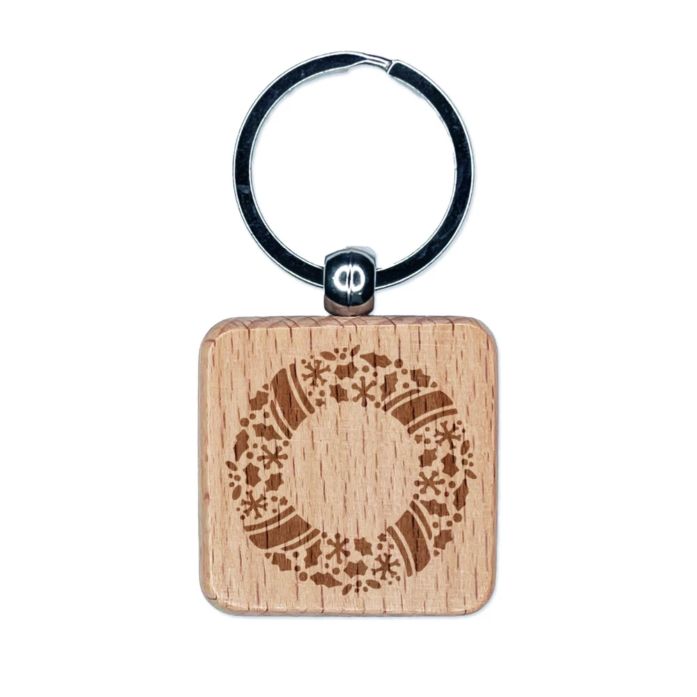 Christmas Wreath Detailed Engraved Wood Square Keychain Tag Charm