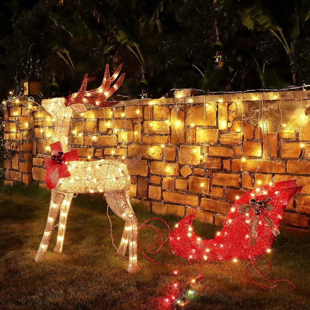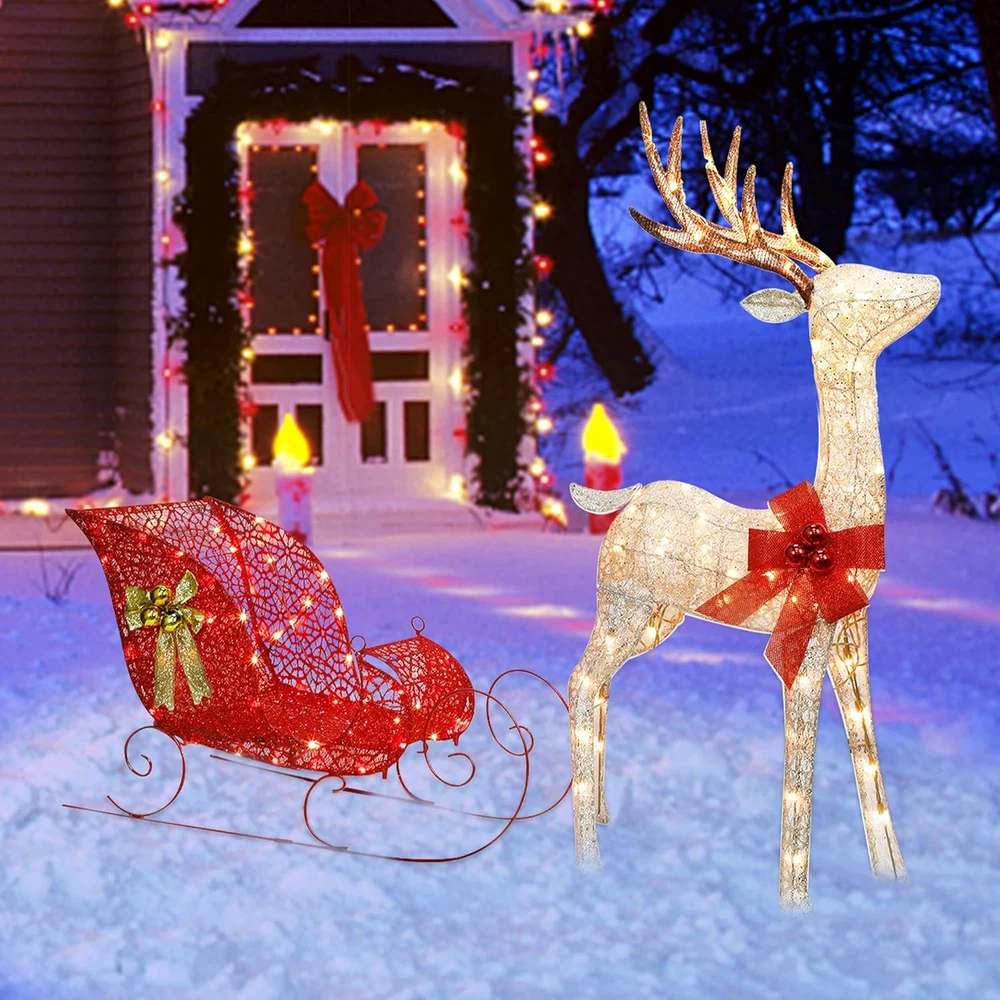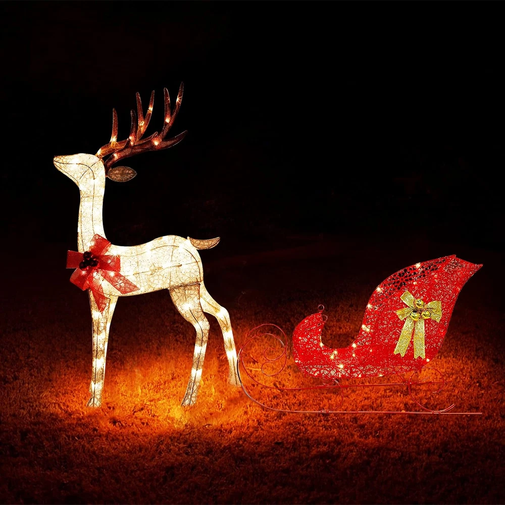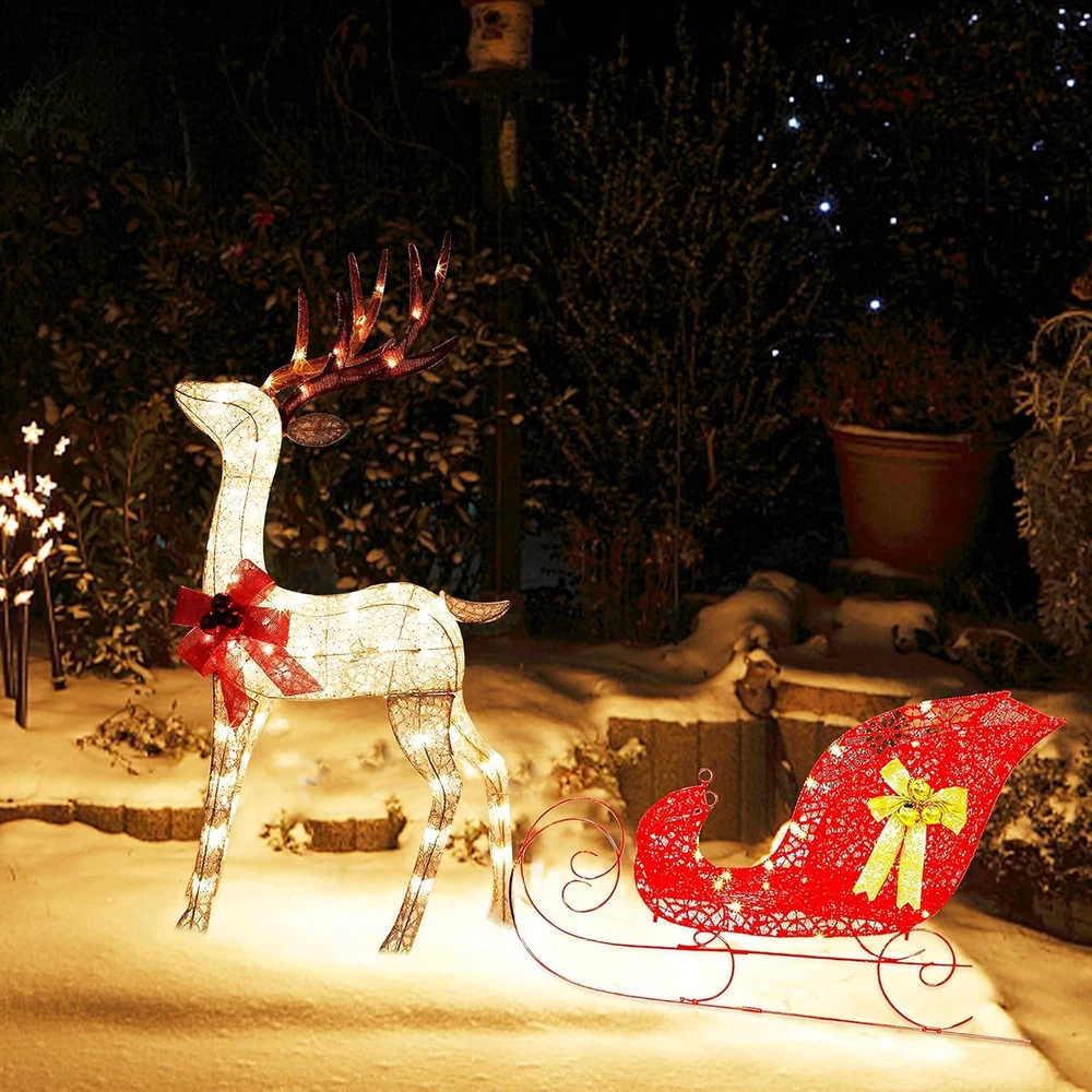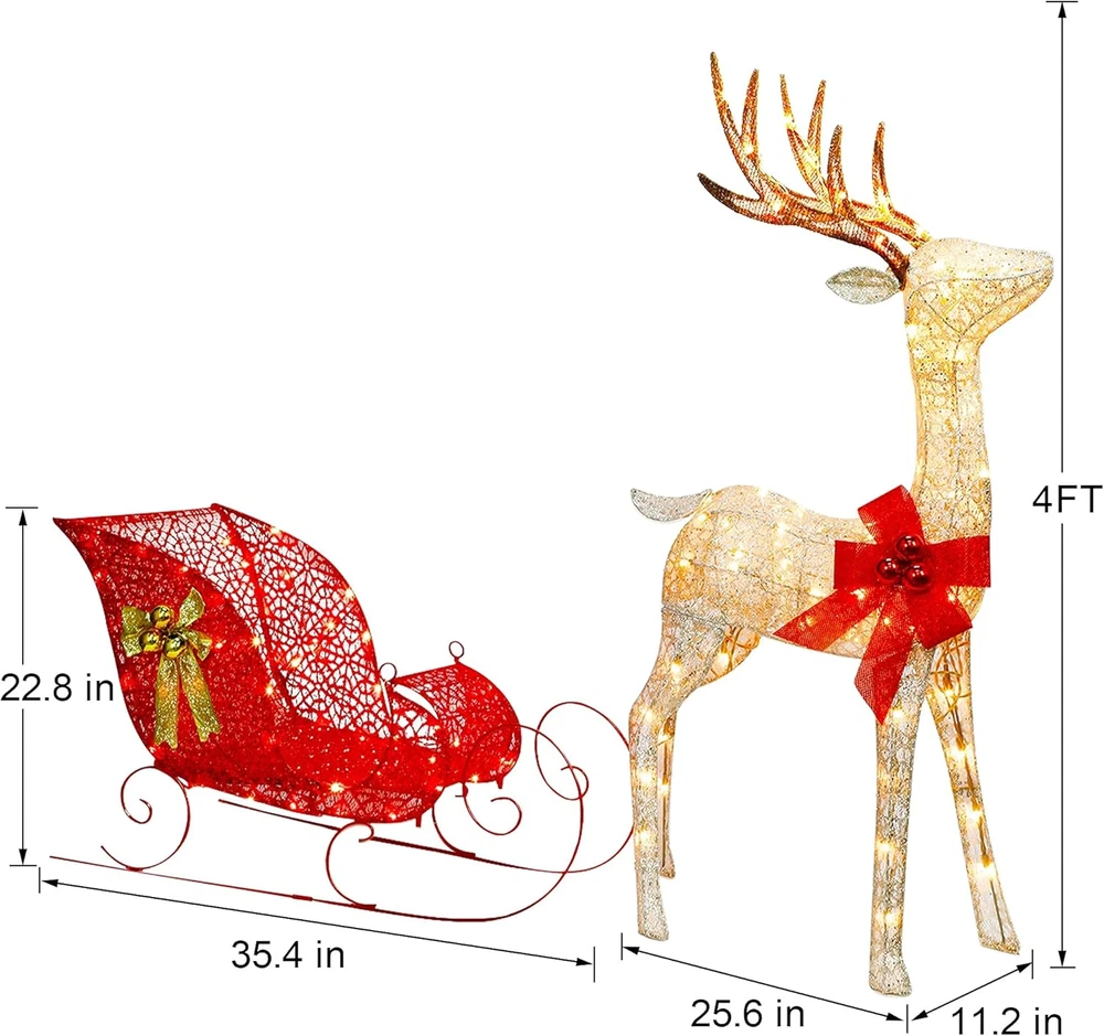 Christmas Yard Decoration, 4 FT Pre-Lit 3D Reindeer & Sleigh Outdoor Decorations