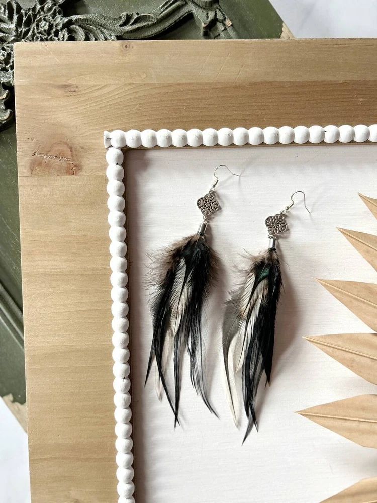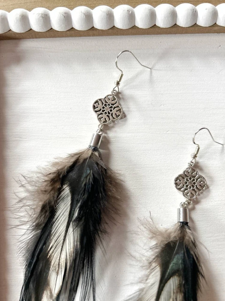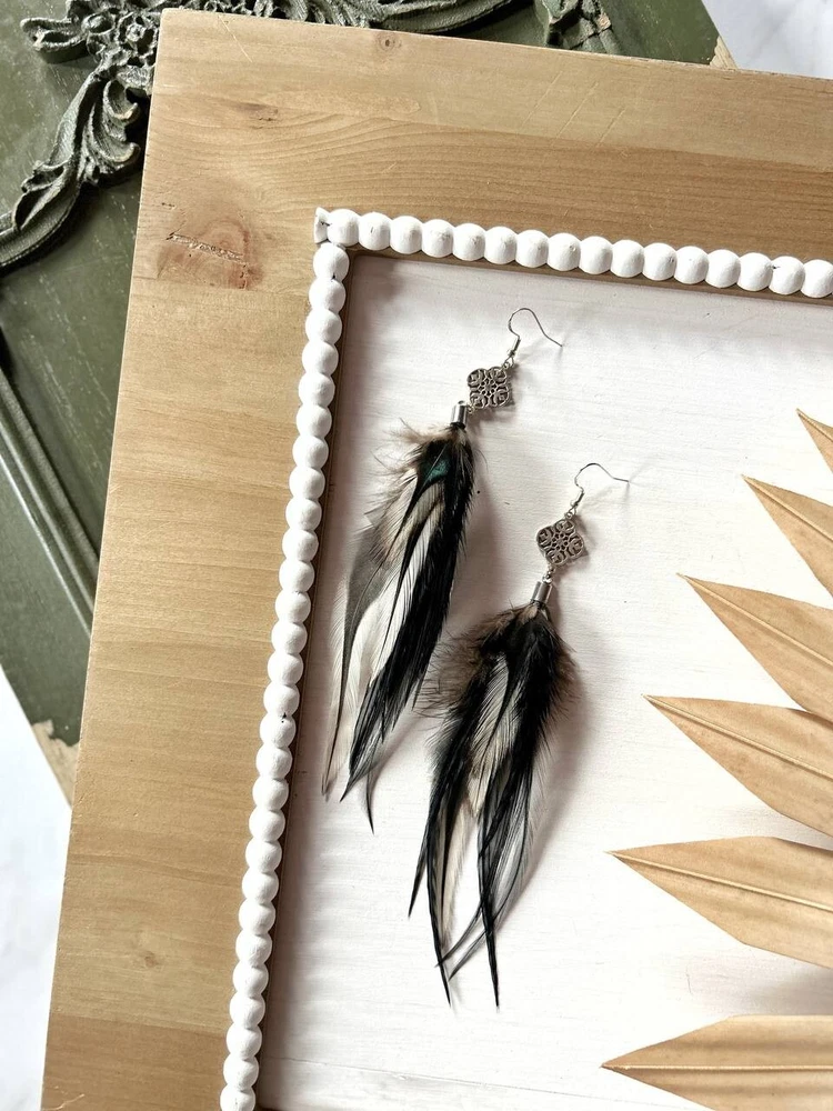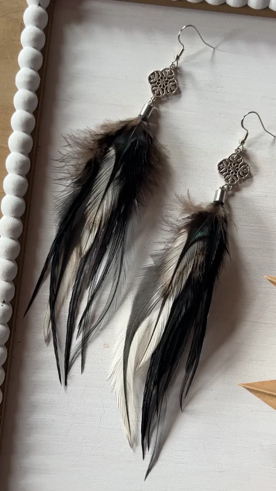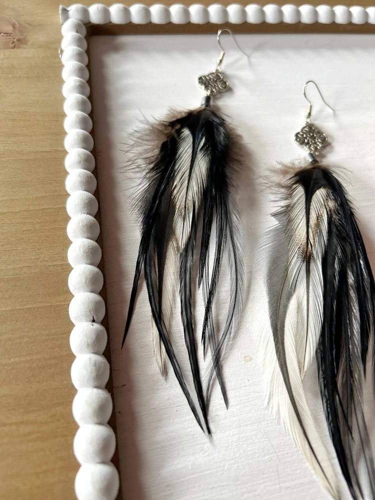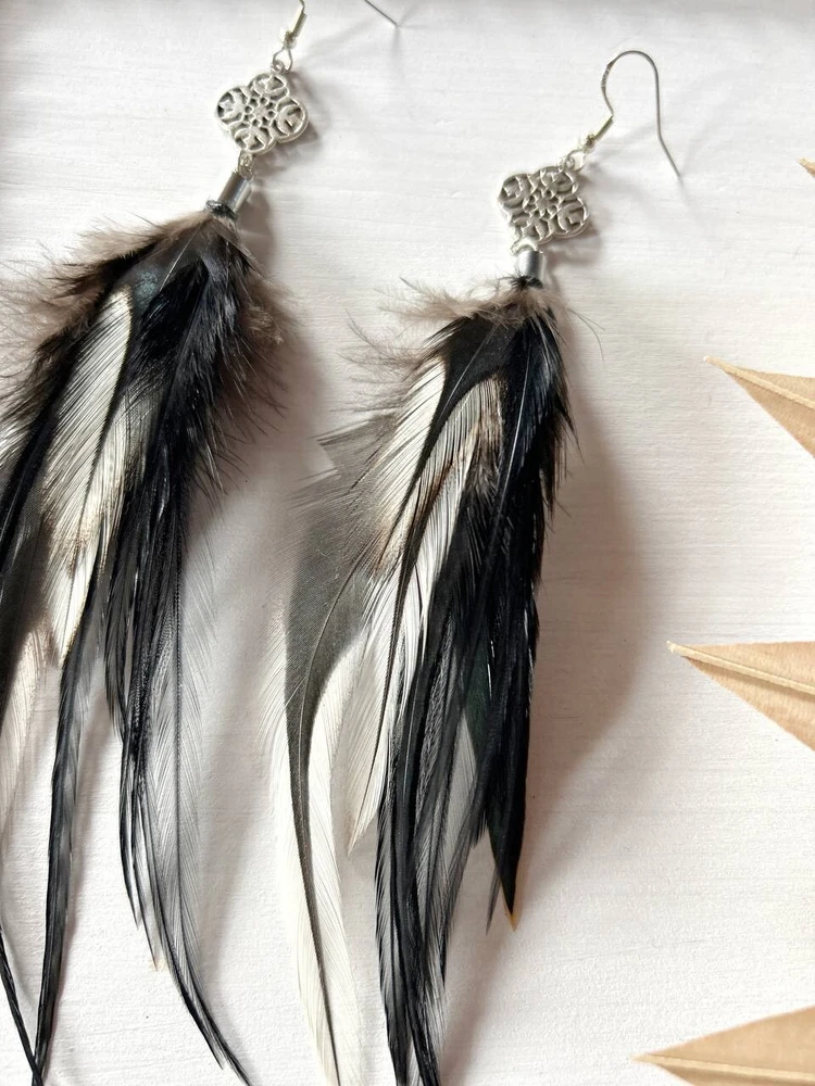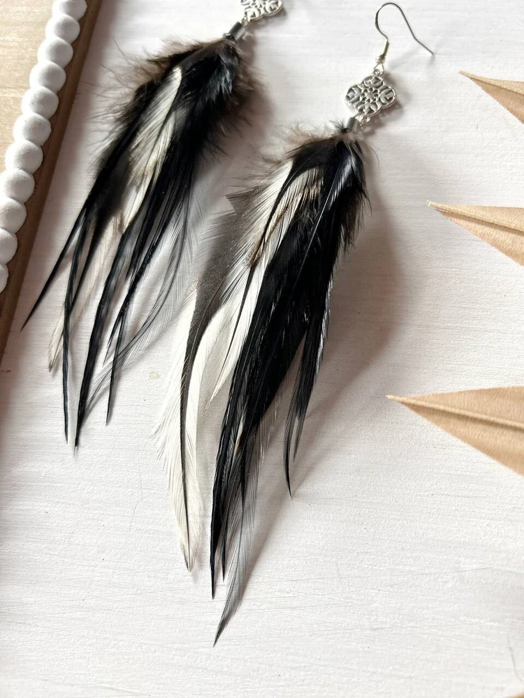 Color: Black Brand: Song Birds Theme: Art, Beach, Beauty, Bohemian, Fairytale & Fantasy, Fashion & Costumes, Travel & Places, Vacation Type: Earrings Department: Women Style: Tassel Metal: Silver Item Length: 17 cm Material: Feather Country of Origin: United States Closure: Hook