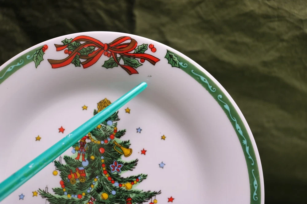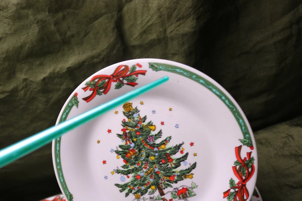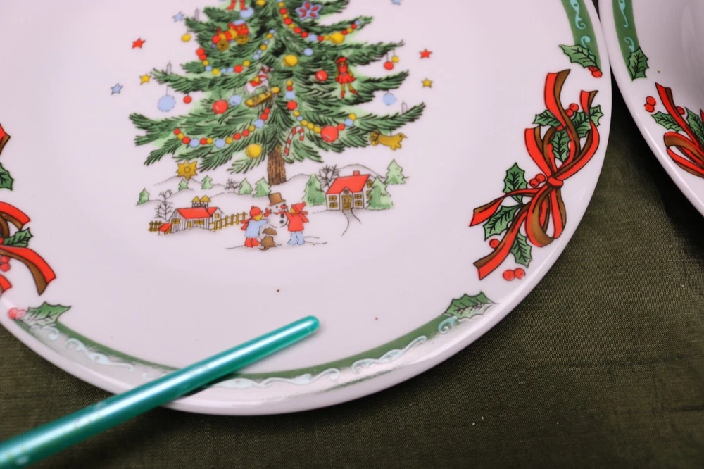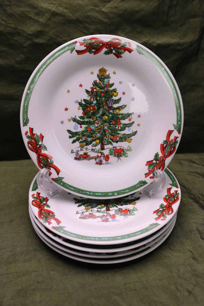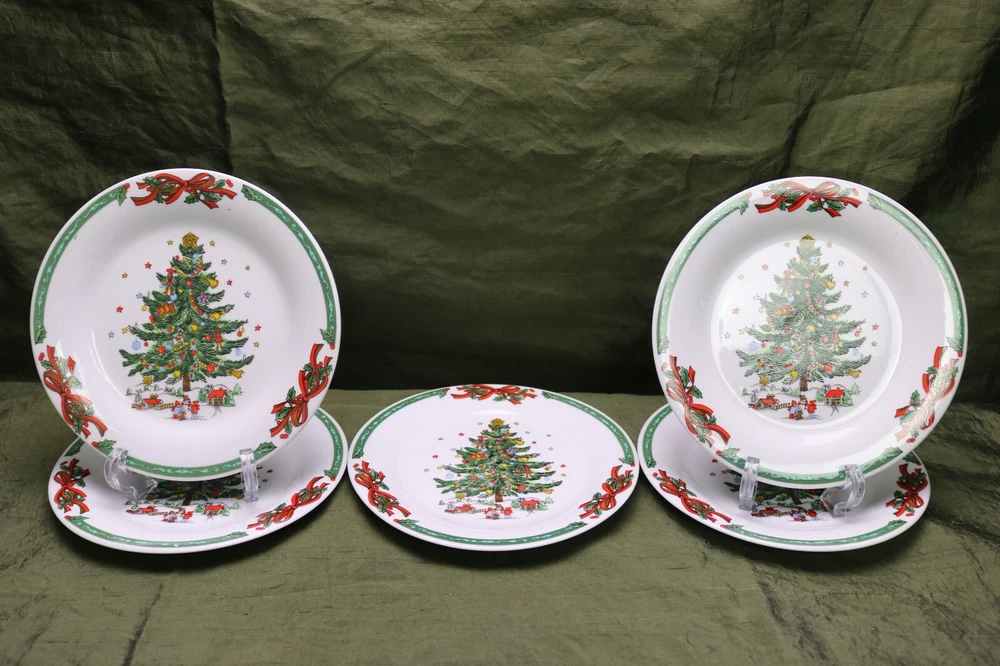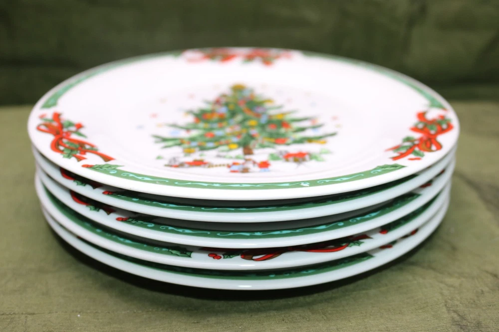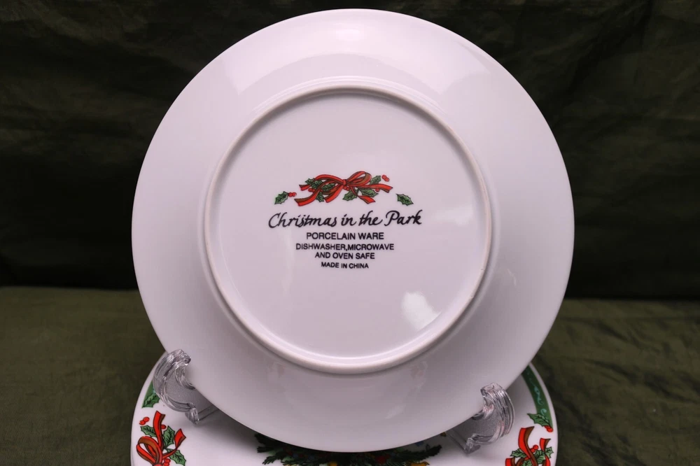 Set of 5 Holiday "Christmas in the Park" Salad Plates Made in China White porcelain, with green band near rim, green holly and red ribbon on border. Large central decorated Christmas Tree Measurements: (5) 7 1/2 " rim diameter, weighs 10.8 oz each Condition: Excellent, no chips, no cracks, bright colors, no utensil marks of normal use, no crazing, one plate has one smooth, black dot on white and one plate has two, smooth black dots on white, one plate has a spot of green paint on white. Thanks For Looking