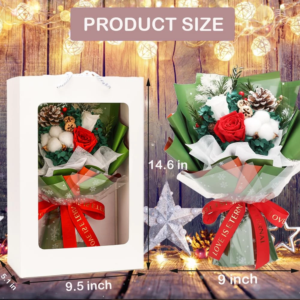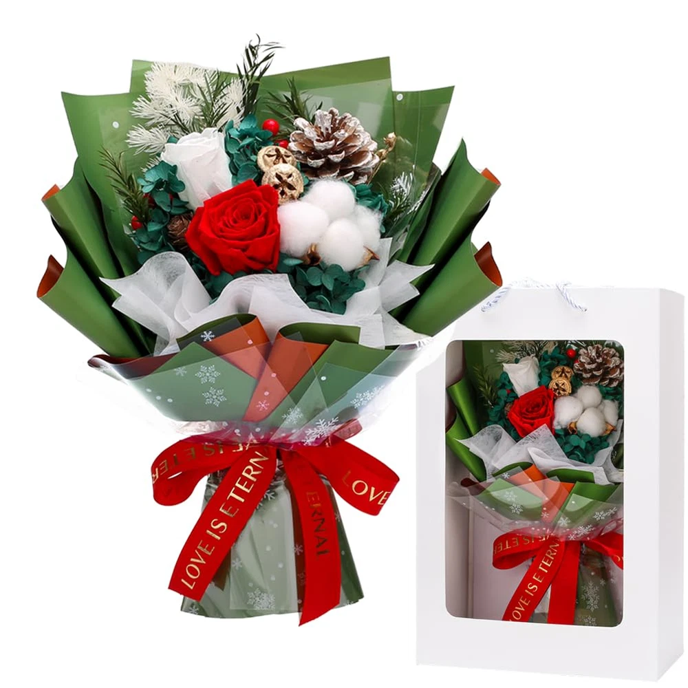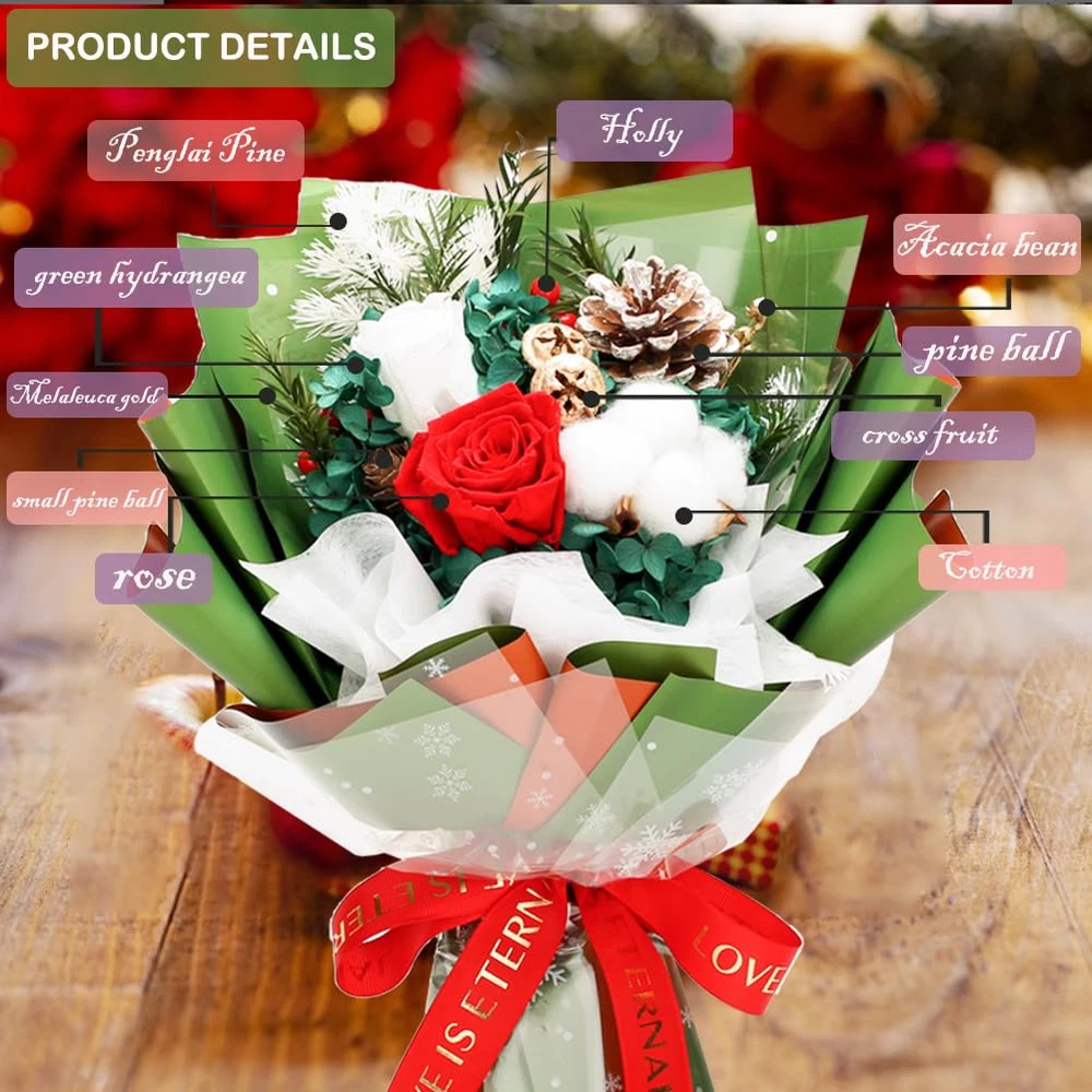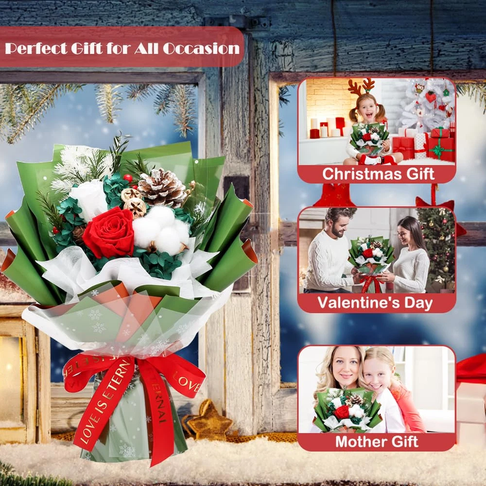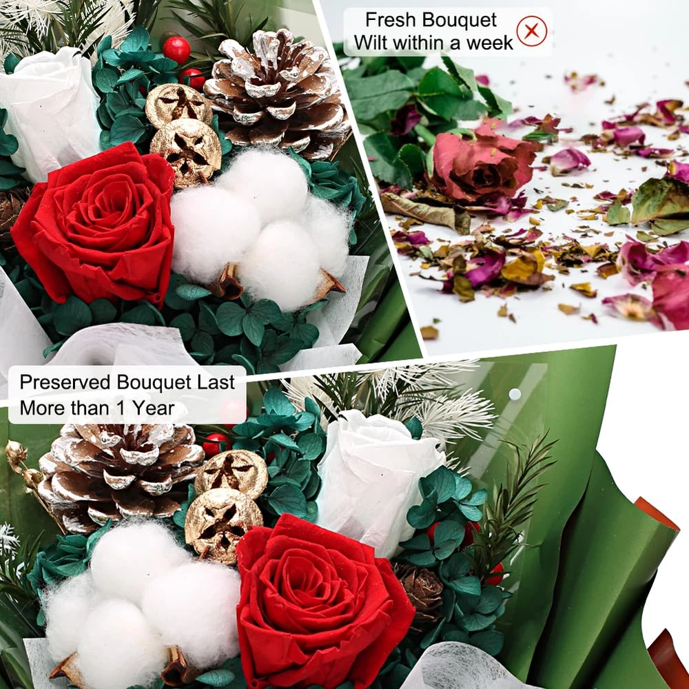 【Real Roses】The preserved flowers bouquets are crafted from high-quality A grade fresh real roses. The colors are so vibrant and the arrangement is gorgeous.These flowers undergo special preservation techniques that keep them fresh and vibrant, allowing them to be stored and used for over 3 years. 【Handmade Christmas-themed Bouquets】 Our flower bouquets are designed and hand made by skilled florists,which is elegant and beautiful,comes with Christmas spirit.These bouquets are handcrafted from Penglai Pine, cross fruit, green hydrangea, small pine ball, rose, Melaleuca gold Holly, pine ball, Acacia bean. 【Perfect Christma Gift for Christmas】The preserved flowers bouquet is perfect size with a beautiful gift box for many occasions, such as Christmas gifts, Thanksgiving gifts, Valentines day gifts, mother's gifts, anniversary gifts, friends gifts, graduation gifts, parties gifts, graduations gifts, wellness gifts,birthday gifts etc. This bouquet will be a constant presence throughout the year, accompanying her through all seasons. 【Lasting Forever Bouquet 】Our Festival Preserved Flowers exhibit timeless beauty.Handpicked at the peak of their beauty and preserved using cutting-edge techniques, unlike fresh flowers that wilt within a few days, this bouquet will grace your space with its charming allure for years to come. 【Maintenance Free】No water and maintenance.This bouquet will remain a delightful presence throughout the year if no expose to direct sunlight or damp conditions. Product Description Preserved Flower Bouquets Perfect gifts for Christmas,New Year's Day, Valentine's Day, Mother's Day, Teacher's Day, Thanksgiving Day birthday, wedding, anniversaries... Not only can you give it as a gift, but you can also use it as a decorative flower arrangement in your home. Preserved Flowers with Gift Box The package itself is a work of art. It arrives in a beautifully designed box or wrapping that enhances the anticipation and excitement of unwrapping a special gift. Flower Bouquet Real Rose Our meticulously preserved blooms capture nature's essence for months of elegance. From handpicked selections to delivery, our commitment to quality ensures a seamless experience. Add a touch of everlasting charm to your life with our preserved floral wonders. Additional Details about Ideal Christmas Bouquets Handmade Bouquets By picking carefully selected flowers and cutting them one by one, carefully arranging them to present a perfect bouquet. Easy to Maintain It arrives in a beautifully designed box or wrapping that enhances the anticipation and excitement of unwrapping a special gift. No water needed. Avoid placing the bouquet in direct sunlight. Avoid placing bouquets in damp or dry environments. Suitable for Most Festivals and Occasions Christmas Gift Christmas gifts for women Gifts for her Event decor bouquet Gifts for friends Valentine's Day Gifts Valentine's Day gift for girlfriend / boyfriend Valentine's Day gift for wife / husband Valentine's Day gift for her / him Anniversary gift for her / him Mother's Day Gifts Mother's Day gift for mom Mother's Day gift for grandmam Mother's Day gift for women Unusual mother's day gifts Birthday Gifts Birthday gifts for girlfriend / boyfriend Birthday gifts for wife / husband Birthday gifts for mom / dad Birthday gifts for her Perfect Preserved Flowers Bouquet for Your Love The preserved flowers bouquet symbolizes gratitude, eternal love, celebration, beauty and happiness!