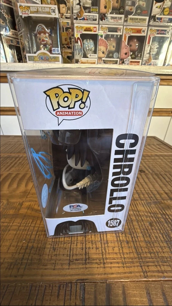 This Funko Pop! Vinyl collectible features Chrollo Lucilfer from the popular anime series Hunter x Hunter. The figure stands at 4 inches tall and is made of durable vinyl material. It is autographed by Robbie Daymond, the voice actor of Chrollo, and comes with a hard-signed autograph format. This item is authenticated by PSA and is a must-have for any Hunter x Hunter fan and Funko collector. It is a Funko exclusive item and is perfect for display or addition to any collection.