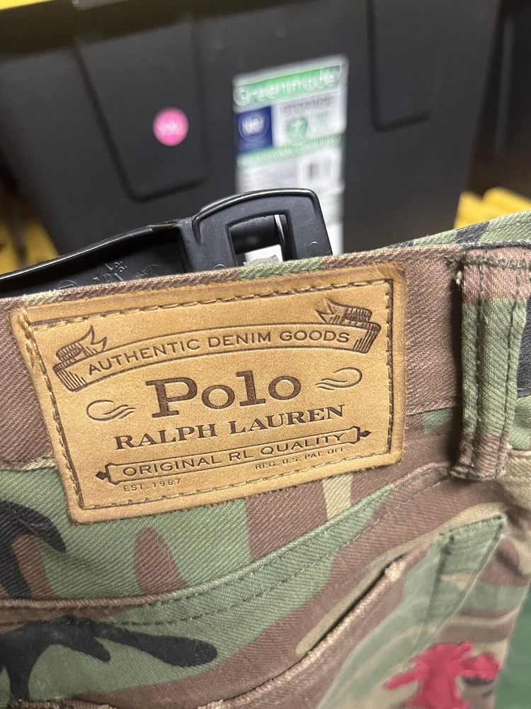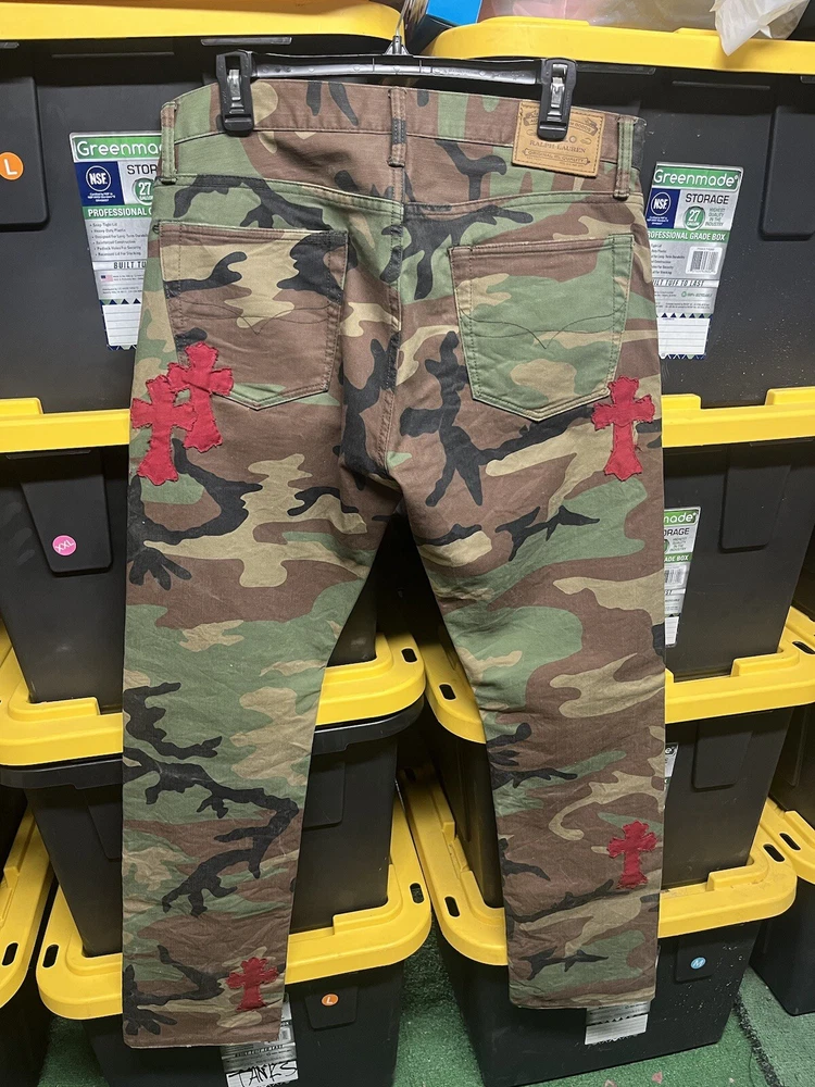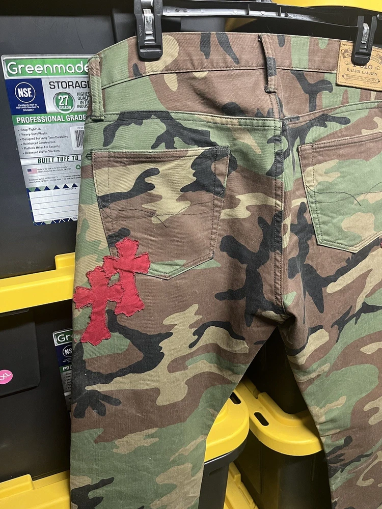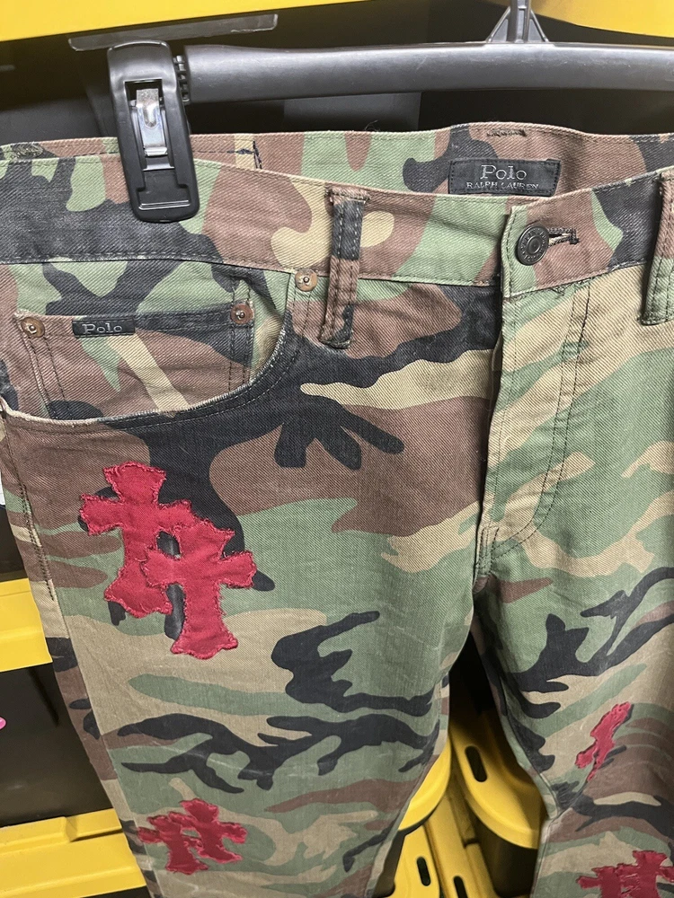 Elevate your denim collection with these custom, hand-stitched jeans, inspired by the iconic Chrome Hearts aesthetic. Crafted with care from premium cotton denim, these jeans feature a multicolor camouflage pattern that adds a bold touch to your everyday look. The classic straight-leg cut and 5-pocket design provide a comfortable fit, while the subtle logo accents offer a signature finish. Polo Ralph Lauren jeans in size 32x32 offer a regular fit for the modern man. With a machine-washable garment care, these jeans are as practical as they are stylish. The button closure ensures a secure and flattering fit around the waist, making them a versatile addition to your wardrobe.