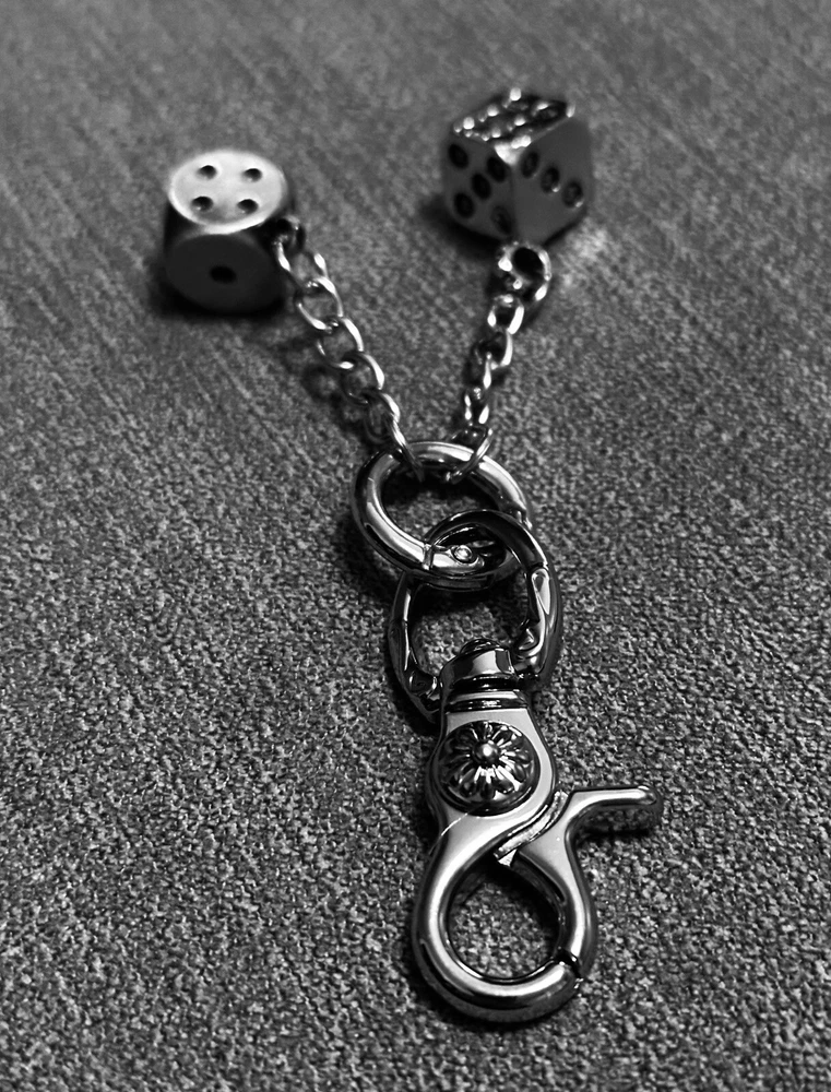 Chrome Hearts STYLE Clip & Dice Key Chain Lobster clip with 2 dice on link chain Can be used a keychain or luggage clip Stainless steel construction Measures around 6” in length