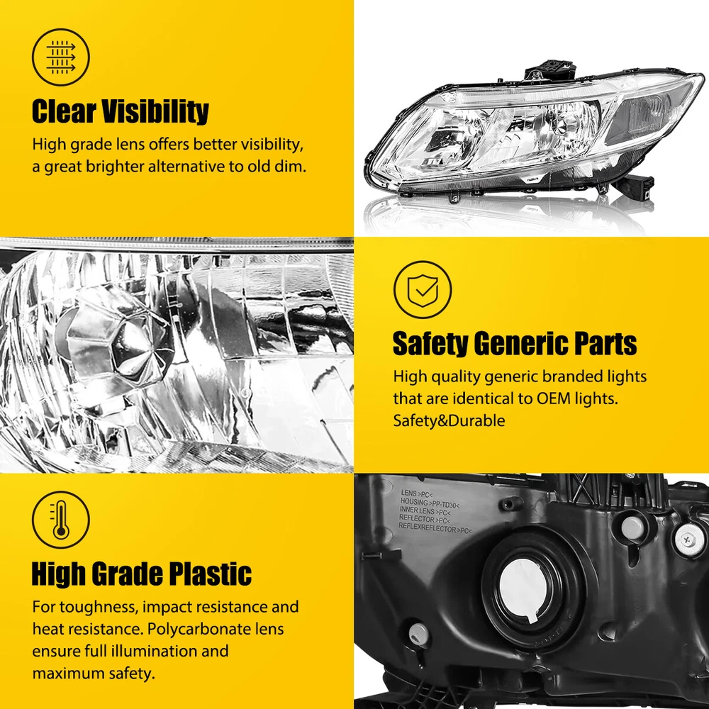 Fit for: 2012-2015 Honda Civic 4Dr Sedan 2012-2013 Honda Civic 2Dr Coupe Specifications: OE number: 33150TR0A01,33400TR0A01,33150TR2A01,331400TR2A01 HO2502144, HO2503144, HO2502150, HO2503150 Material: ABS+PC (ABS Plastic Housing/Polycarbonate lens) Appearance color: 1.Housing Color:Chrome 2.Lens Color:Clear 3.Reflector Color:White Note: Projector ×( Not Include) DRL × (Not Include) Bulb × ( Not include) Features: *Easy to install: Direct replacement, drilling and cutting are not required. Chrome Pair Headlights Assembly Lamp For 2012-2015 Honda Civic Sedan 12-13 Coupe Fit for: 2012-2015 Honda Civic 4Dr Sedan 2012-2013 Honda Civic 2Dr Coupe Specifications: OE number: 33150TR0A01,33400TR0A01,33150TR2A01,331400TR2A01 HO2502144, HO2503144, HO2502150, HO2503150 Material: ABS+PC (ABS Plastic Housing/Polycarbonate lens) Appearance color: 1.Housing Color:Chrome 2.Lens Color:Clear 3.Reflector Color:White Note: Projector ×( Not Include) DRL × (Not Include) Bulb × ( Not include) Features: *Easy to install: Direct replacement, drilling and cutting are not required. *Superior quality: Made of ABS and PC materials with toughness and heat resistance functions to ensure its long service life and durability. *Angle adjustment: Equipped with a headlamp Angle adjustment knob, you can adjust the best Angle of view through the knob. *Suggestion: 1.Please confirm the OE number before purchasing!!! 2.Professional installation is required!!! Packaging include: Headlights*2(Left+Right) Item Specifics Other Part Number HO2502144, HO2503144,HO2502145, HO2503145 High Beam Bulb Type 9005 Bulb (No Included) Bulbs Included No Fitment Type Direct Replacement Items Included Driver Side & Passenger Side Low Beam Bulb Type 9006 Bulb (No Included) Manufacturer Part Number F09W140001 Number of Bulbs 0 Turn Signal Bulb Type 7443 Bulb (No Included) Placement on Vehicle Front Left Right California Prop 65 Warning This product can expose you tochemicals including dehp, which are known to the State of California to cause cancer and birth defects or other reproductive harm. Brand AUXITO Bulb Shape Code 9005;9006 Type Headlight Assembly Interchange Part Number 33150TR0A01,33400TR0A01,33150TR2A01,331400TR2A01 Manufacturer Warranty 1 Year OE/OEM Part Number HO2503144 HO2502150 HO2503150 Housing Color Chrome Fits for 2 For 2012-2013 Honda Civic 2-Door Coupe Features DOT-Certified SAE-Certified Fits for 1 For 2012-2015 Honda Civic 4-Door Sedan Lens Color Clear Lighting Technology Halogen Superseded Part Number 33150TR0A01,33400TR0A01,33150TR2A01,331400TR2A01 Payment Returns DESCRIPTION PAYMENT SHIPPING RETURN POLICY CONTACT US Shop Category Store Home LED Headlight ◈ H4 ◈ H13 LED Reverse Light ◈ T15/921/W16W LED License Plate Light LED Side Marker Light Car Parts & Accessories Tail Light assemblies Other Hot Item Picture New List Item 4PC Smoked Lens LED Front Side Lamp Marker White For 2003-09 Dodge Ram 2500 3500 USD 15.99 Smoked Lens White LED Bumper Rear Side Marker Lights For 1993-2002 Chevy Camaro USD 22.29 Pair Halogen Headlight Set For 2011-2015 Chevrolet Chevy Cruze 4-Door Sedan EOV USD 113.99 For 2016-2018 Honda HRV HR-V Chrome Housing Headlights Assembly Left&Right Pair USD 145.99 For 2015-2020 Chevy Tahoe Suburban [OE Style] LED DRL Headlights Headlamps LH USD 139.99 Help & Info Payment Policy Shipping Policy Return Policy FAQ About Us Chrome Pair Headlights Assembly Lamp For 2012-2015 Honda Civic Sedan 12-13 Coupe Fit for: 2012-2015 Honda Civic 4Dr Sedan 2012-2013 Honda Civic 2Dr Coupe Specifications: OE number: 33150TR0A01,33400TR0A01,33150TR2A01,331400TR2A01 HO2502144, HO2503144, HO2502150, HO2503150 Material: ABS+PC (ABS Plastic Housing/Polycarbonate lens) Appearance color: 1.Housing Color:Chrome 2.Lens Color:Clear 3.Reflector Color:White Note: Projector ×( Not Include) DRL × (Not Include) Bulb × ( Not include) Features: *Easy to install: Direct replacement, drilling and cutting are not required. *Superior quality: Made of ABS and PC materials with toughness and heat resistance functions to ensure its long service life and durability. *Angle adjustment: Equipped with a headlamp Angle adjustment knob, you can adjust the best Angle of view through the knob. *Suggestion: 1.Please confirm the OE number before purchasing!!! 2.Professional installation is required!!! Packaging include: Headlights*2(Left+Right) Payment Returns All rights reserved. On Dec 17, 2024 at 12:03:06 PST, seller added the following information: