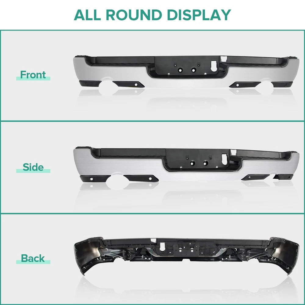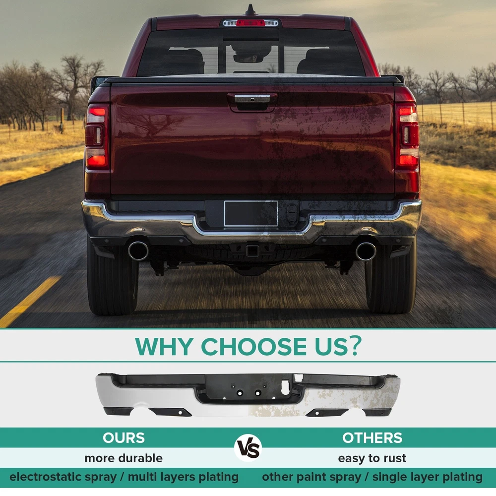 Specification Color: Chorme Dual Exhaust: With Dual Exhaust Sensor Holes: With parking aid sensor holes Finish: Chorme Material: Steel Type: Rear Bumper Placement on Vehicle: Rear Fitment Type: Vehicle Specific OE/OEM Part Number: 68404443AA, 68404443AB Partslink Number: CH1103147 Installation Instruction: Not Included Fitment 2019-2023 Ram 1500 Features & Benefits Product Description: 【FITMENT】Our Front Bumper is specifically designed to be compatible with 2019-2023 RAM 1500 models. Please note that it is ONLY compatible with models featuring Dual Exhaust + with Rear Parking Assist Sensor. 【Interchange Part number】This bumper can replace the following part numbers: 68404443AA, 68404443AB, CH1103147. 【Excellent Performance】Featuring non-slip steps, this Dodge Ram rear bumper ensures a safe and convenient entry and exit for your family. More than just a practical addition, it can absorb and slow down external impacts, protecting your vehicle and passengers during collisions and reducing the risk of injury. 【Quality Material】Constructed from high-quality steel and lightweight ABS plastic, this rear bumper offers exceptional durability against wear and rust. No additional drilling or cutting is required, and it also adds a touch of style to improve the overall aesthetics of your car. 【Easy Installation】Our front bumper is easy and quick to install as a direct replacement. The package includes: 1X Rear bumper, along with the necessary mounting brackets and screws. Please note that this product is intended for placement on the rear of your vehicle.