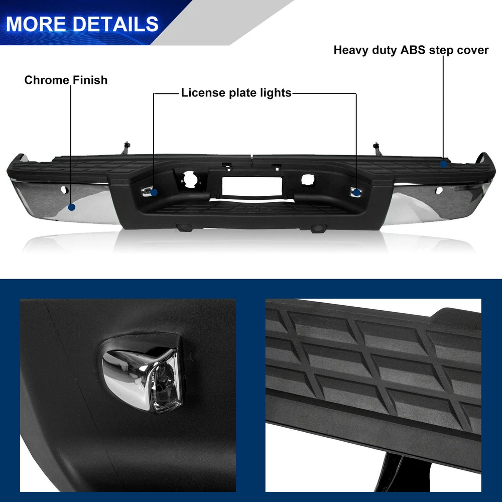 Feature Condition: 100% Brand New Material: Steel Color: Chrome+Black Surface Finish: Chrome Placement on Vehicle: Rear Number of package: 2 Replecement Number for: GM1103148 20899360-PFM With License Plate Lights Note:The picture shows the mounting bracket already installed on the bumper Fits For 2007-2013 Chevy Silverado 3500HD For 2007-2013 GMC Sierra 3500HD For 2007-2013 Chevy Silverado 1500 For 2007-2013 GMC Sierra 1500 Package Include 1x Rear Step Bumper Assembly