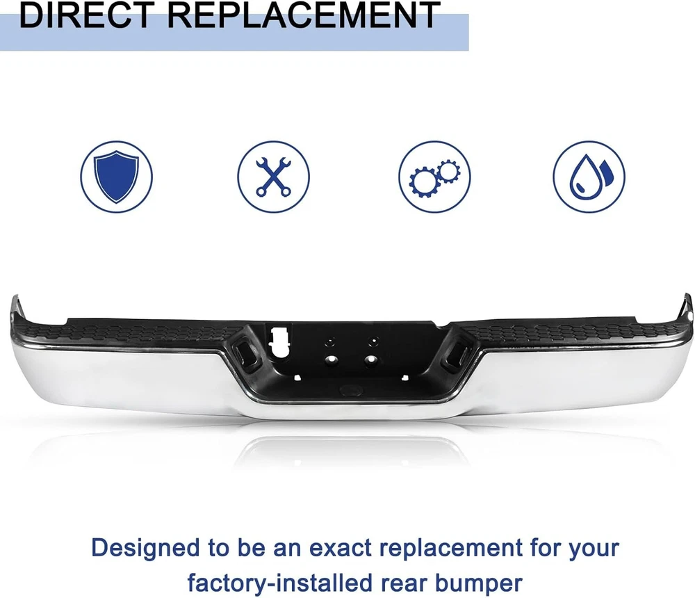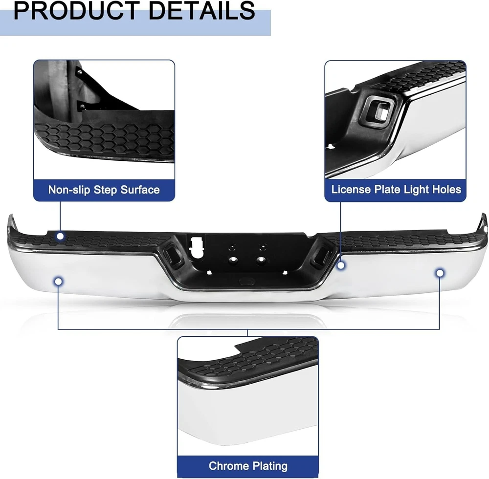 Specification Installation Instruction: Not Included Manufacturer Warranty: 1 Year Condition: New Package Weight(lbs): 39.02 Package Dimensions(LengthxWidthxHeight:inch): 77.76x16.93x12.60 Item Weight(lbs): 36.82 Item Size(LengthxWidthxHeight:inch): 77.76x16.93x12.60 Surface Finish: Chrome Description: 1. No cutting or drilling. Easy bolt-on installation with no relocation required. Instruction is not included. Professional installation is highly recommended. 2. Finished chrome process enhanced by pre-treatment to provide extreme resistance against rust Vent Hole: W/O Vent Hole Package Include: 1 X Rear Step Bumper, License Plate Lights, Bolts, Mounting Hardware, Screws Type: Direct Replacement Placement on Vehicle: Rear Material: Heavy Duty Steel & PP Color: Chrome,Black Parking Aid Sensor Hole: NO Fitment 2009-2010 Dodge Ram 1500 2011-2018 Ram 1500 2019-2019 Ram 1500 Classic Description 1. No cutting or drilling. Easy bolt-on installation with no relocation required. Instruction is not included. Professional installation is highly recommended. 2. Finished chrome process enhanced by pre-treatment to provide extreme resistance against rust and wear. 3. SUV/Car/Truck rear bumpers protect your car from rocks, tree roots and other obstacles. Save your a big fix fee in the body shop. 4. Anti-corrosion process to provide extreme resistance against rust and wear, prolong your rear step bumper service life. 5. Manufactured from heavy duty steel and high grade PP. Non-slip textured step pad, guarantee your standing stability. 6. Corner steps made from high quality steel and plastic for maximum strength and durability.