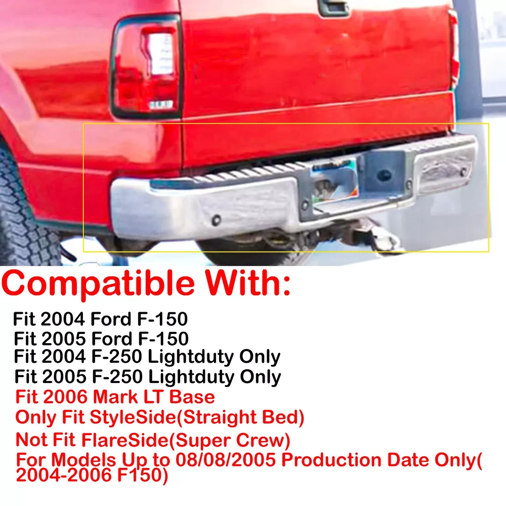 Product Chrome Rear Step Bumper Assembly fit 2004-06 Ford F-150 w/ Park Assist Holes Description Fitment: For 2005 F-150 King Ranch For Models With Rear Object Sensor Holes For 2004-2005 F-150 (submodel: Lariat, XL) For Models With Rear Object Sensor Holes For 2006 F-150 (submodel: Harley-Davidson Edition, King Ranch, Lariat, XL) For Models With Rear Object Sensor Holes, Production Date To August 8 2005 Specifications: Finish:Chrome Material:Steel Fitment Type:Direct Replacement Type:Step Bumper Parking Aid Sensor Holes:With parking aid sensor holes Partslink Number: FO1103120, FO1103128 Package Content 1x Pickup Rear Bumper 1 x Set of License Plate Lamp with Harness Some Bolts and Screws Payment We accept PayPal payment ONLY, it is easy and safe. Payment should be sent within 7 (SEVEN) days of auction closing. All winning bidders whom won our item, please let me know your contact number after you made the full payment , we need this number to make sure you can receive your item in time, and also for emergency contact consideration. Feedback IMPORTANT INFORMATION ON OUR POLICY AND FEEDBACK Please leave me FIVE STAR POSITIVE feedback if you are satisfied with our items. We try to be fair and accurate with all of our product listings and descriptions. Please read each auction, bid, and sale carefully. We will appreciate it if you please email us before leaving negative feedback. If there is a problem, we can work together to resolve it. We strive to always be extremely fair and always try to work with reasonable customers. Negative feedback doesn't go away and should only be left as a last resort! We strive for positive feedback, harmonious relations and even friendships. We will always make every attempt possible to resolve issues if we made a mistake.(It happens). Please do not assume a mistake is intentional. Let us know if our service could be better!! Shipping International Shipping to worldwide. Handling within 24 business hours. Tracking info of your parcel is available. Returns could be accepted within 30 days after receipt of the item. Import duties, taxes and charges are not included in the item price or shipping charges. These charges are the buyer's responsibility.Please check with your country's customs office to determine what these additional costs will be prior to bidding/buying. It usually takes 15-45 business days to arrive by economy international shipping and 7-12 business days by express. The following form is for your reference. Returns Returns could be accepted within 30 days after receipt of the item Terms of Sale: Refund or replacement request is available only the requests within 1 week after parcel received & returning the item as the same condition as received. Please contact us to request a return authorization. Your name, auction number, and reason for return should be included in the email. All items returned must contain all original packaging materials.Please repack the item carefully. Items returned will be tested and a new replacement will be shipped to the buyer immediately when found defective. In the event that a suitable replacement is not available then a refund will be issued. Shipping, handling and insurance fees are non refundable. If the item is found non-defective, the item will be sent back to the buyer at buyer's expense. Items returned without RMA number will be refused and returned to the sender. Buyer is responsible for All Return Postage and Shipping Charges. Buyer is responsible for additional shipping costs for items that are returned refused and / or undeliverable. We do not accept any returns without an authorization number on the box or label it is being returned. Contact us We will reply all messages within 24 business hours and we are able to give you a quick response during the duty time. If we are off duty, please kindly be patient and give us a little more time, not just leave the neutral or negative feedback without communication. Every problem will be solved ASAP if you contact us! On Dec 29, 2024 at 18:22:42 PST, seller added the following information: On Dec 29, 2024 at 19:12:12 PST, seller added the following information: