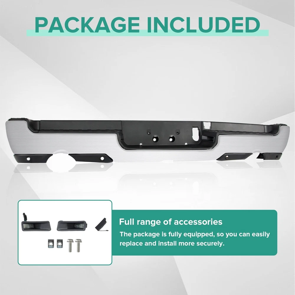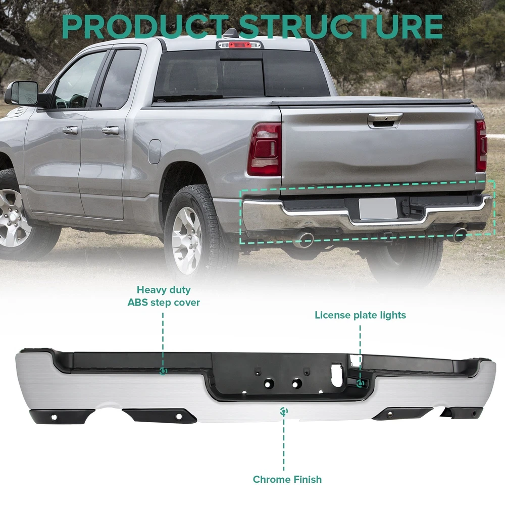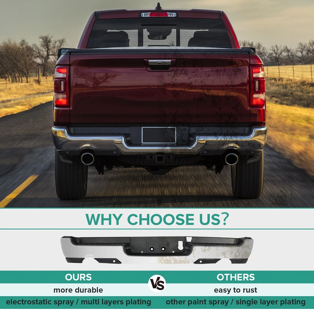Chrome Rear Bumper for 2019-2024 Ram 1500 Upgrade Your Ram 1500's Rear Profile with Our Chrome Rear Bumper Product Specifications: Color: Chrome Dual Exhaust: With Dual Exhaust Sensor Holes: With parking aid sensor holes Finish: Chrome Material: Steel Type: Rear Bumper Placement on Vehicle: Rear Fitment Type: Vehicle Specific OE/OEM Part Number: 68404443AA, 68404443AB Partslink Number: CH1103147 Installation Instruction: Not Included Fitment: Compatible with 2019-2024 Ram 1500 (models featuring Dual Exhaust and with Rear Parking Assist Sensor) Features & Benefits: Vehicle Specific Fitment Our Chrome Rear Bumper is specifically designed for the 2019-2024 Ram 1500 models, ensuring a perfect fit and seamless integration with your vehicle's rear end. It is only compatible with models featuring Dual Exhaust and with Rear Parking Assist Sensor. Interchange Part Numbers This bumper can replace the following part numbers: 68404443AA, 68404443AB, CH1103147. This makes it a versatile and cost-effective upgrade for your vehicle. Excellent Performance Featuring non-slip steps, this rear bumper ensures a safe and convenient entry and exit for your family. More than just a practical addition, it can absorb and slow down external impacts, protecting your vehicle and passengers during collisions and reducing the risk of injury. Quality Material Constructed from high-quality steel and lightweight ABS plastic, this rear bumper offers exceptional durability against wear and rust. The combination of materials ensures that it is both robust and stylish, improving the overall aesthetics of your vehicle. Easy Installation Our rear bumper is designed for easy and quick installation as a direct replacement. The package includes: 1X Rear bumper, along with the necessary mounting brackets and screws. No additional drilling or cutting is required, making the installation process hassle-free. Upgrade Today Invest in our Chrome Rear Bumper for your Ram 1500 and enjoy enhanced protection, perfect fitment, and superior quality. This premium accessory not only enhances the look of your vehicle but also adds a layer of protection. Customer Support We stand behind the quality of our products. If you encounter any issues, our customer support team is ready to assist you within 24 hours. We are committed to providing you with the best possible service and support. Product Details: Material: High-quality steel and ABS plastic Finish: Chrome Fit Type: Vehicle Specific for 2019-2024 Ram 1500 Upgrade Your Vehicle's Rear End Don't settle for less. Elevate your Ram 1500's rear end with our Chrome Rear Bumper and make a statement with its distinctive design and superior durability. Experience the difference in both aesthetics and functionality with this premium accessory. Contact Us If you have any questions or need assistance, feel free to reach out. We are here to help you every step of the way.