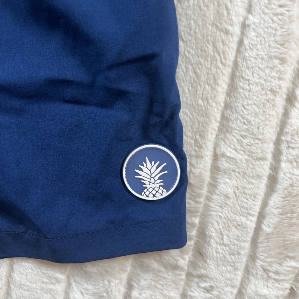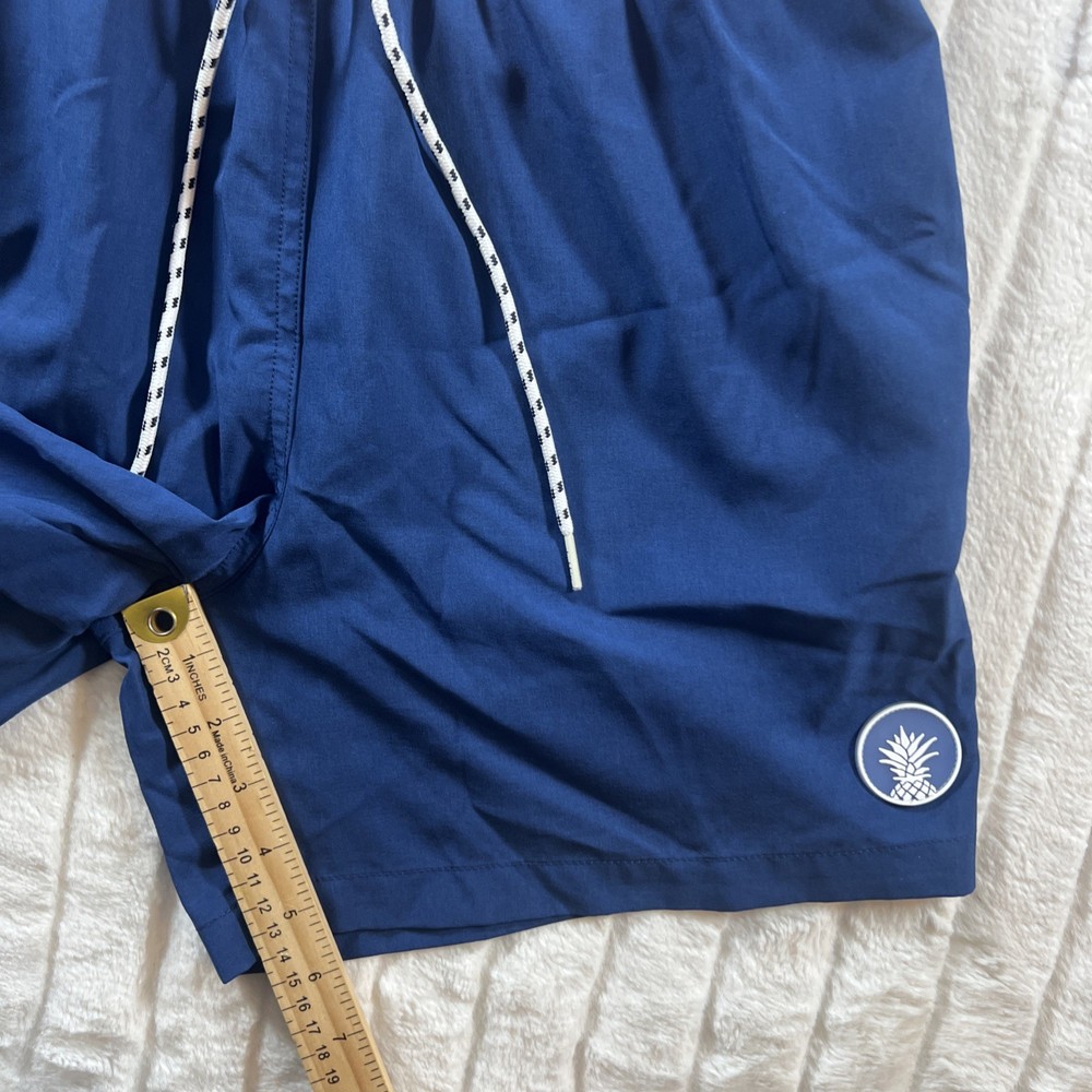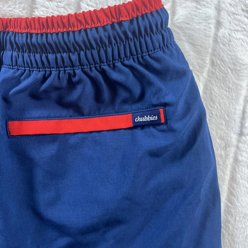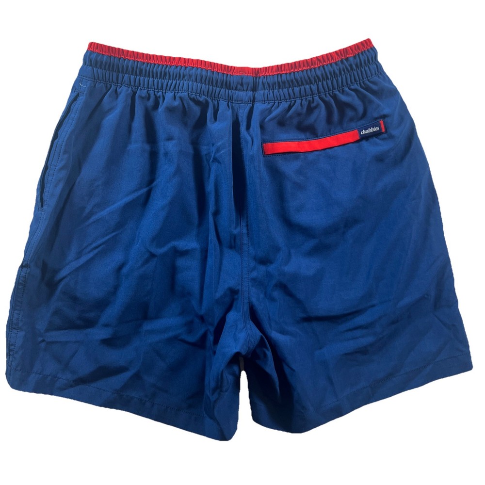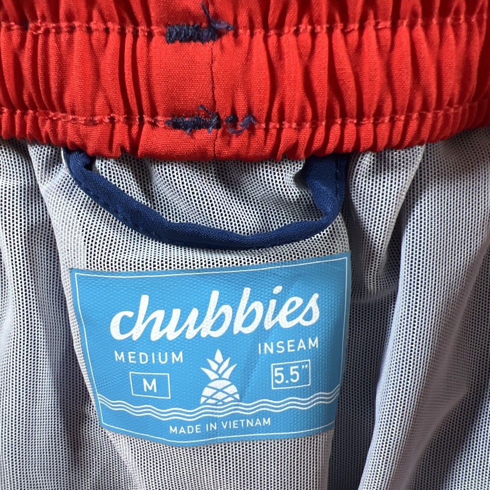The Chubbies Swim Trunks Shorts for men in size medium are a stylish and fun choice for the beach or pool. With a colorful blue and red pineapple logo, these shorts feature a lining, elastic waist, and drawstring for a comfortable fit. The trunks style and above-the-knee length make them ideal for recreational activities in the water. Made from 100% nylon and 100% polyester, these Chubbies shorts are durable and perfect for a day of fun in the sun.