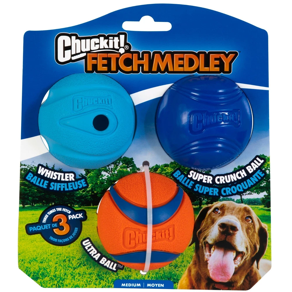 Chuckit! Fetch Medley Triple Pack Balls, Dog Toy, Medium Crunch Ball is durable and makes an engaging crunch sound to satisfy a dog’s curiosity. Ultra Ball is lightweight and bouyant. Whistler Ball is high bouncing and produces a whistle sound as the ball soars through the air. Made of high-quality recycled rubber materials Natural or recycled rubber material that are durable and long lasting. Designed especially for the game of fetch. Easy to clean.