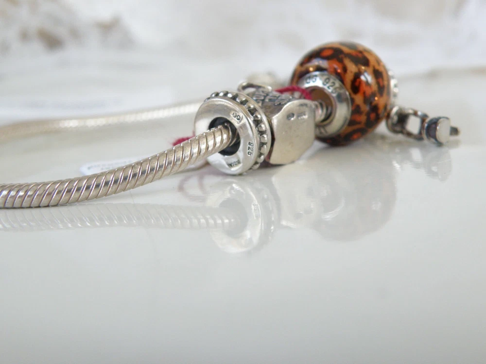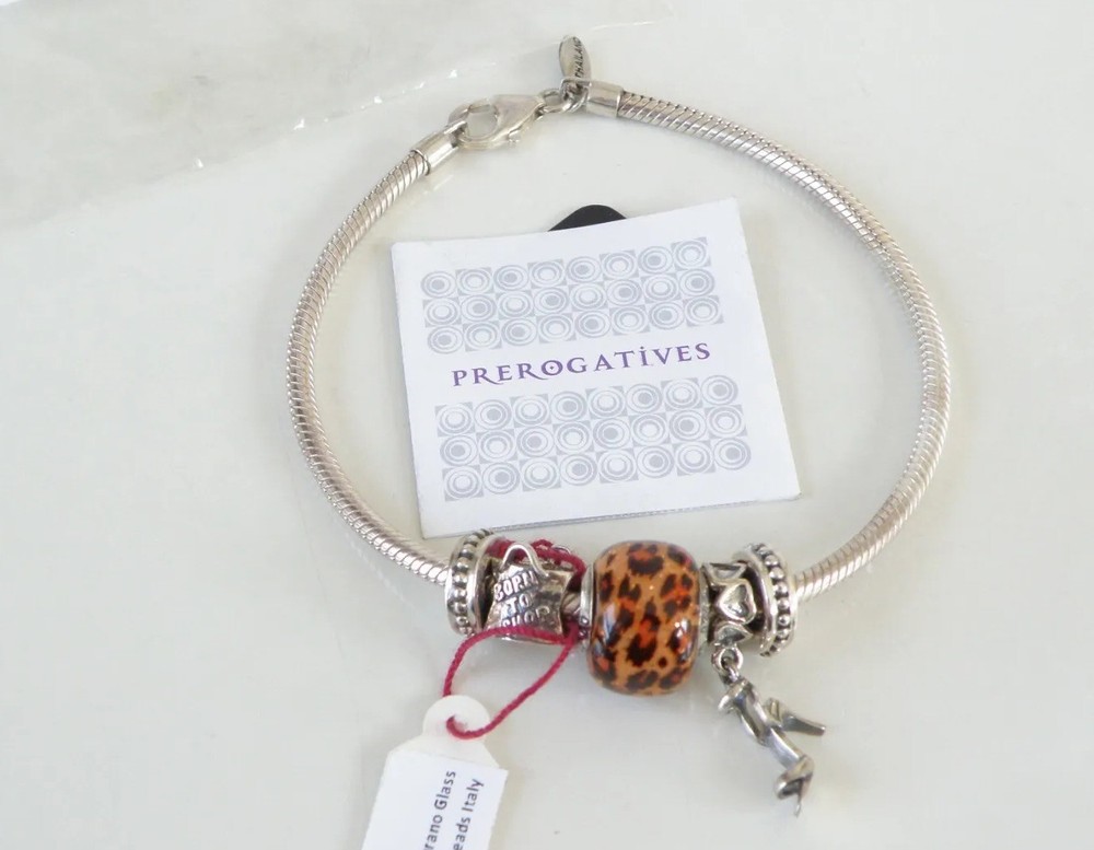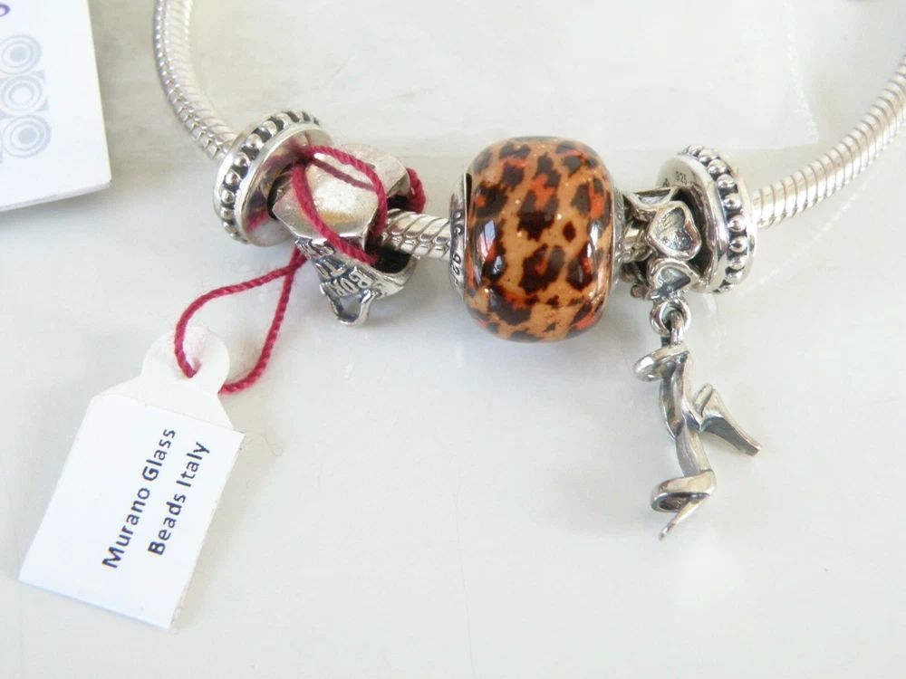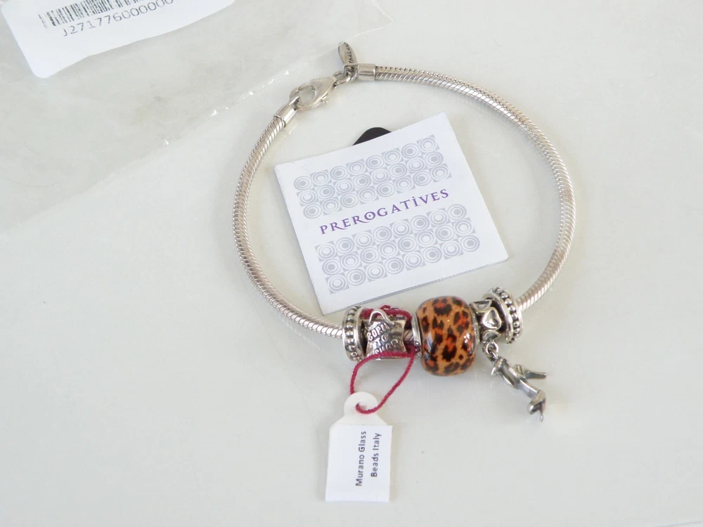 Life is strung together by the moments that define us. Bracelets like these tell your story. This particular bracelet is a shopping theme with the shoe and 'Born to Shop' sterling beads, and leopard print Murano glass bead. Comes with 2 stoppers. WEIGHT: 23.6 grams - chunky MEASURES APPROX: 8.5" long Charms measure approx. 14.3-mm for the largest - the leopard print Murano glass charm All are marked 925 for sterling silver with 'QG' for the maker's mark