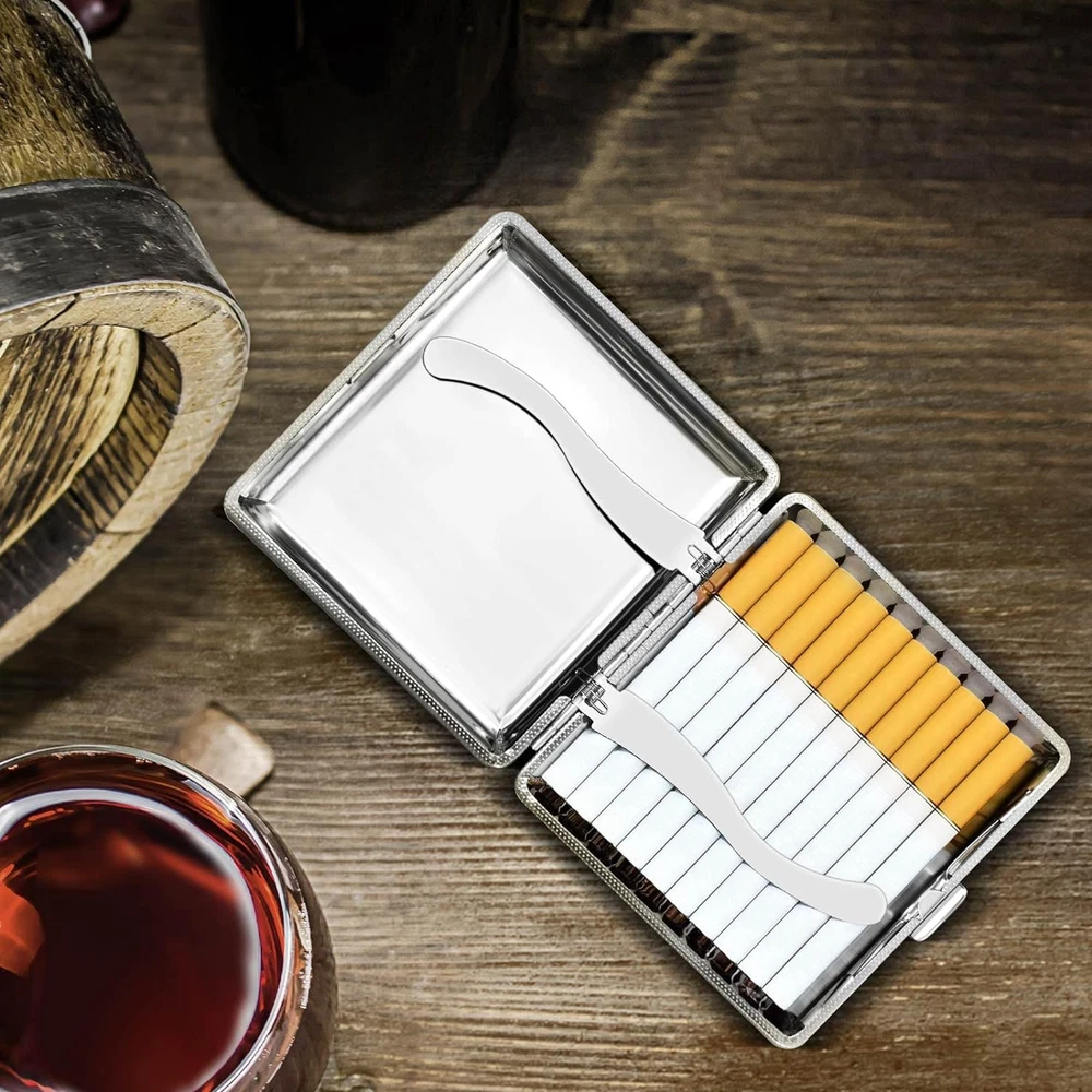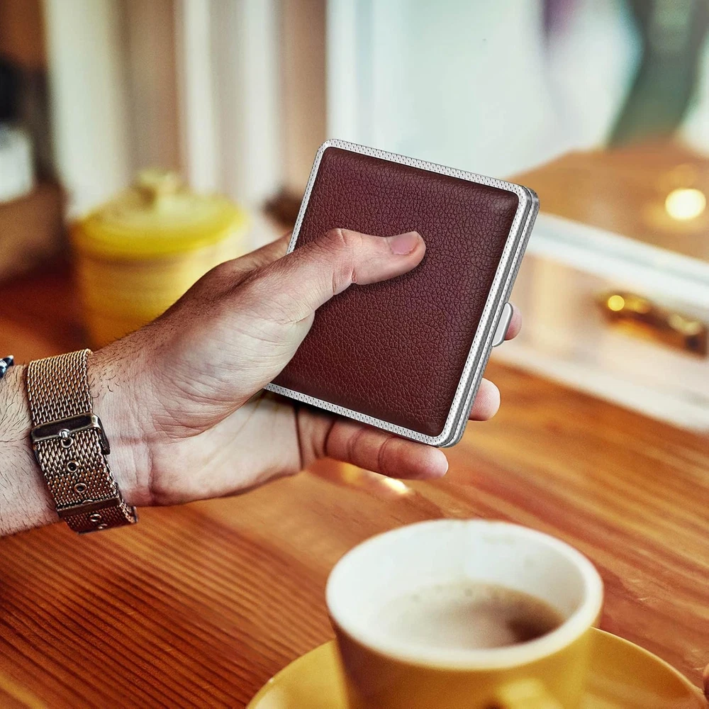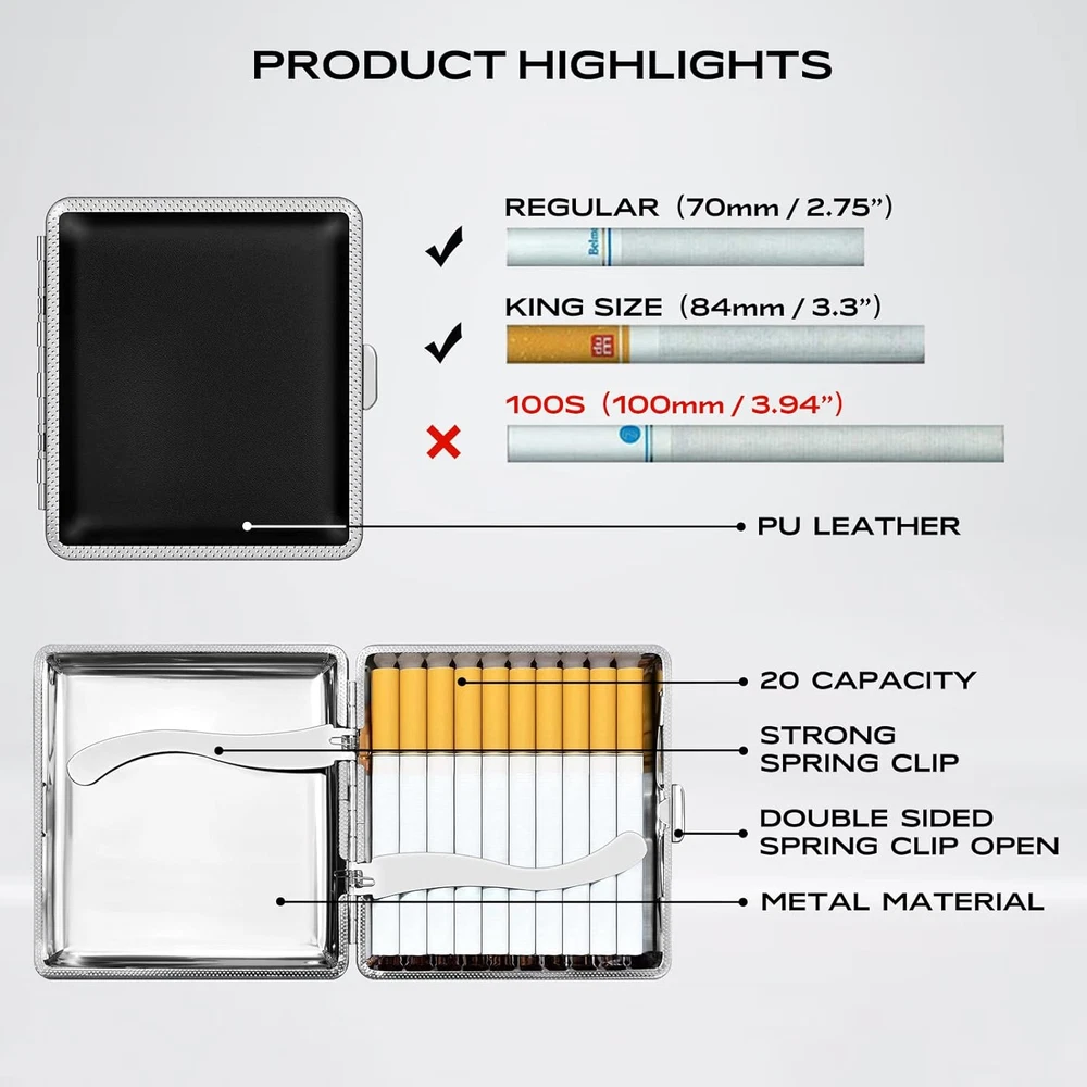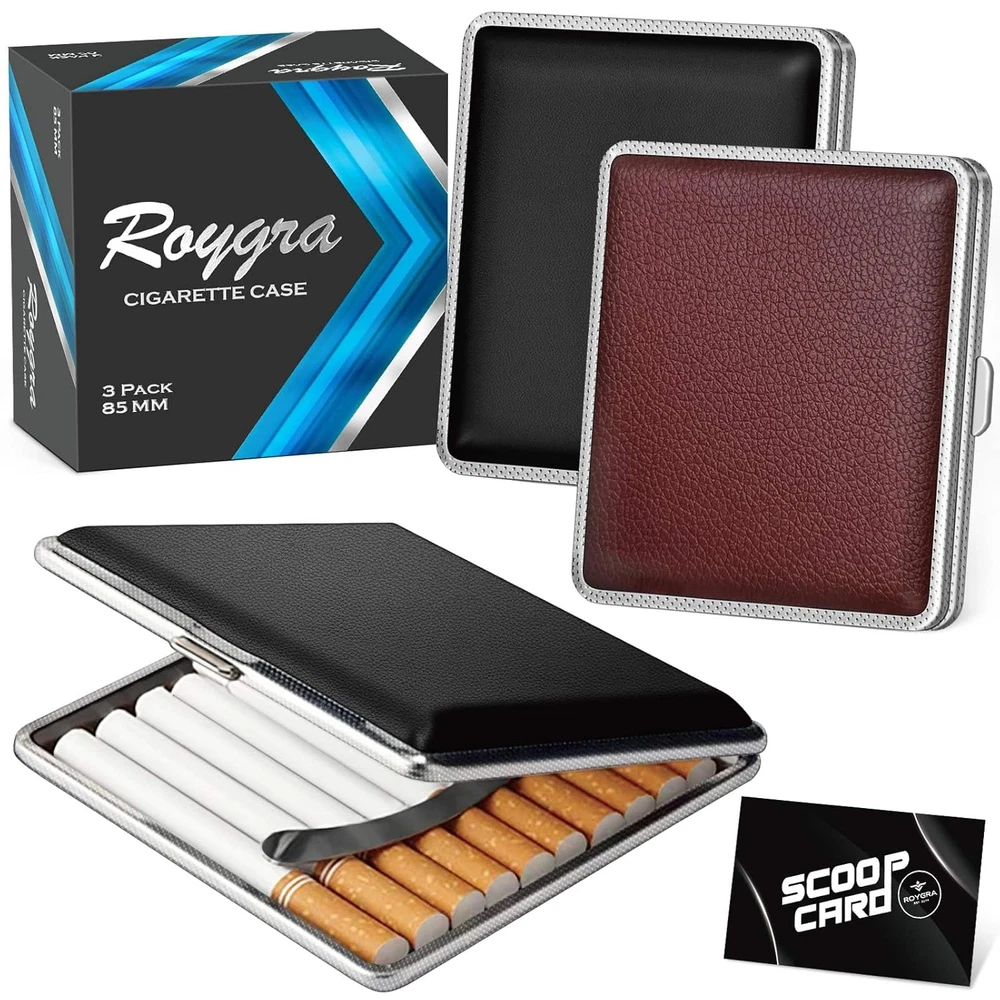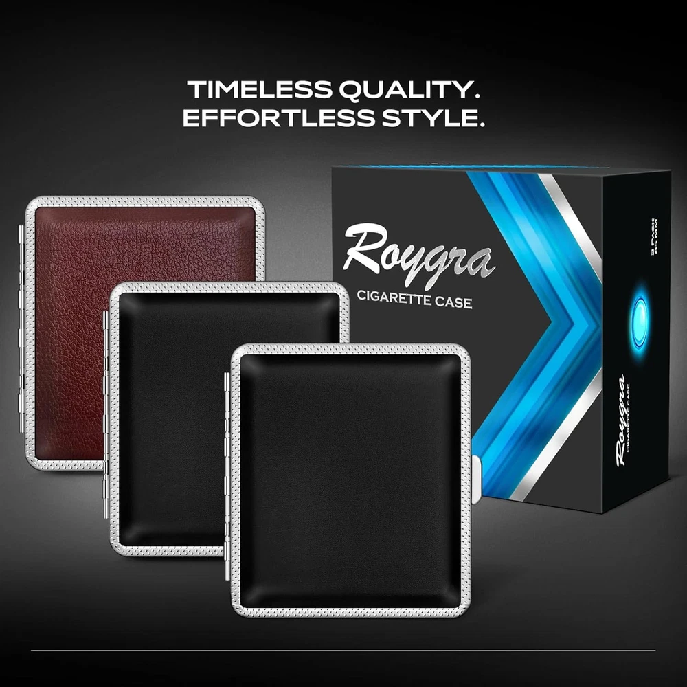 INCLUDE CONTENT - Get 3 cigarette case (packaged in exquisite gift box), suitable for personal use and gift giving. QUALITY MATERIALS - Exterior is made of PU leather and the interior is made of metal, surface is very smooth and the structure conforms to ergonomics. APPLICABLE SIEZ – Suitable for Regular or 85mm King Size. Can not fit 100S or 120mm cigarettes. DESIGN HIGHLIGHTS - Moisture and pressure prevention, can hold 20 cigarettes. Using mechanical switches, double sided spring clip open. APPLICABLE SCOPE - Roygra cigarette case can be used in patio, homes, offices, outdoors, balconies, bars, cafes, hotels, and more. Product Description