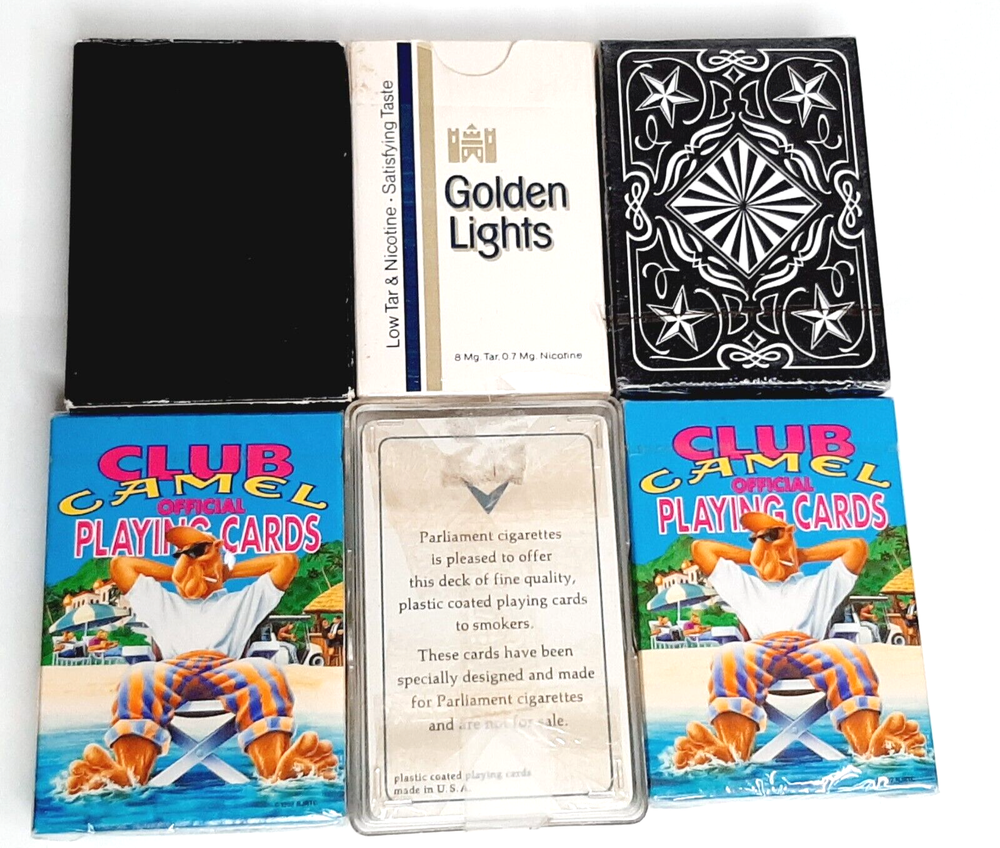 Cigarette Smoking Playing Cards Bundle Lot of 6 Tobacciana Decks Camel, Marlboro Condition varies by deck with most being in good shape; box exteriors may show signs of wear including small rips; may have minor damage from price tags or partial price tags that can be removed at your discretion; some cards may have a little "stick" to them; most open decks have been counted but there is always a very small possibility of a missing card