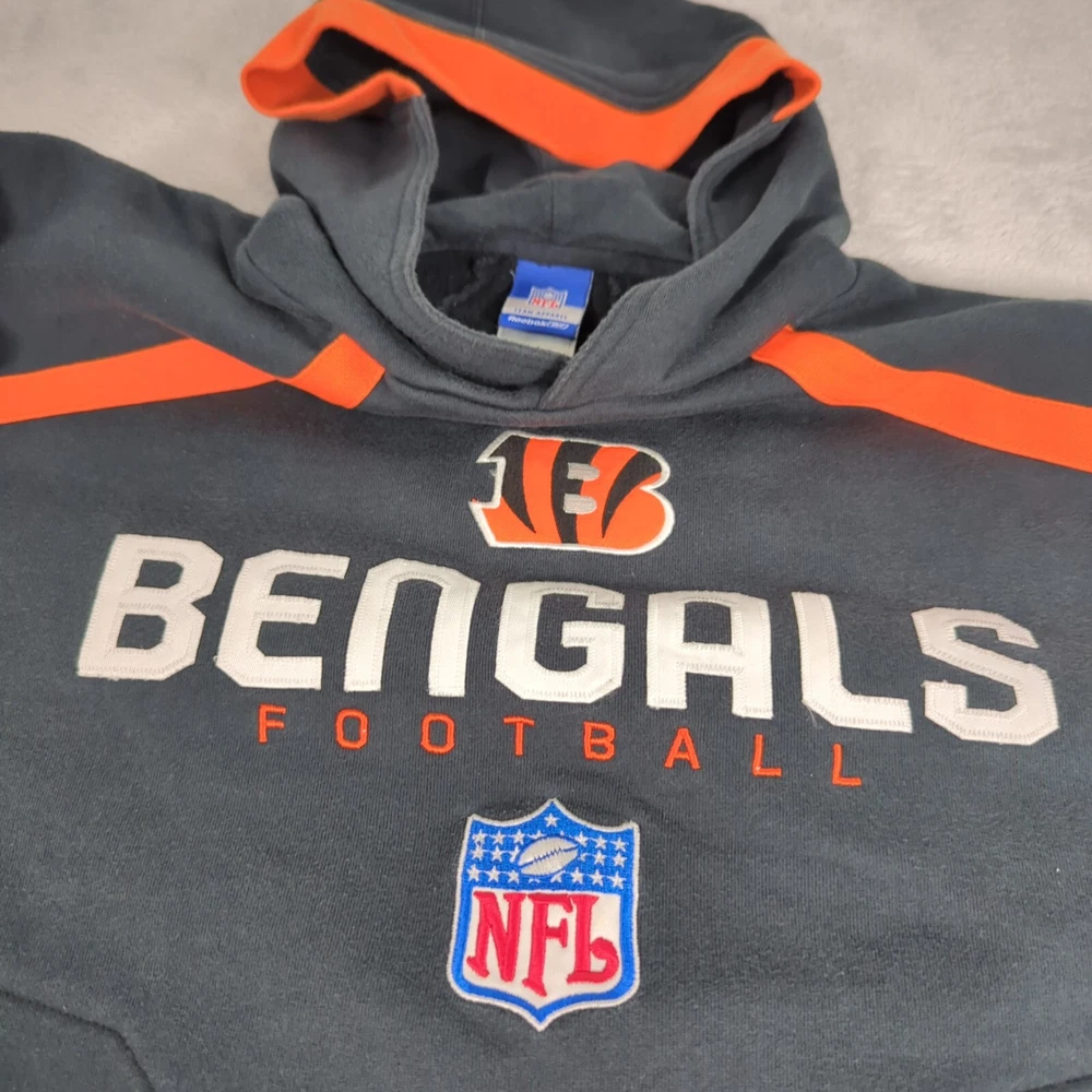 Show your love for the Cincinnati Bengals with this NFL Reebok sweatshirt hoodie. The gray pullover features a graphic print of the team's logo and is made of a comfortable and breathable knit fabric, perfect for any season. The hoodie comes with a hood, long sleeves, and pockets for added convenience. Description may be generated by AI. · Ships within 24 hours · Free 30 Day Returns · Contact us via message for prompt resolution with any issue