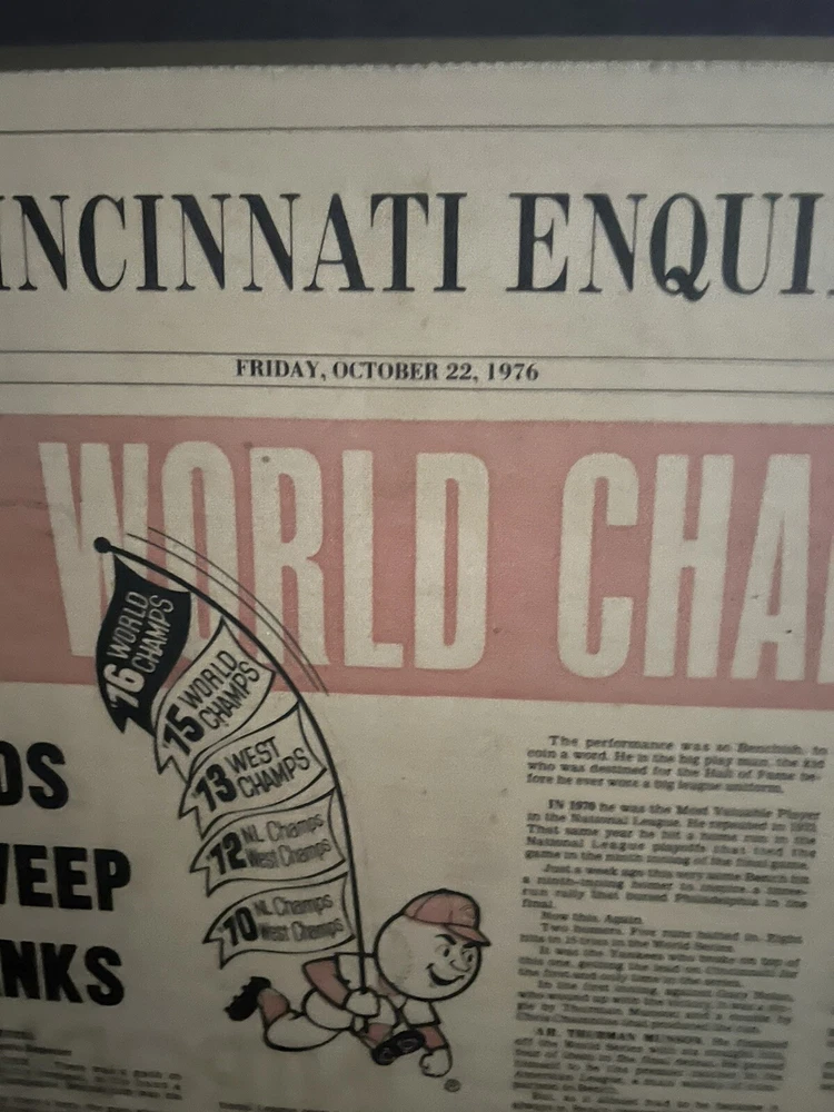 Cincinnati Reds Vintage Sports Memorabilia Laminated And Mounted Enquirer 1976. Professionally laminated and mounted by American Laminating Company Cincinnati is a page from the Sports section of The Cincinnati Enquirer dated Friday, October 22, 1976 Price 15 c titled “Still World Champs!” Reds sweep Yanks. This is in good condition considering age with yellowing and some holes in the paper at the bottom and not on the wording itself from a previous wall hang before mounting. Please see pictures. This would make a great gift for a sports enthusiast, collector, man cave, bar the list goes on and on. Overall measurement 17” x 28”.
